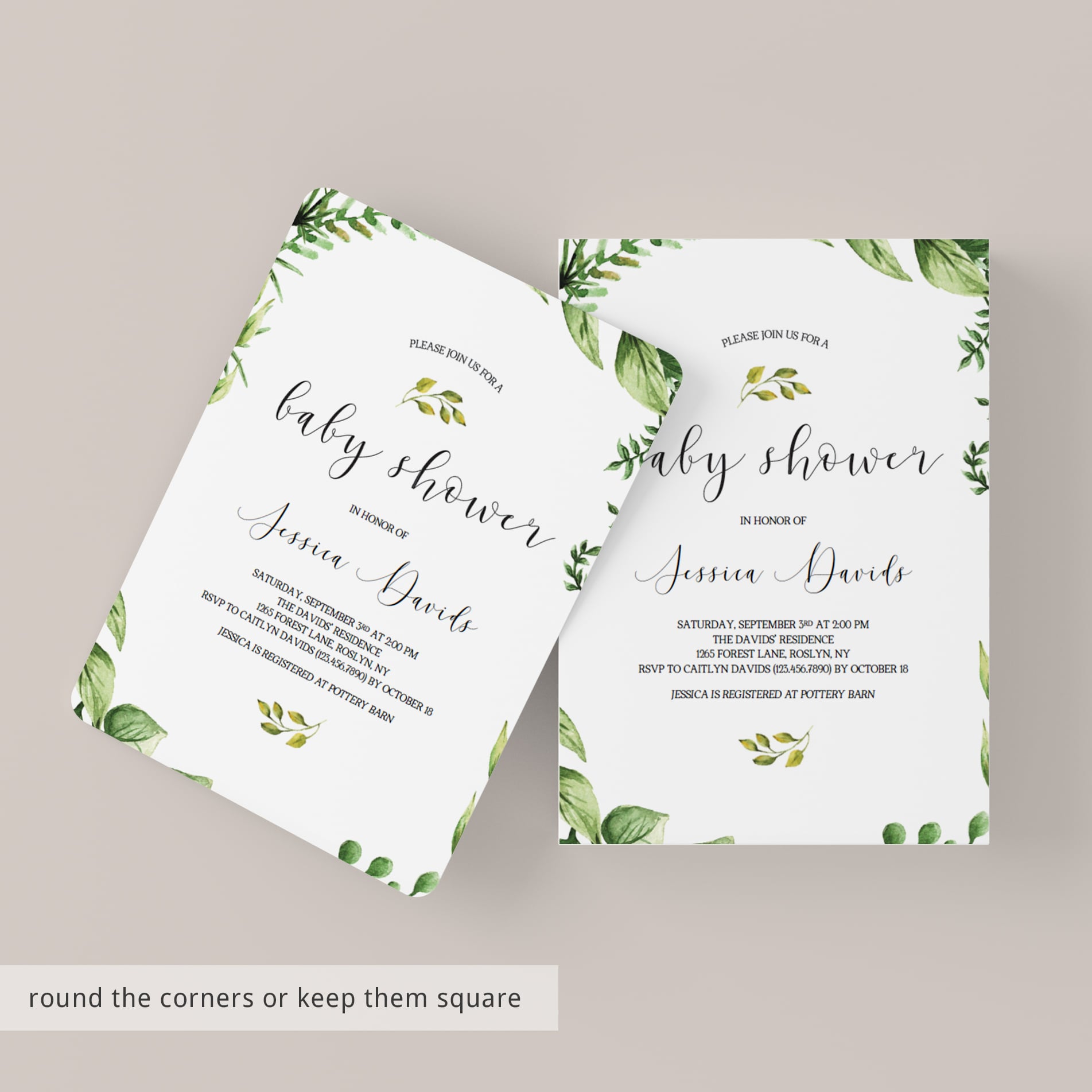 Instant download baby shower invitation template with green watercolor leaves by LittleSizzle