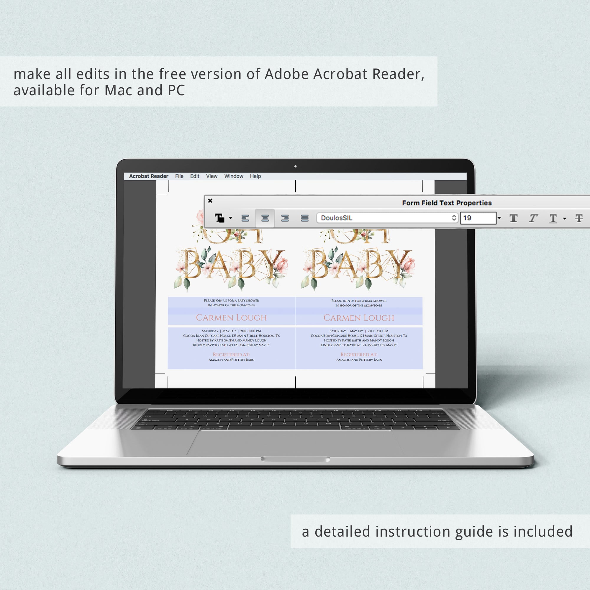 This floral baby shower invitation template is editable in Adobe Acrobat Reader (free download). After downloading the file, fill in your details and print in just minutes. We've included our detailed instruction guide to make the process super smooth.
