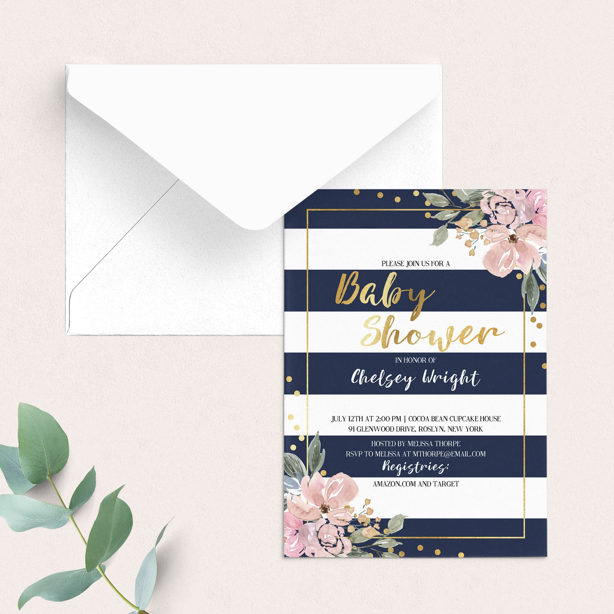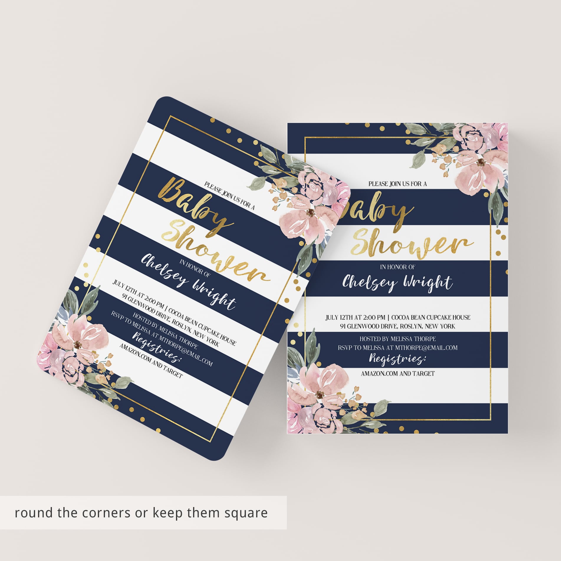 Treat the mom-to-be with a baby shower to remember with this gorgeous navy, pink and gold baby shower invite. The florals in combination with the navy stripes and gold confetti give the invitation a festive and chic look and will absolutely make everyone excited for the baby shower!