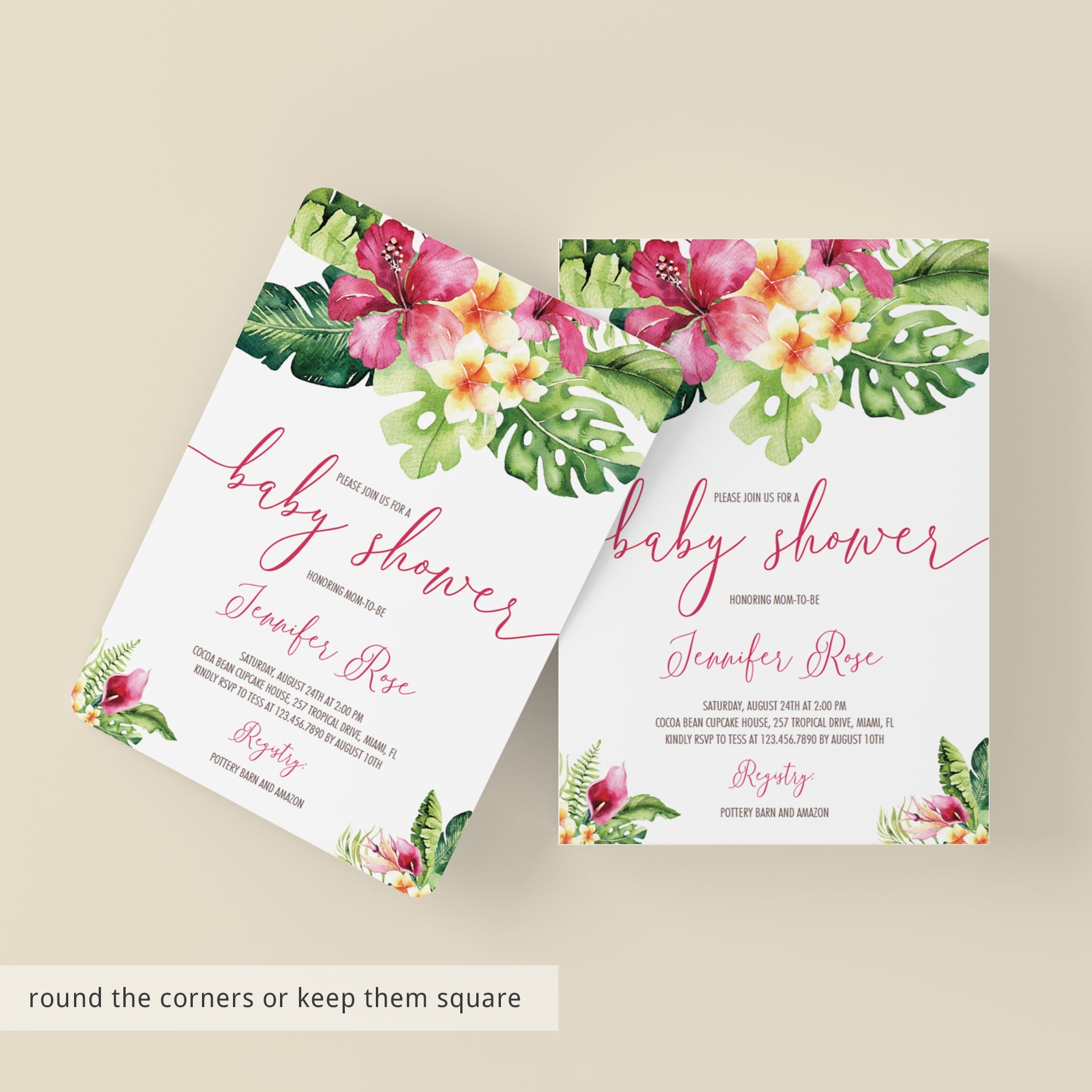 Invite your guests in style with this colorful tropical baby shower invitation. With its watercolor flowers and botanical leaves, this invitation is perfect for a summer baby shower to celebrate the arrival of a little girl.