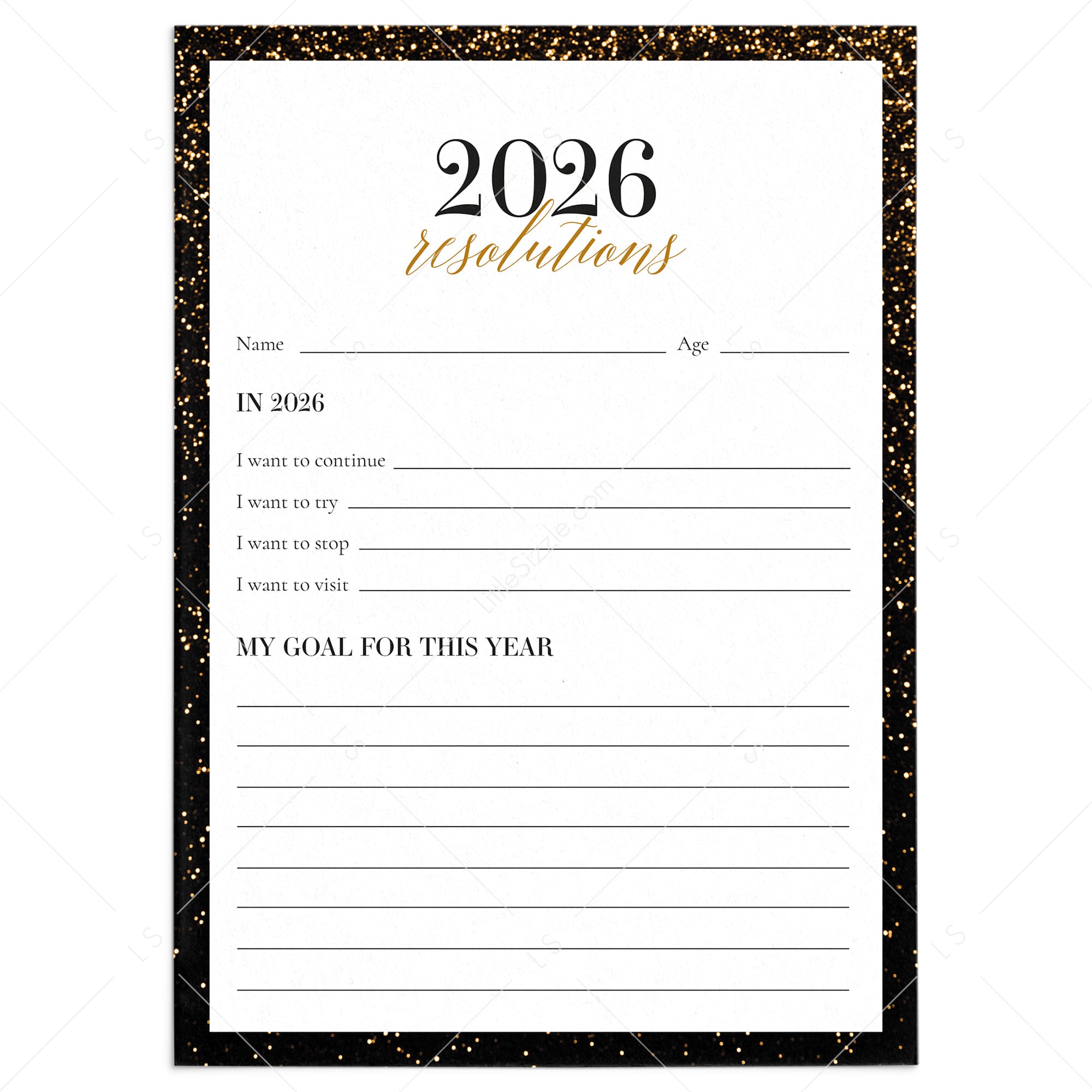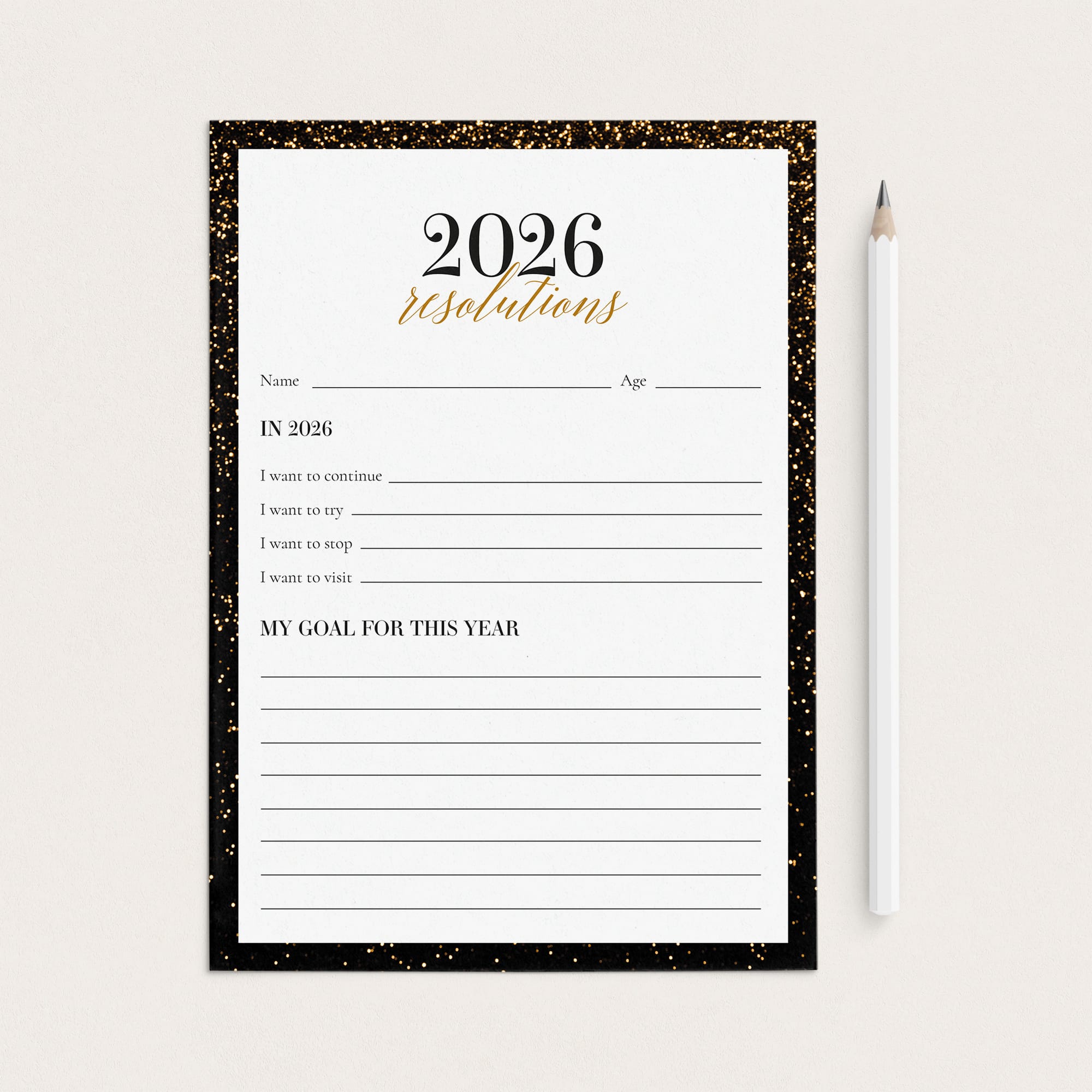 Write down your resolutions and goals for 2026 with this New Year Resolutions card. The golden glitter design will definitely get you excited for the coming year. It's a great activity for families to do together.