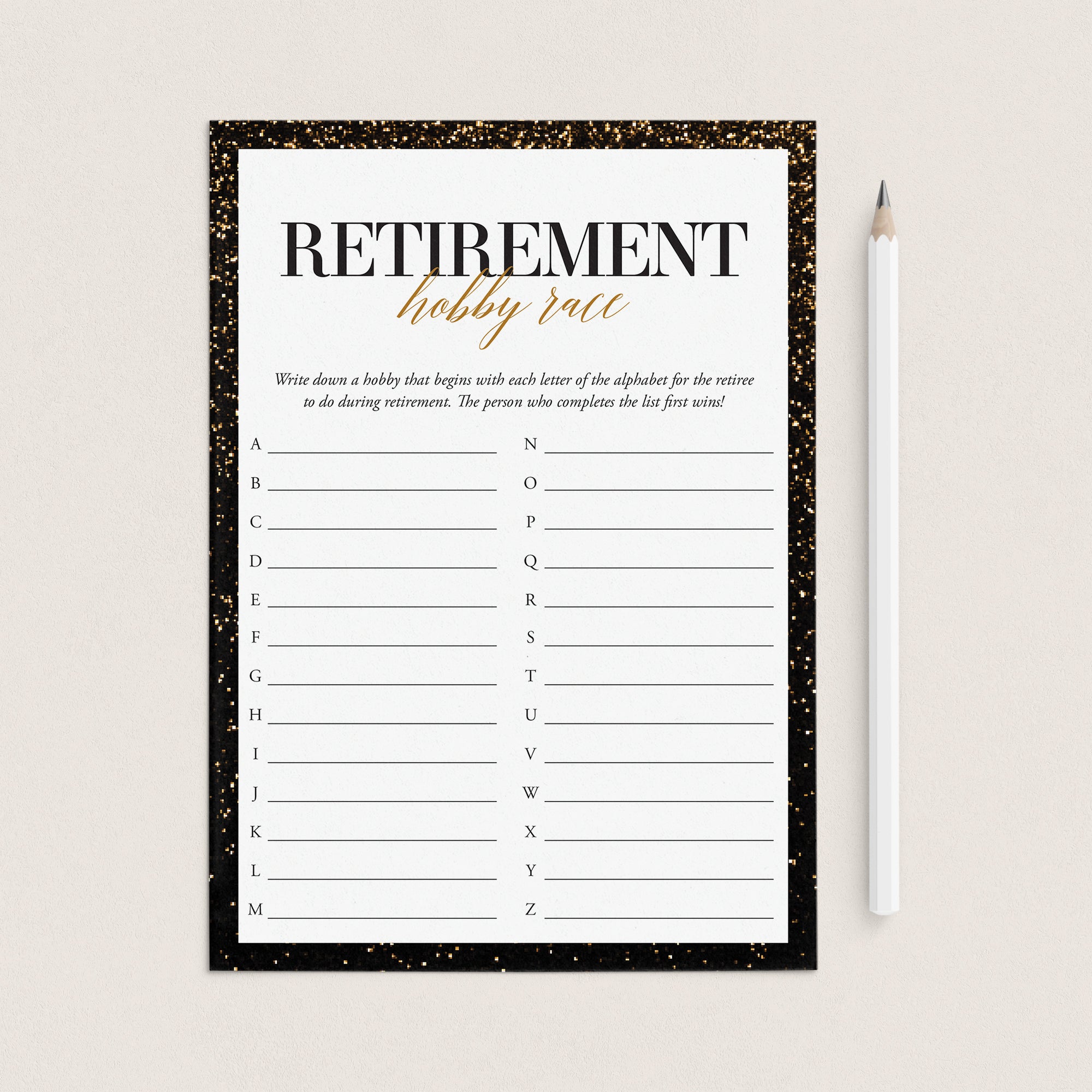 The game is very easy to play. Hand out this black and gold glitter Hobby Race game and a pen to your guests. They will have to come up with hobbies for the retiree to do during retirement that begin with each letter of the alphabet as fast as they can. The first person to get all the hobbies from A to Z wins!