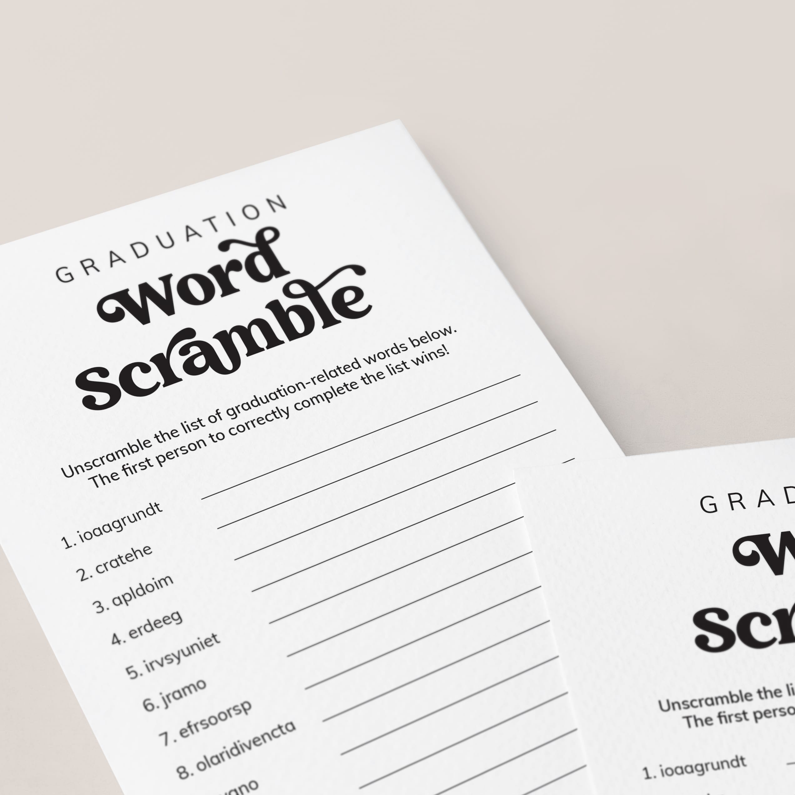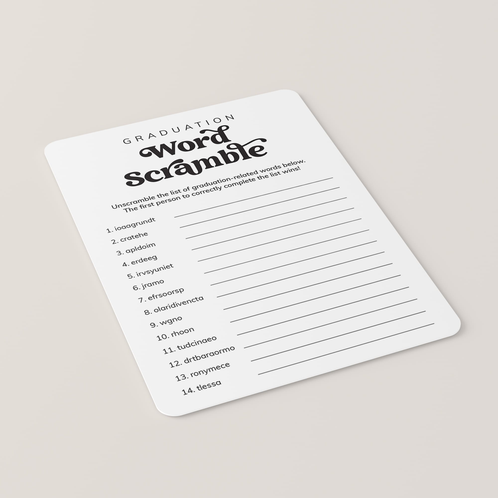 Are you hosting a Graduation Party? Add some extra fun with this black and white graduation word scramble game, featuring a creative vintage script. It's a ton of fun for all ages. Play this graduation game at a high school graduation party, college graduation party or even a preschool graduation. Games are a must for every grad party!