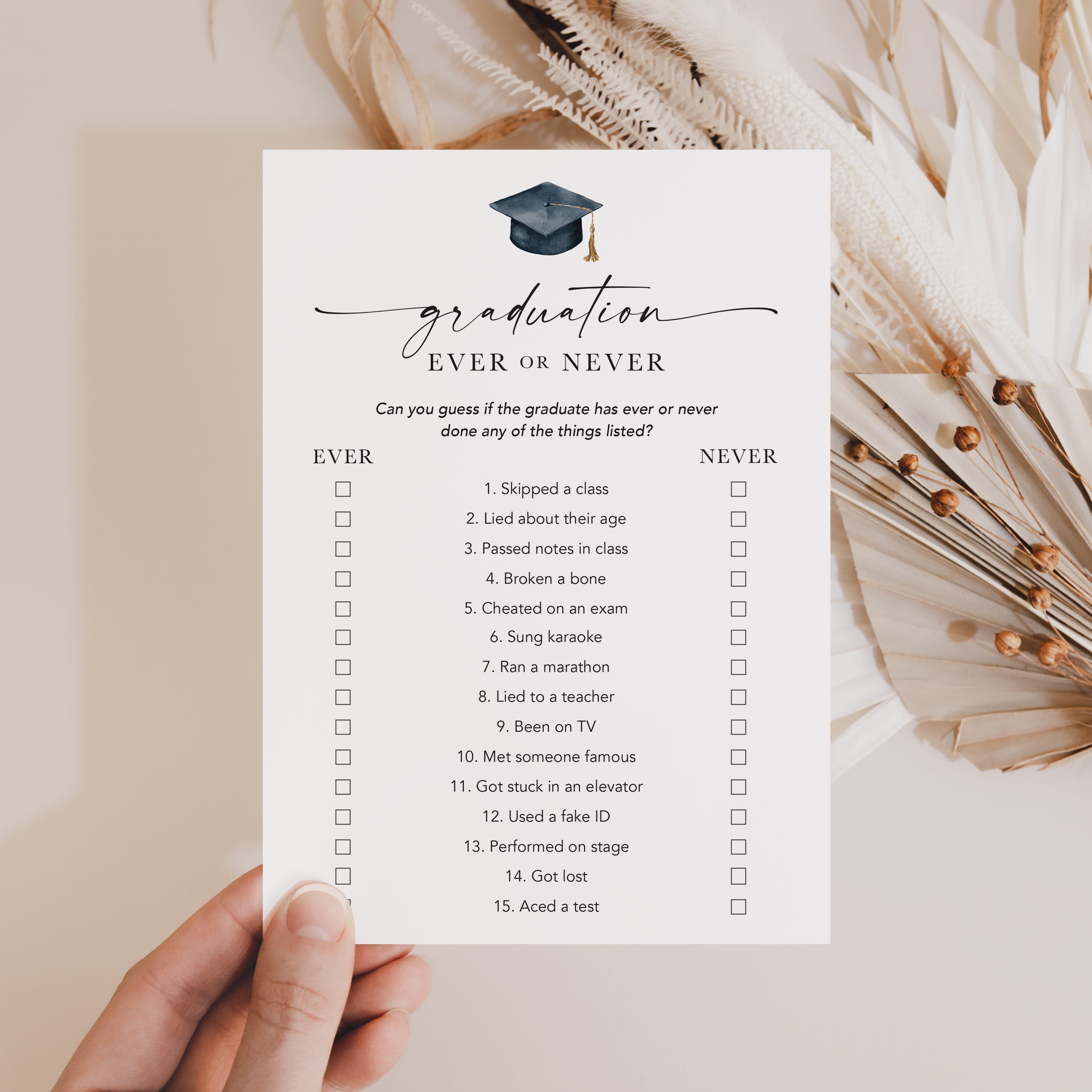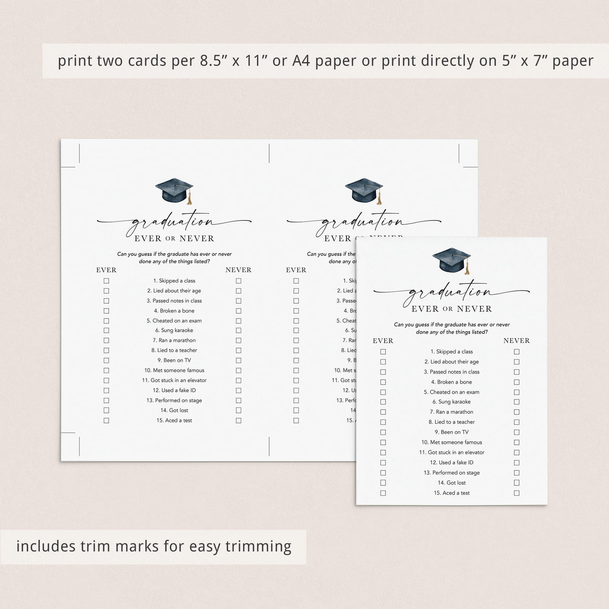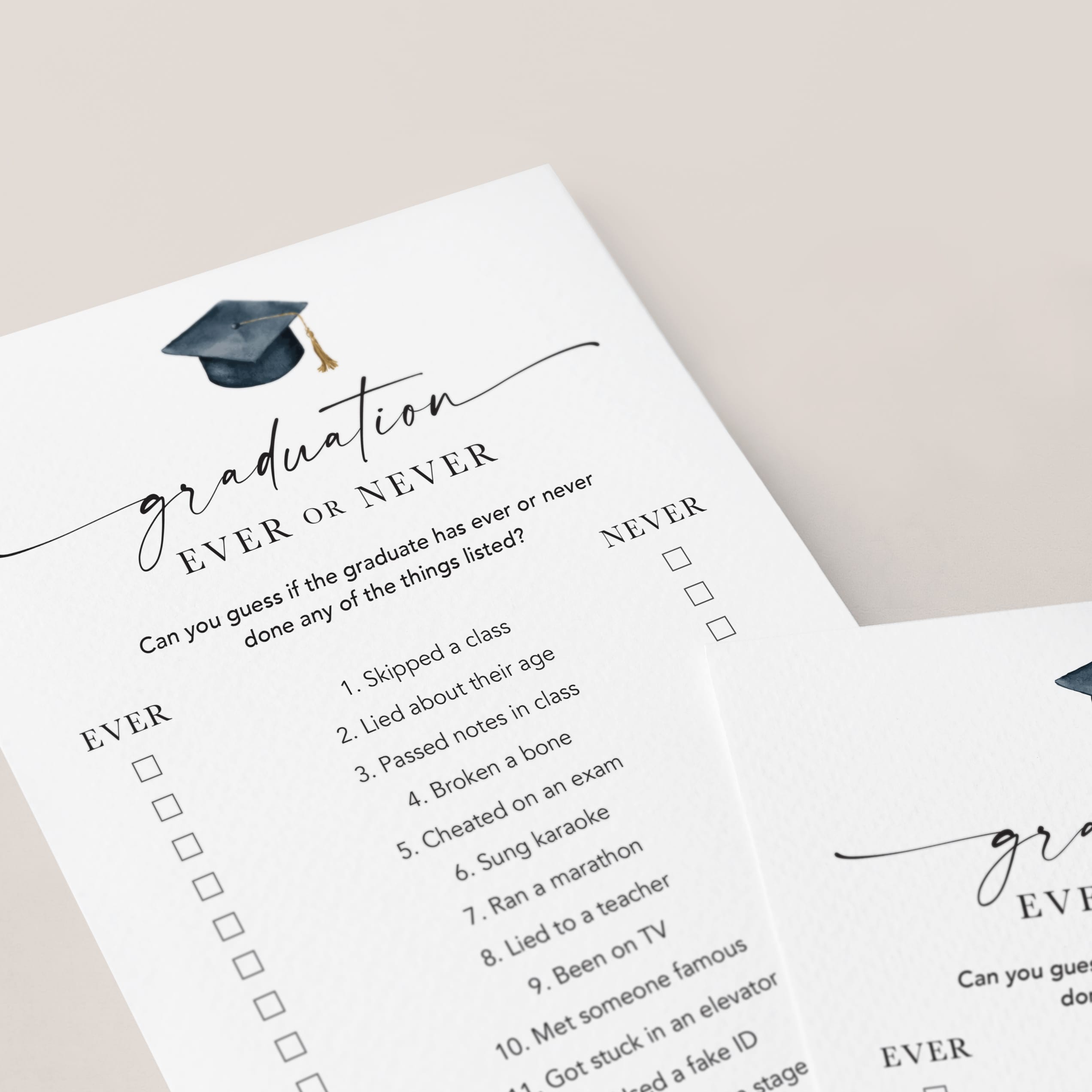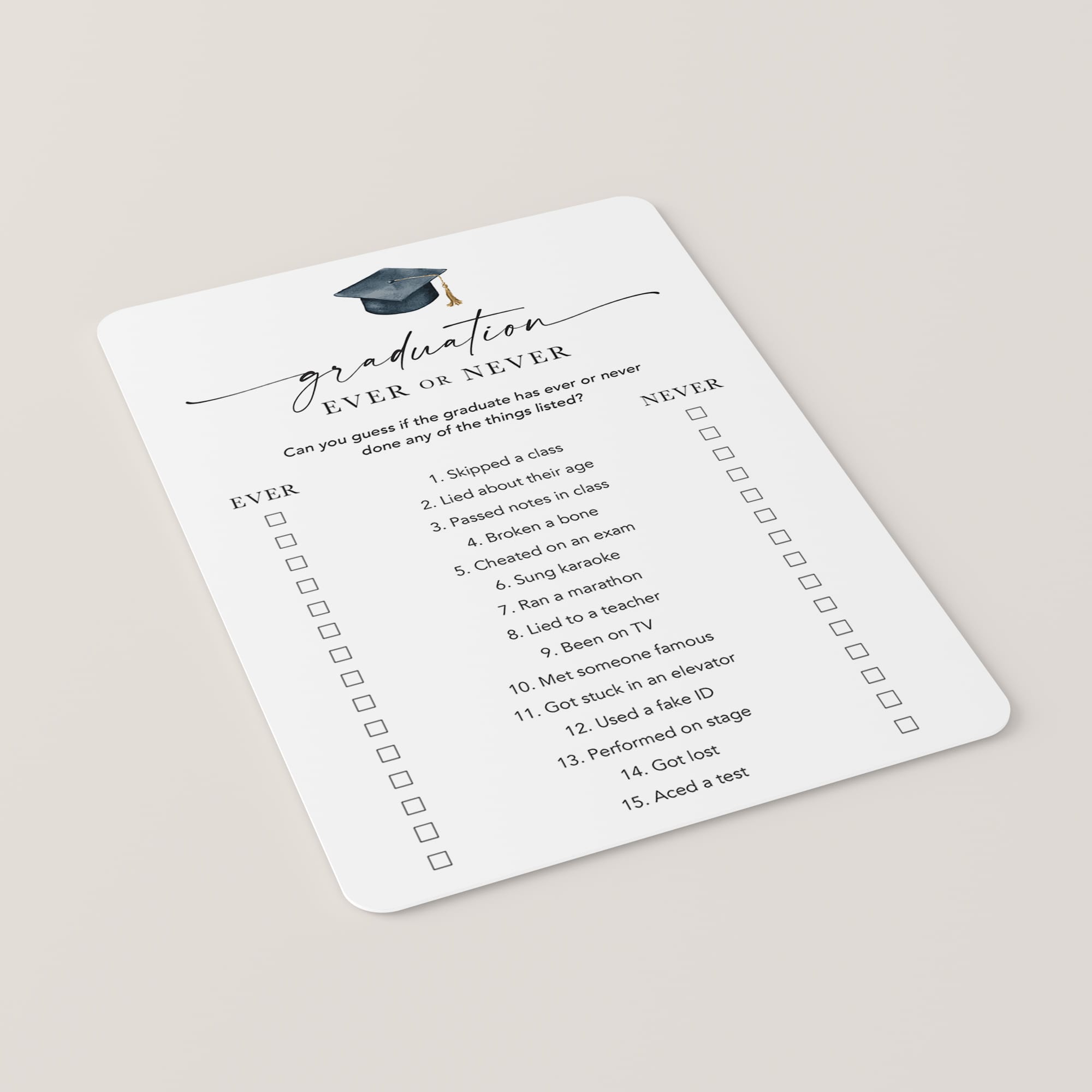 Are you looking for a fun Graduation Party icebreaker game? Play Ever or Never! This minimalist ever or never game, featuring an elegant script font and watercolor graduation cap, is the perfect fit for any graduation party.