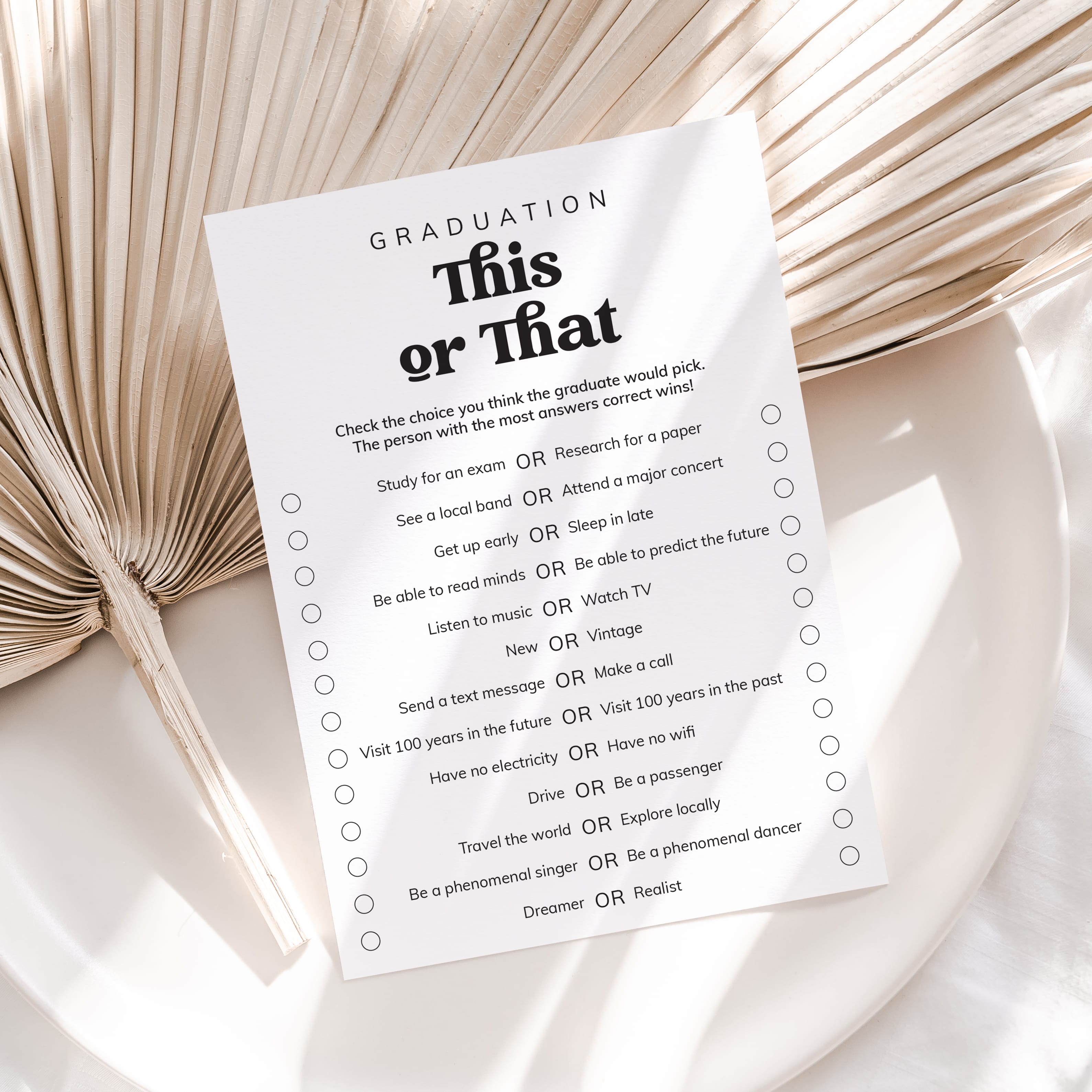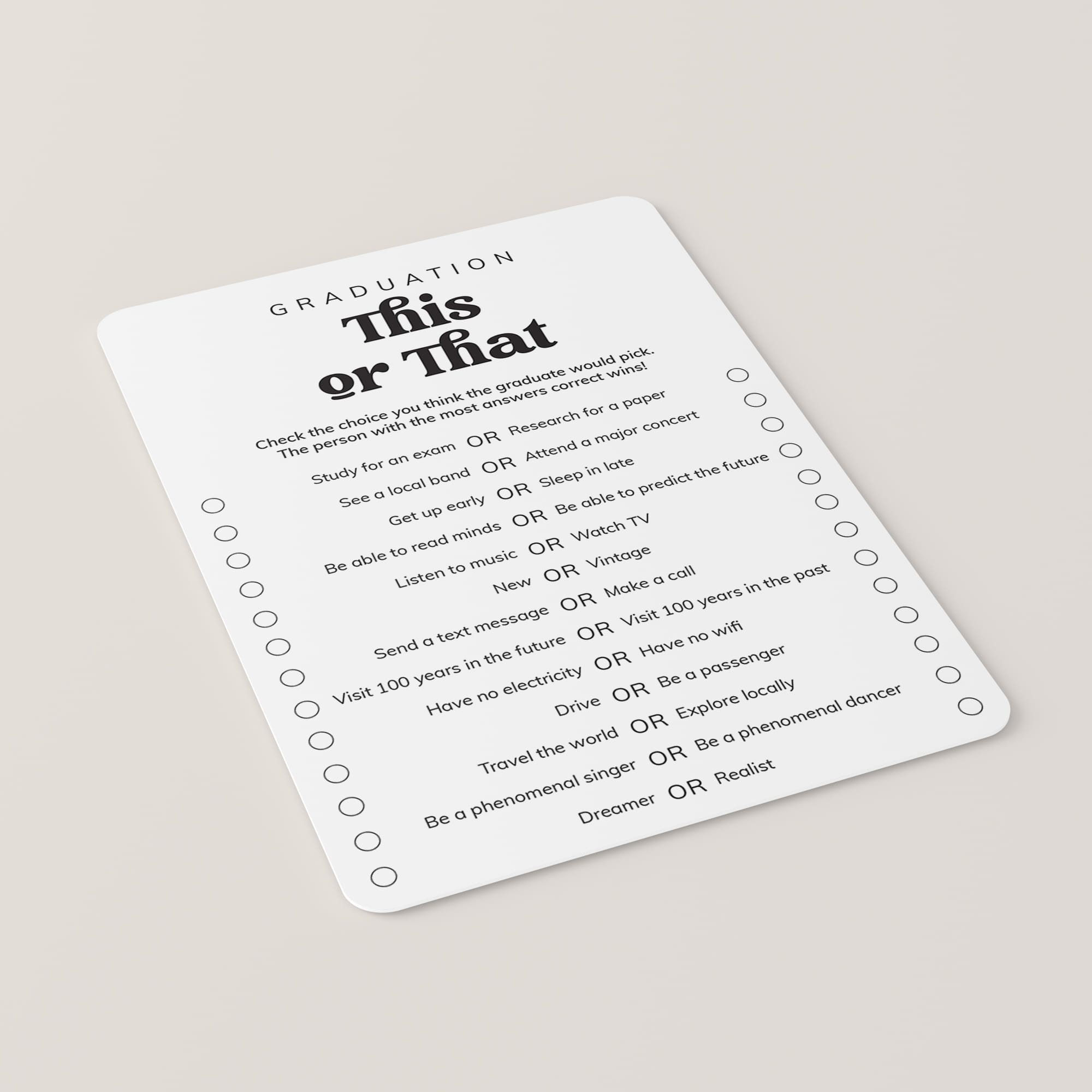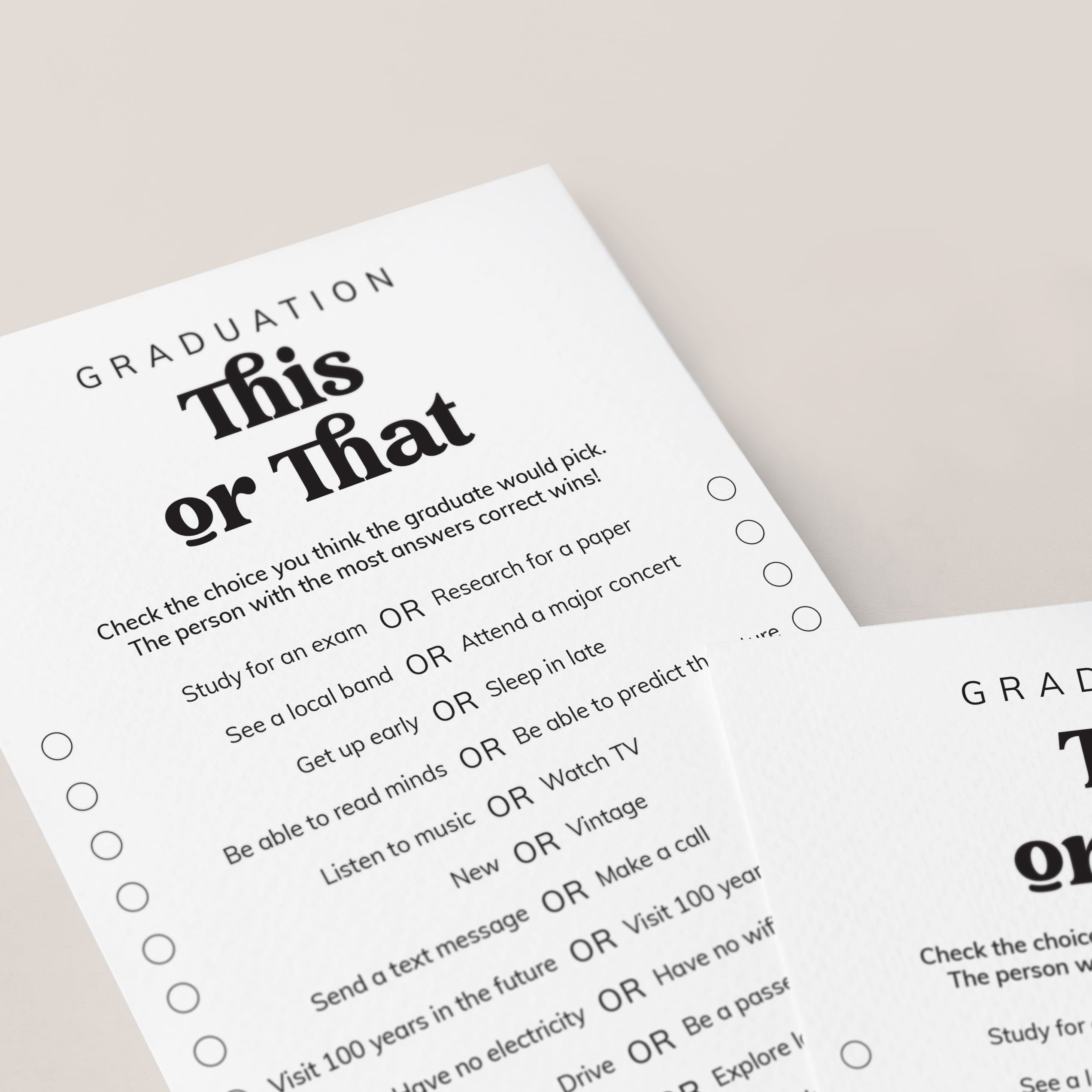 Are you looking for the perfect icebreaker to get people talking and in the party mood for your graduation party? Play Graduation This or That! After all, your guests have one thing in common: you know the graduate. This black and white This or That graduation game, featuring a creative vintage script, is the perfect fit for any graduation party.