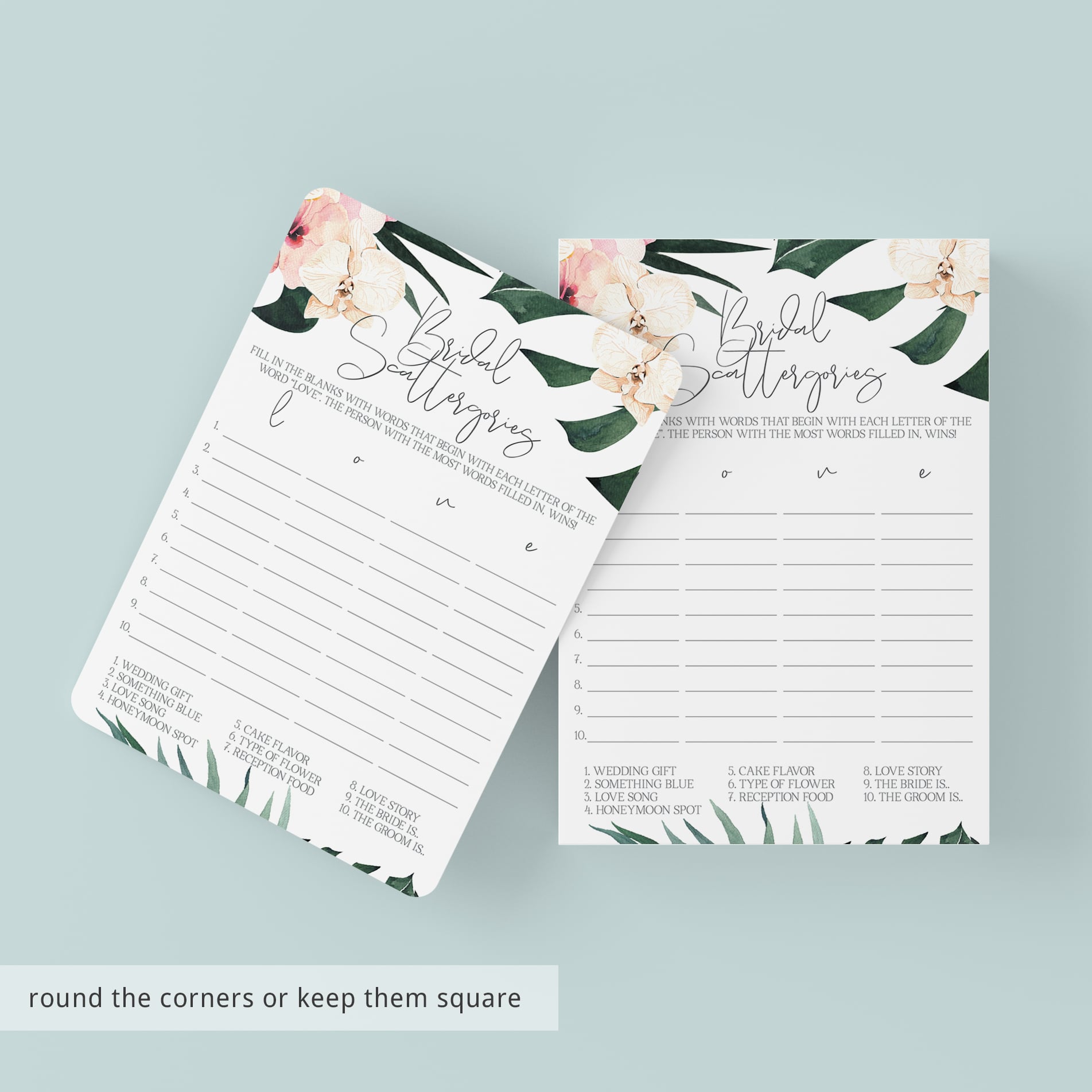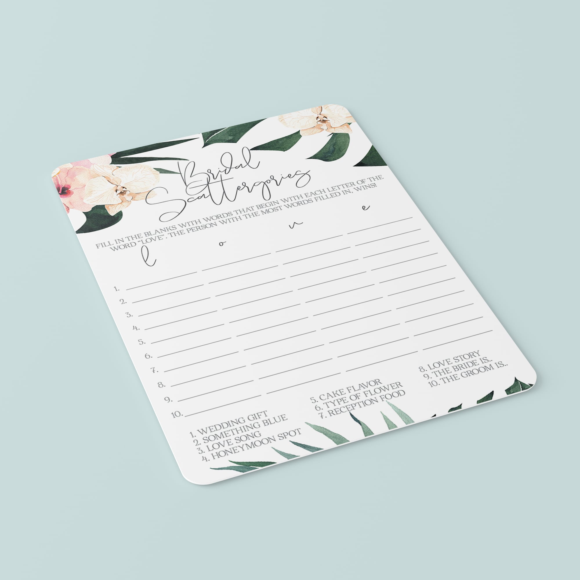 How many words can you fill in with the letters "L", "O", "V" and "E"? Play Bridal Shower Scattergories with these gorgeous summer theme game cards to ensure lots of fun and laughter.