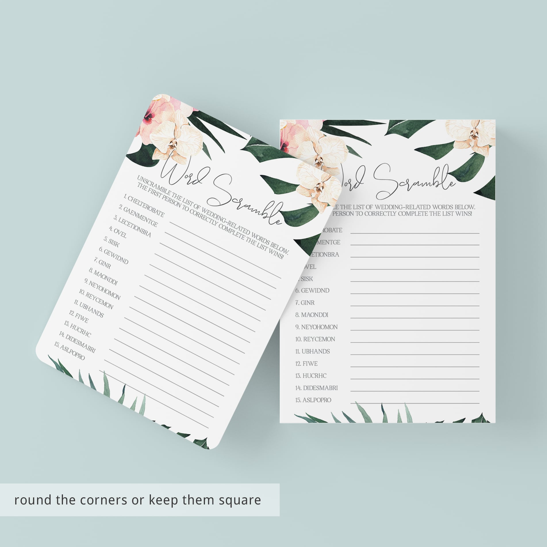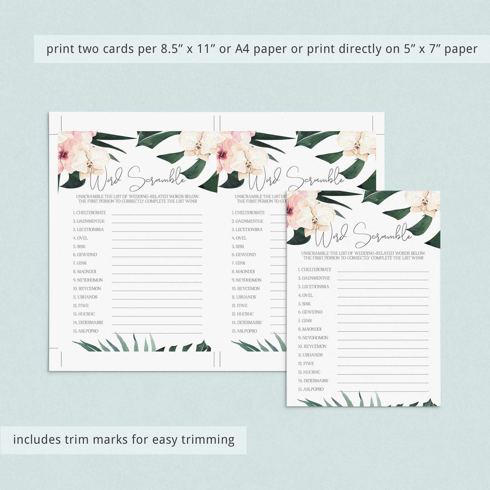 Play one of the most popular bridal shower games with these botanical theme bridal shower Word Scramble game cards. The cards would be perfect for any summer bridal shower and will create a fun and enjoyable moment for all of your guests.