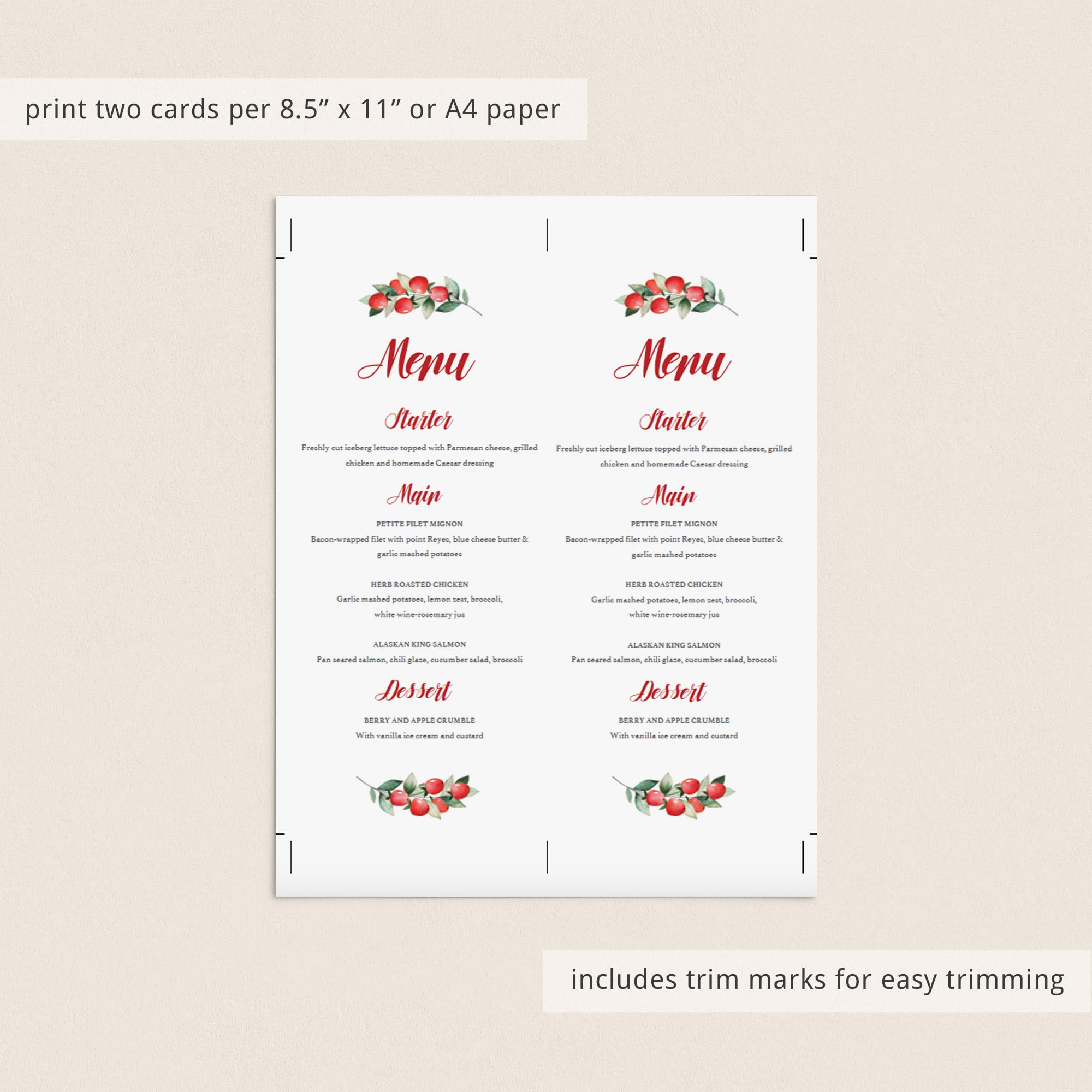 This Christmas dinner menu template is editable in Adobe Acrobat Reader (free download). After downloading the file, fill in your details and print in just minutes. Print the menu cards on any 8.5" x 11" or A4 paper of your choice. We recommend a nice heavy card stock for highest quality feel. A detailed instruction guide with tips & tricks on editing, trimming, paper choices and more is included.