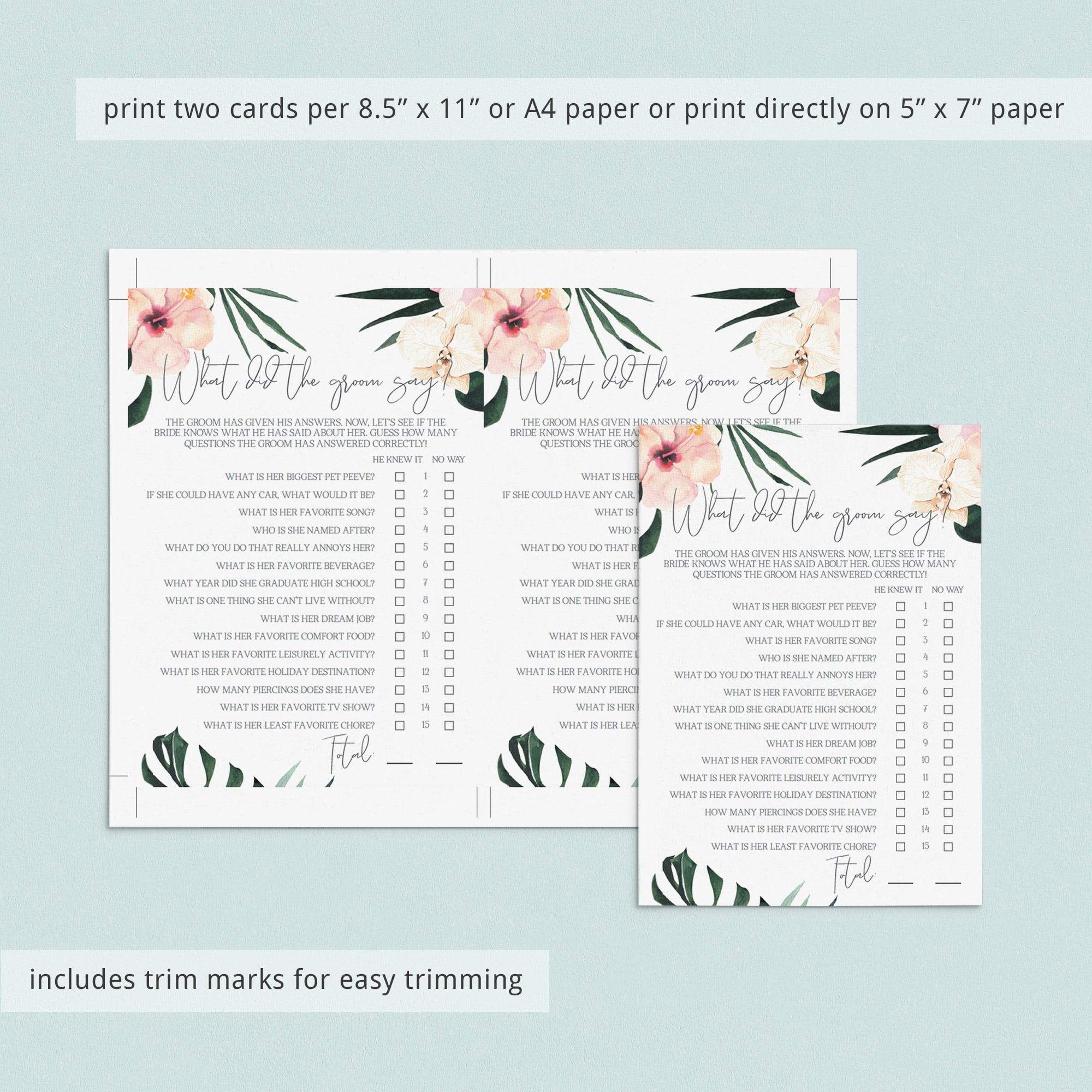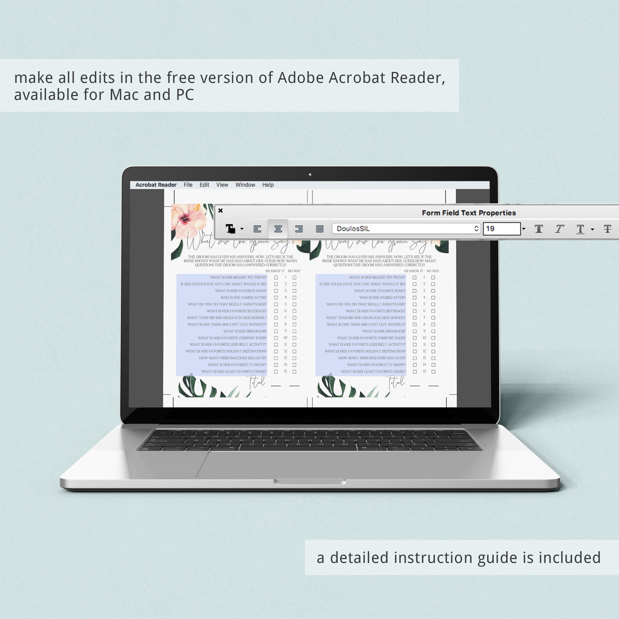 The game template can be customized with your own questions, so that you can have the game completely tailored to the bride and groom. After downloading the file, fill in your questions and print in just minutes. The games can be printed right from your computer or have them printed at your favorite print shop.