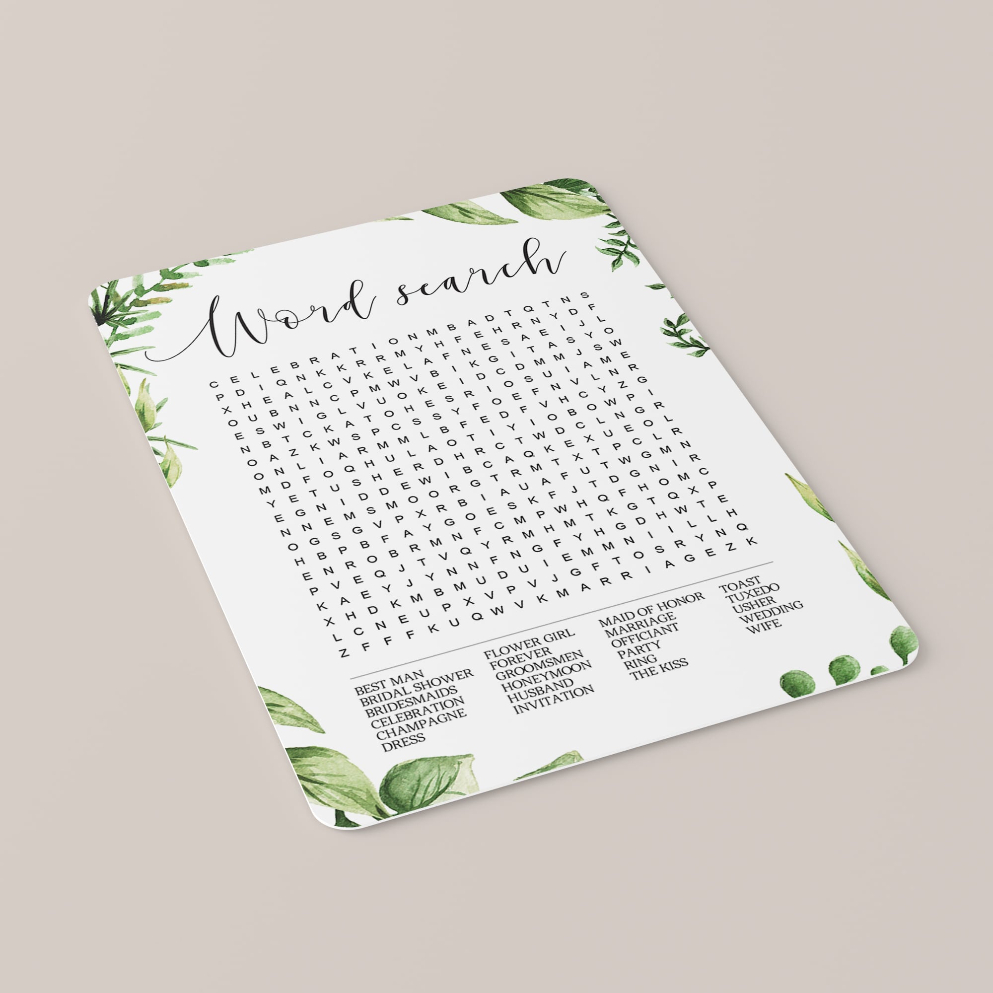 Looking for a unique bridal shower game? Play this garden wedding word search game. Let your guests search for all wedding related words that are listed at the bottom of the cards. The words can be found horizontally, vertically and diagonally. The first person to get all the words wins!