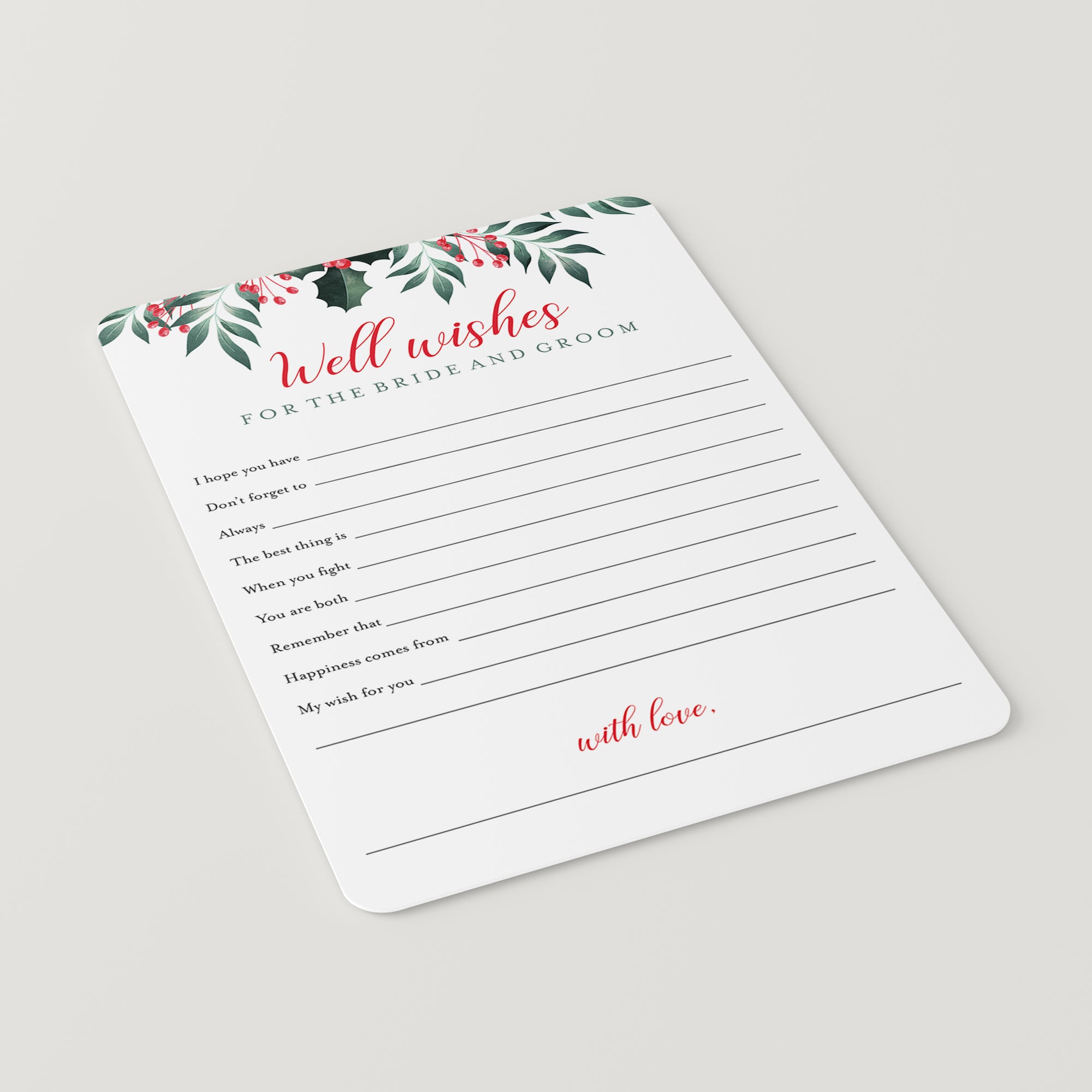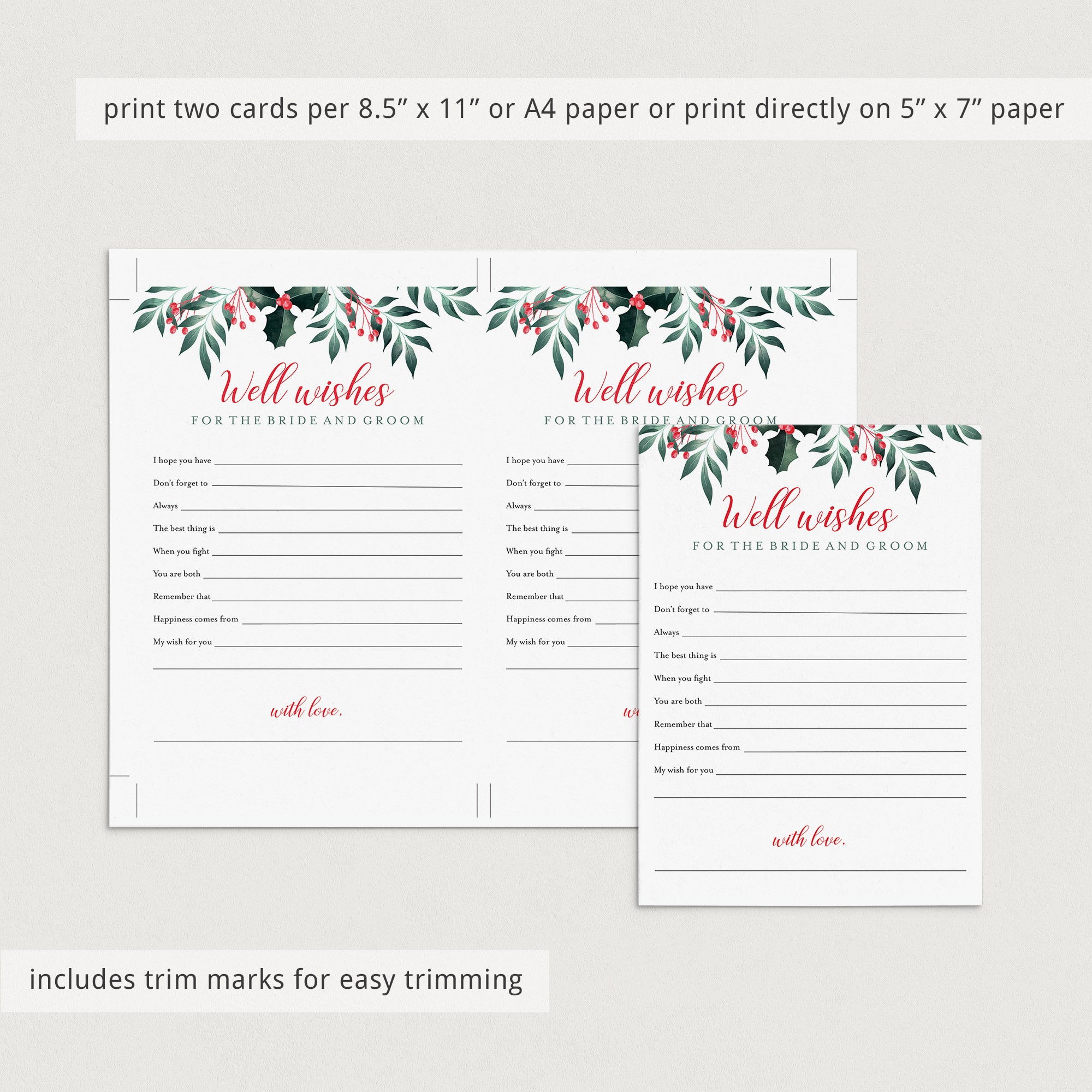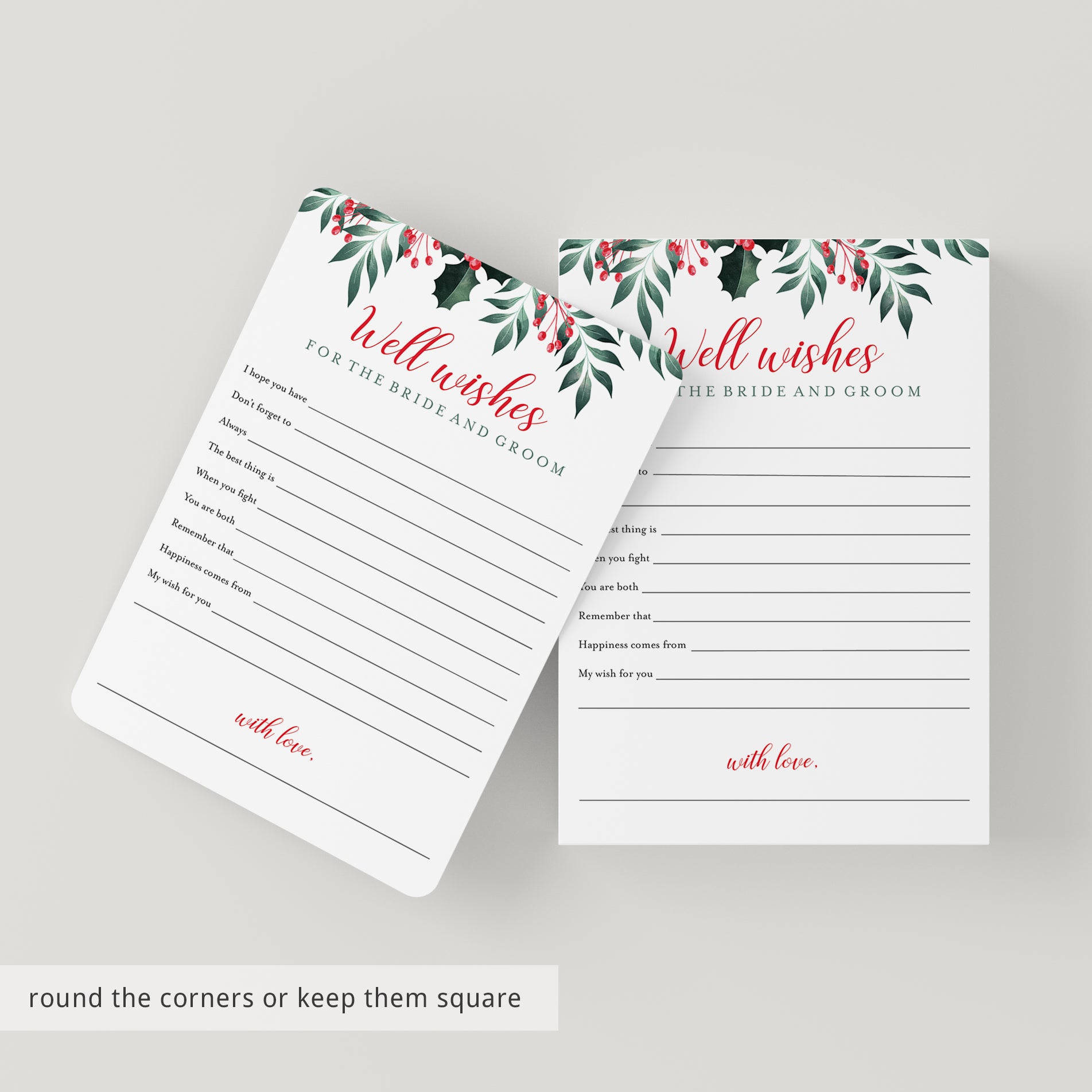 Create an amazing keepsake for the newlyweds with this holiday theme wedding well wishes cards with watercolor winter greenery. The Christmas holly and red berries will ensure that you have those special holiday vibes at your event. It's the perfect addition to a winter bridal shower or Christmas wedding shower. Let every guest write down their advice and wishes for the soon-to-be-weds and collect the cards for the happy couple.