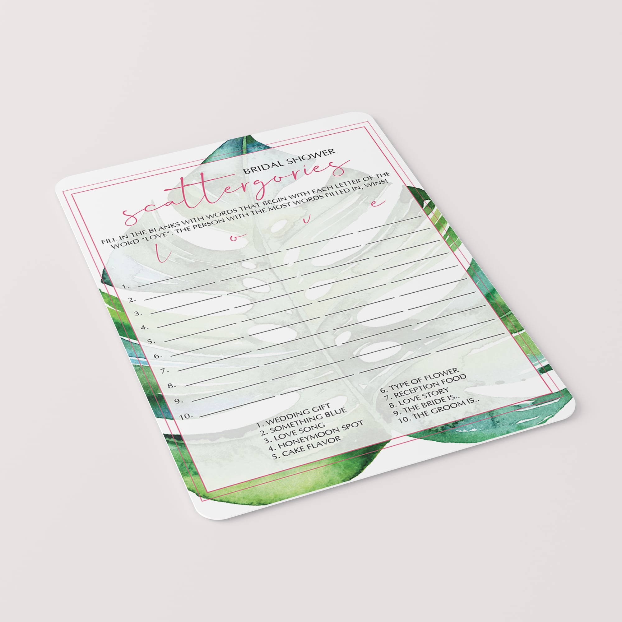 How many wedding related words starting with the letters "L", "O", "V" and "E" can you come up with? Play bridal Scattergories at your party with these watercolor palm leaf bridal shower game cards to ensure lots of fun and laughter.