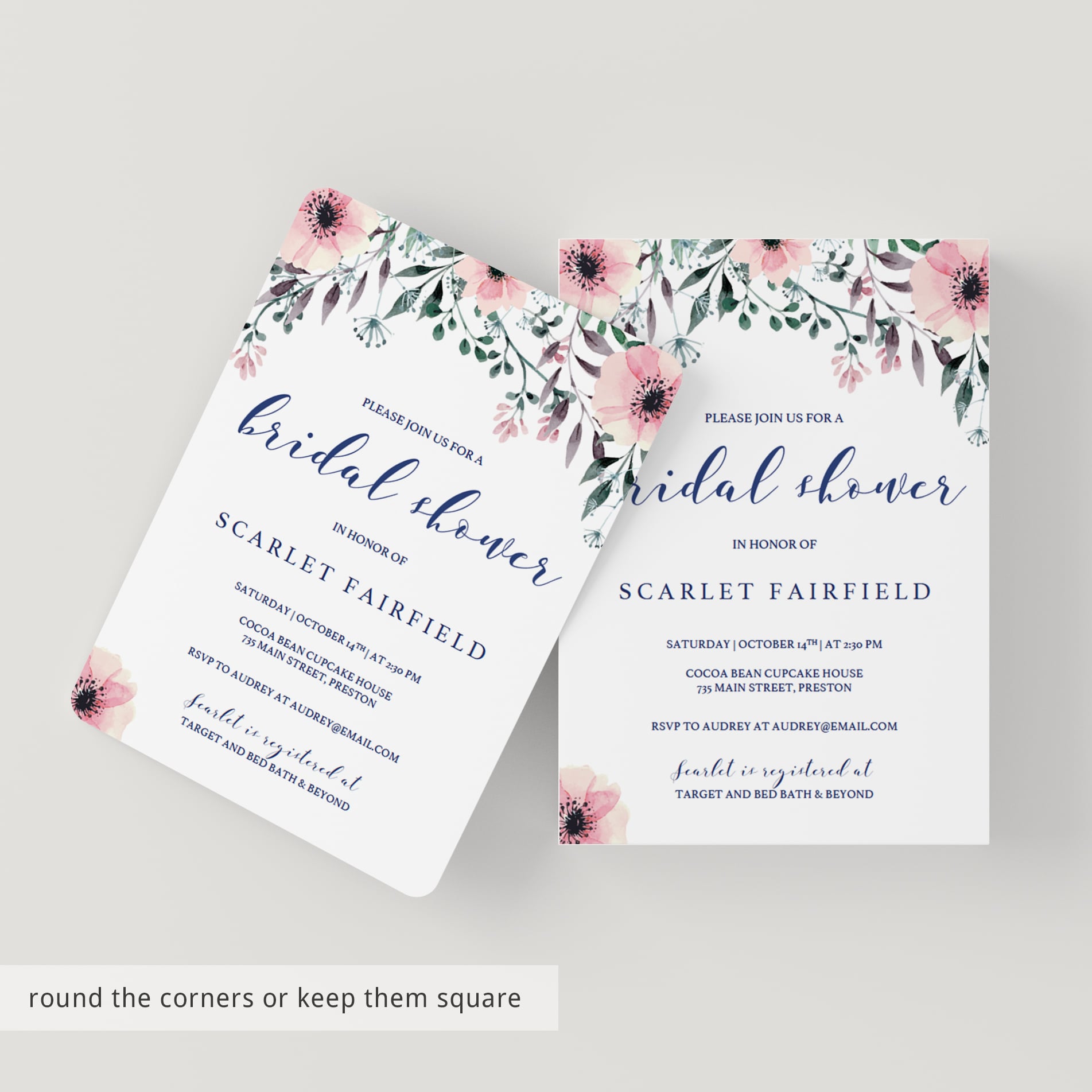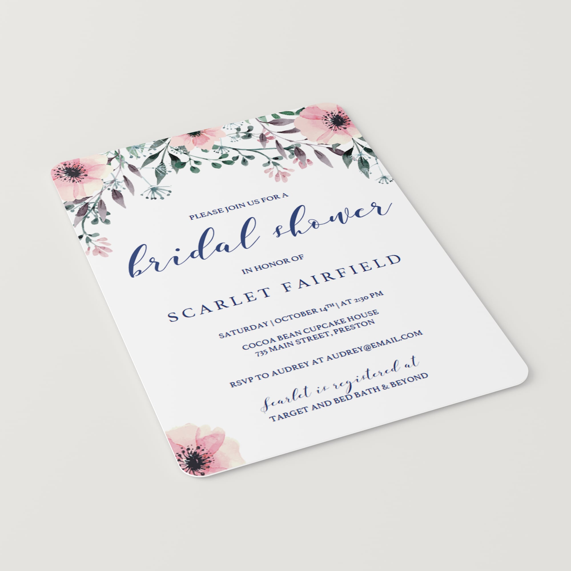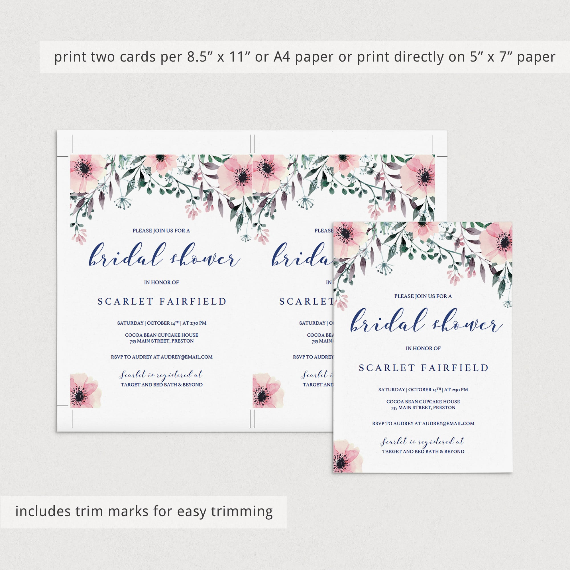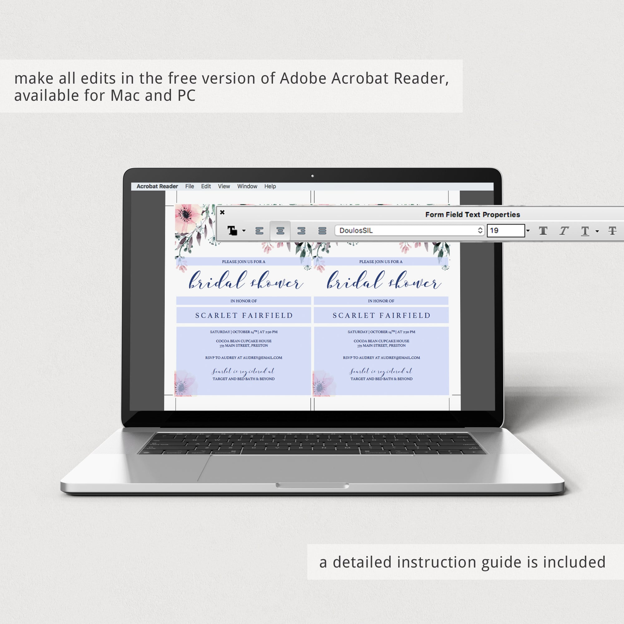 This bridal shower invitation template is editable in Adobe Acrobat Reader (free version). After downloading the file, fill in your details and print in just minutes.