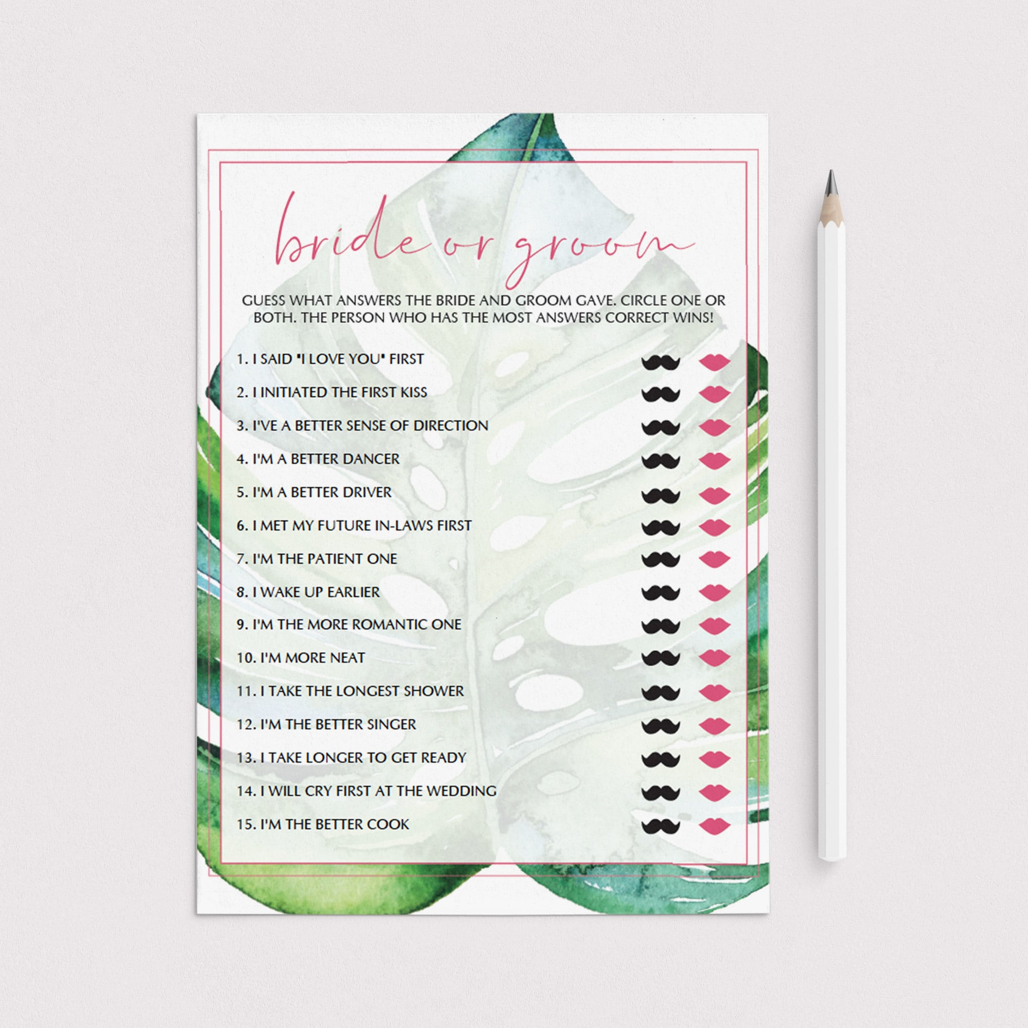 This tropical themed games bundle includes the following 4 popular bridal shower games:
