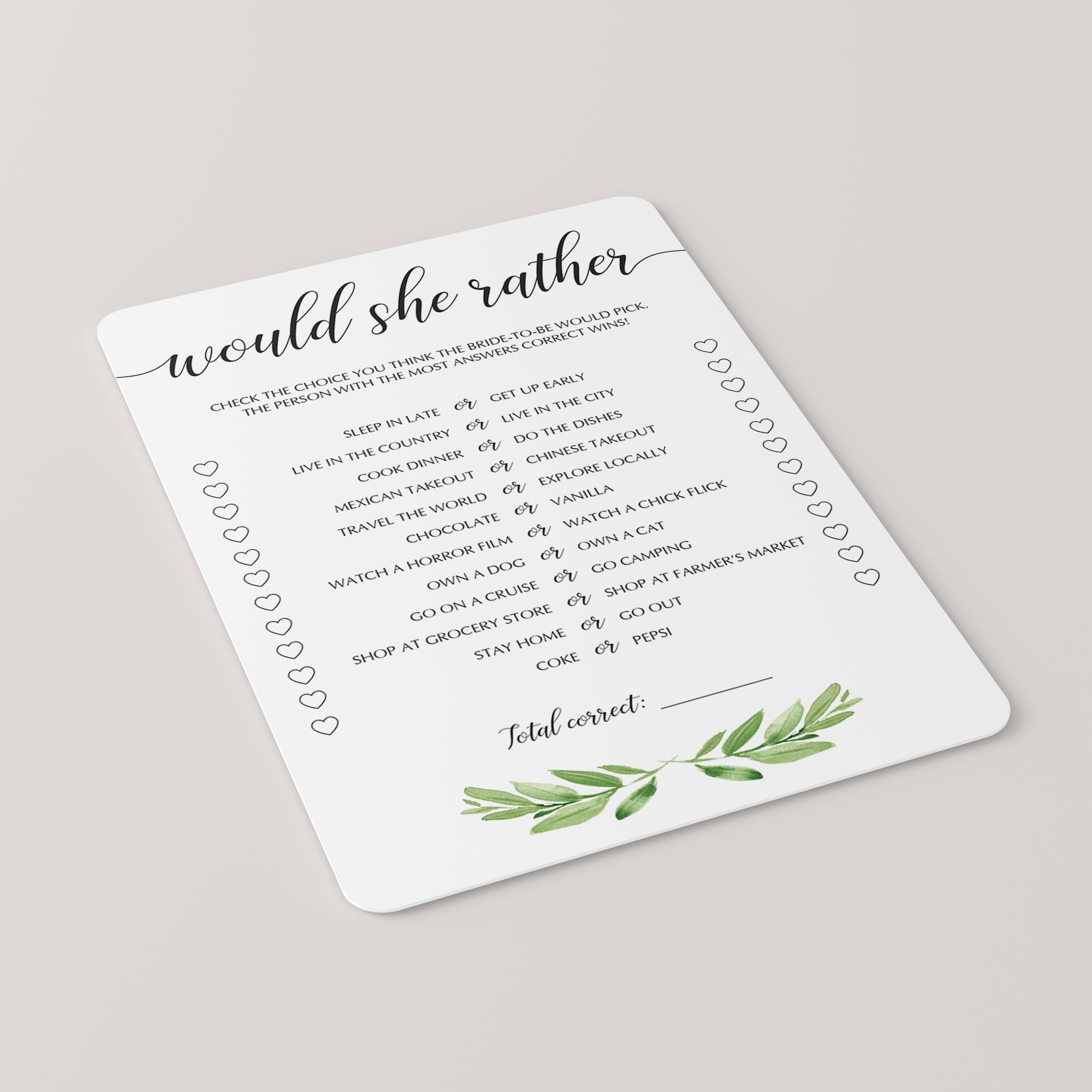 Who knows the bride-to-be best? Figure it out with this fun wedding shower "Would she rather" game. These game cards with gorgeous green leaves would be perfect for a greenery themed bridal shower.