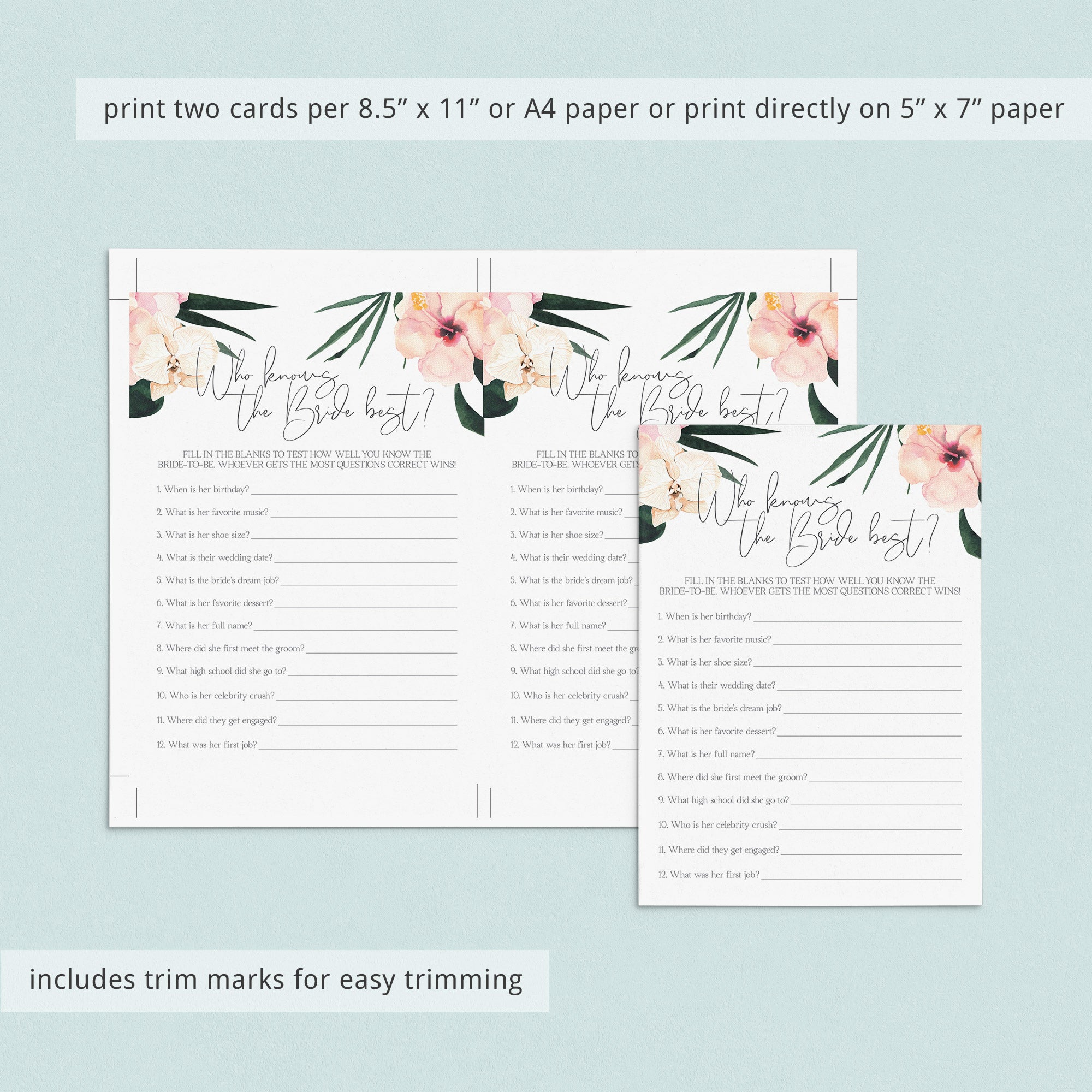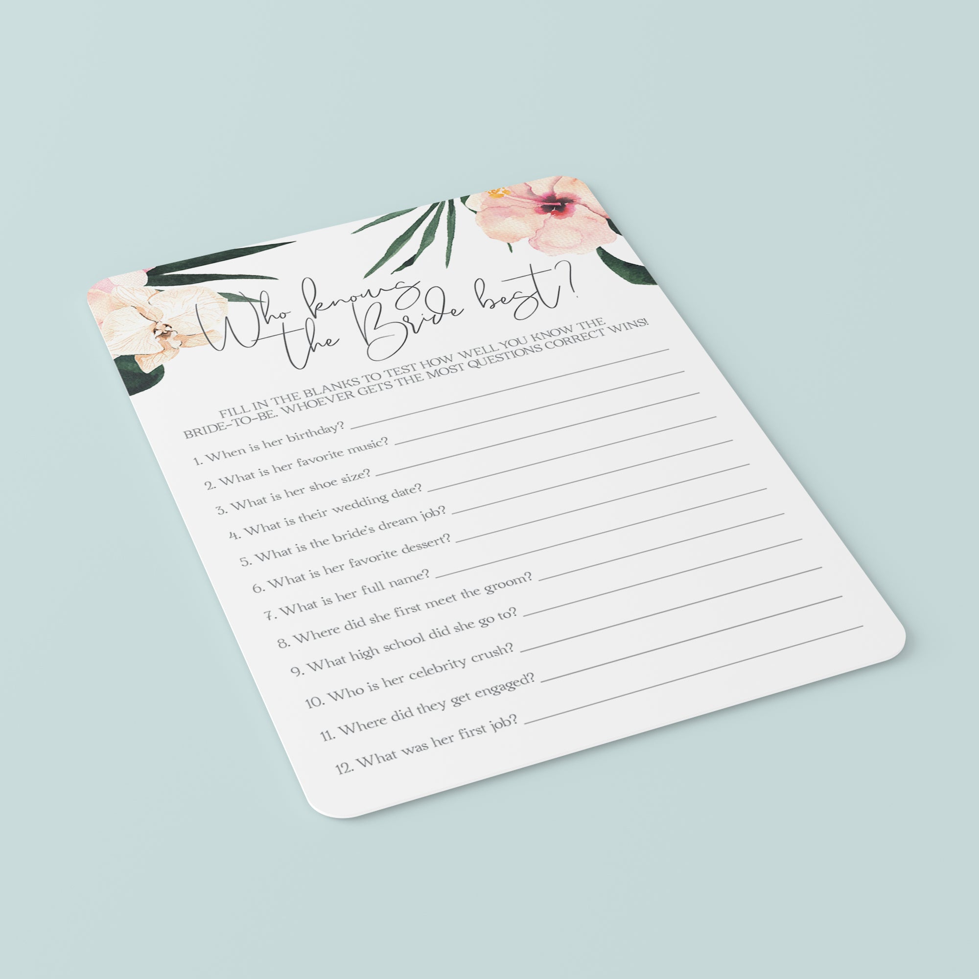 Test your bridal shower guests how good they know the bride to be and play ‘Who knows the bride best’ with these beautiful summer theme game cards. A Bridal Shower Quiz is a great way to bring disparate people together and to put them all in a party mood.