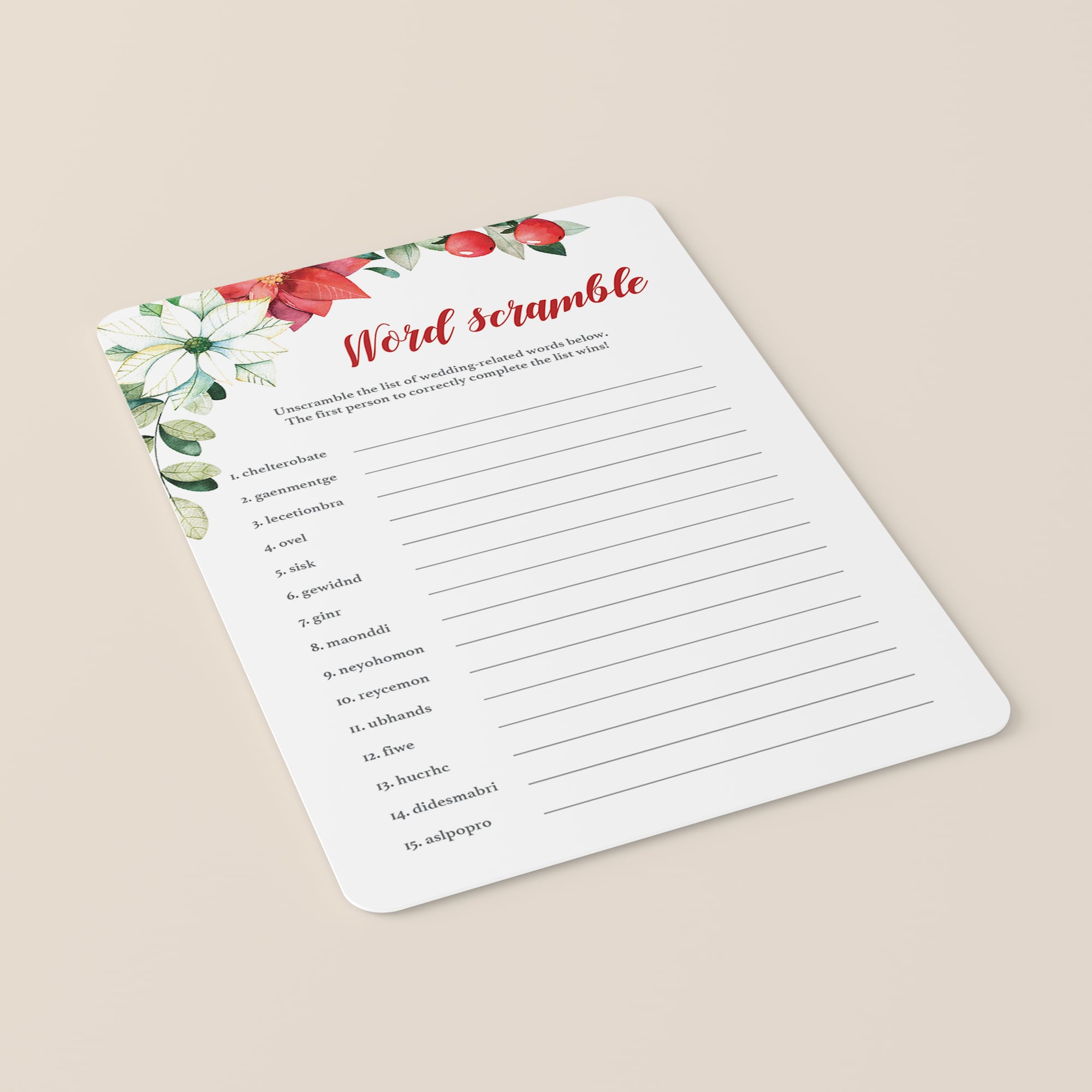 Are you hosting a winter bridal shower? Entertain your guests with this gorgeous winter bridal shower games pack. The red and white poinsettia's and green leaves will ensure that you have those special winter vibes at your party. The pack includes everything you need to entertain your guests with a variety of activities.