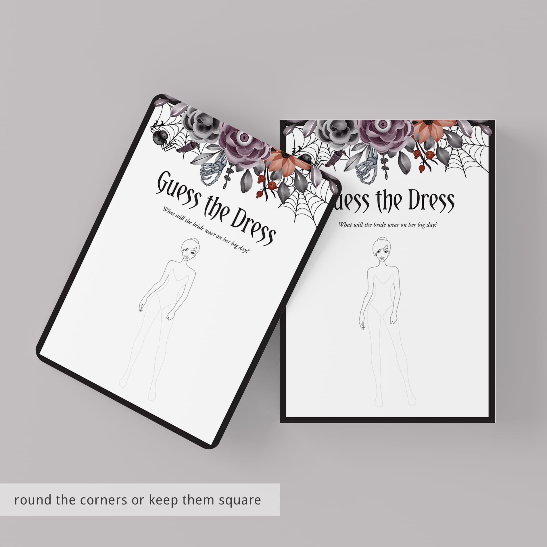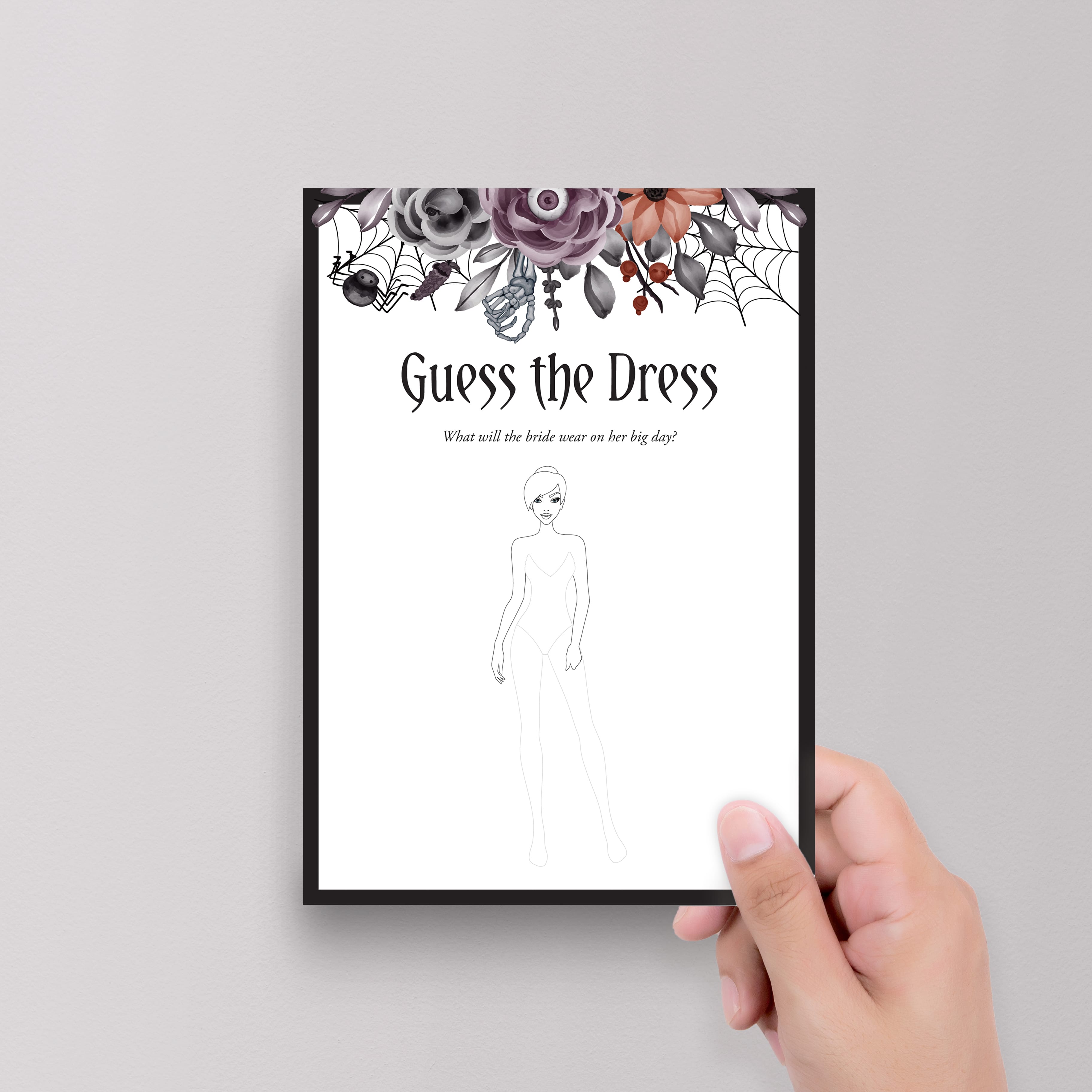 Are you looking for a creative activity for your Halloween theme bridal shower? Play Guess The Wedding Dress with these black and purple floral game cards. With it's moody floral arrangements, this game card is the perfect addition to any October bridal shower and it's sure to be a hit at your party!