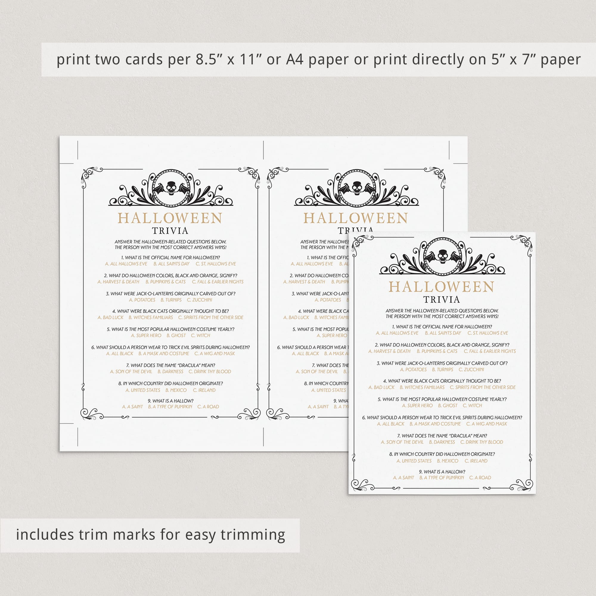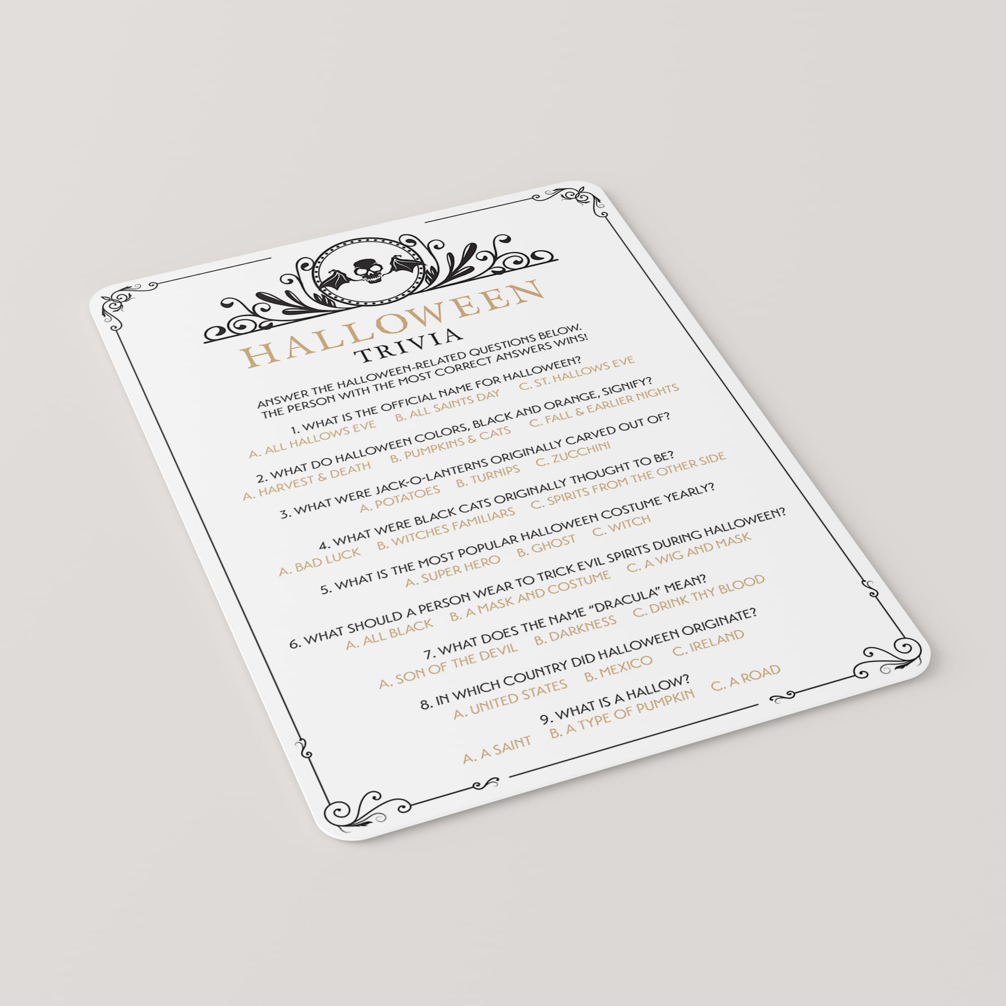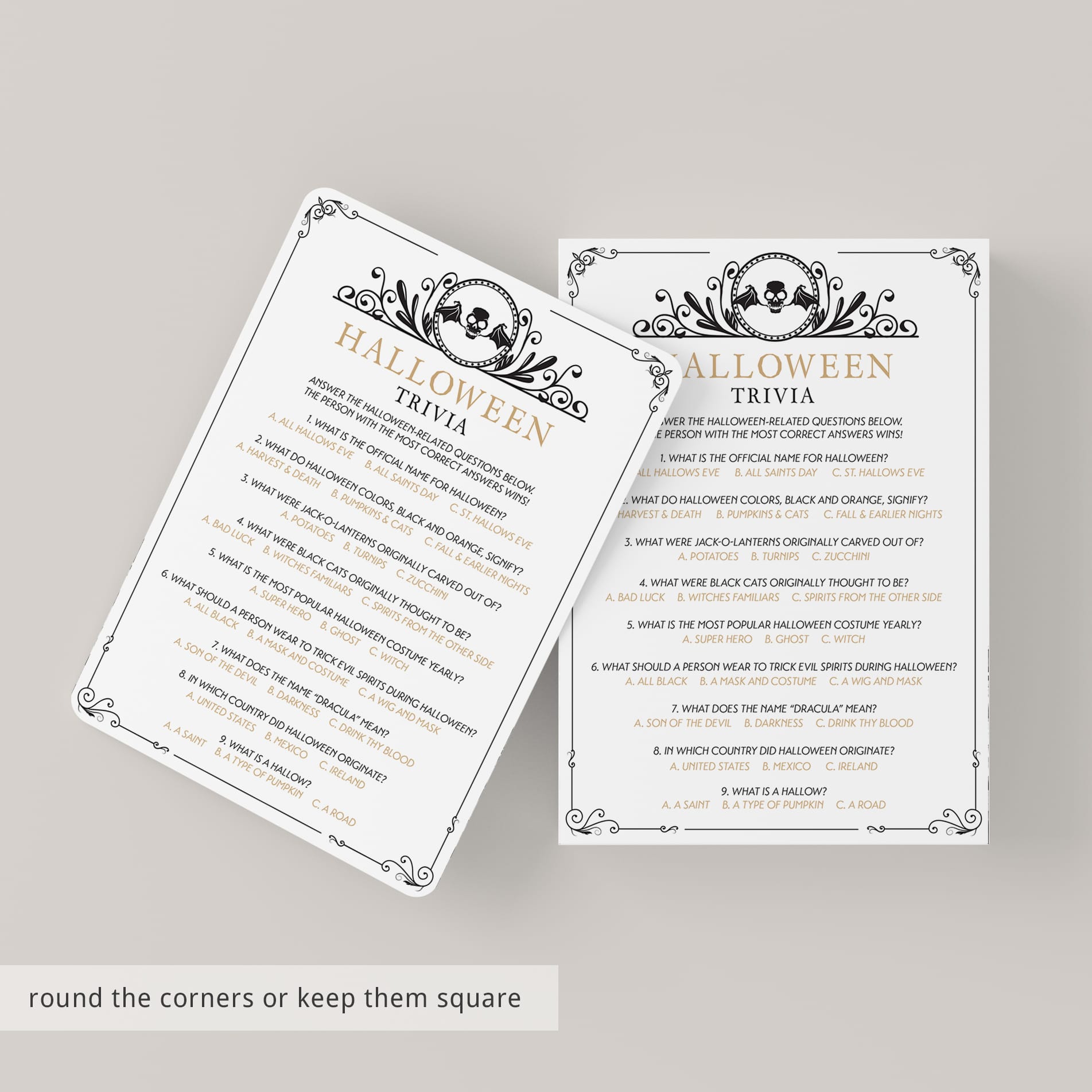 Are you hosting a classy black and gold theme Halloween party? Use this vintage Halloween Trivia with black skull and gold details to test your guests Halloween knowledge. What is the most popular Halloween costume? And what do the Halloween colors, orange and black, signify? Play this fun Halloween trivia game to find out! It’s a great challenging Halloween game to play at your Halloween office party or Halloween family night.