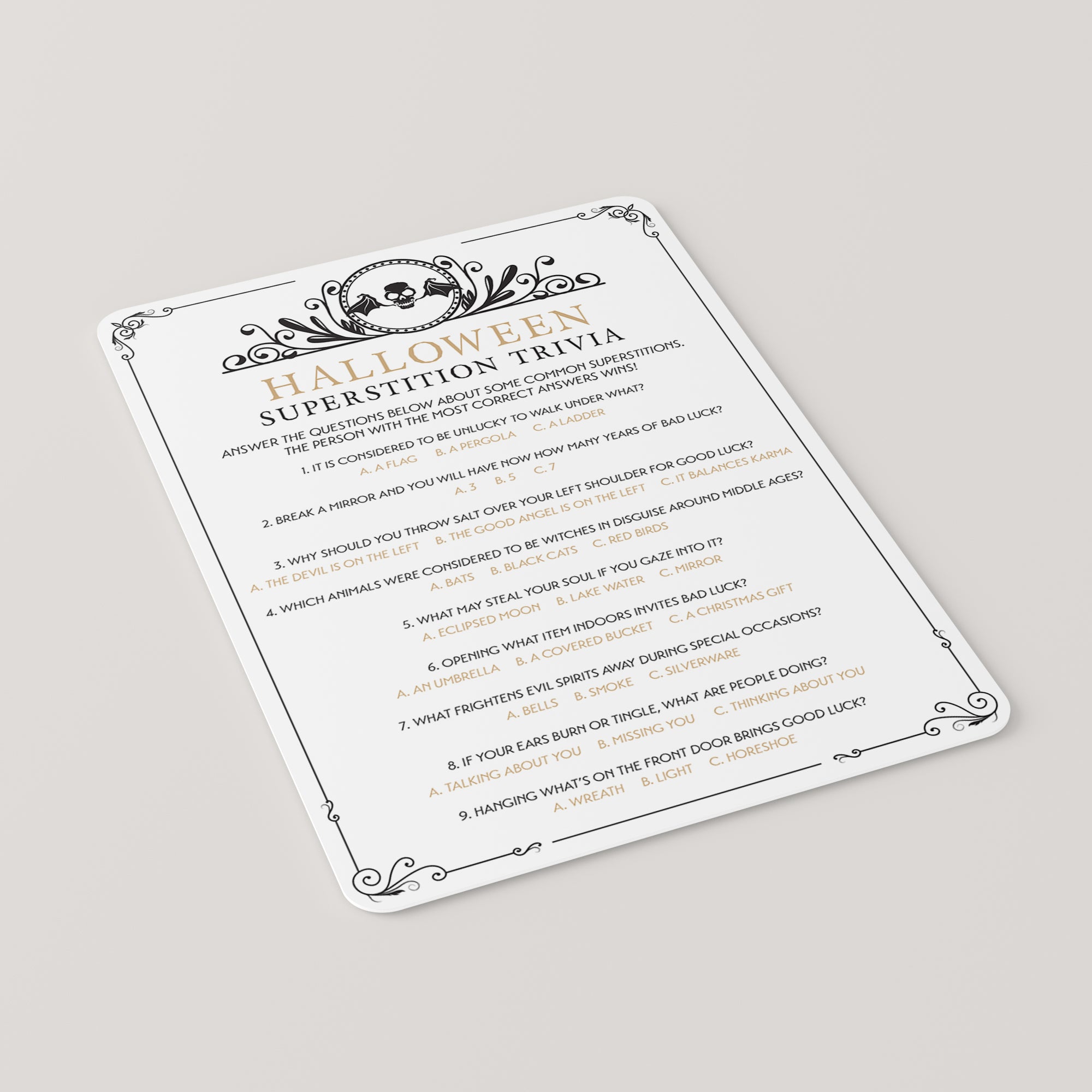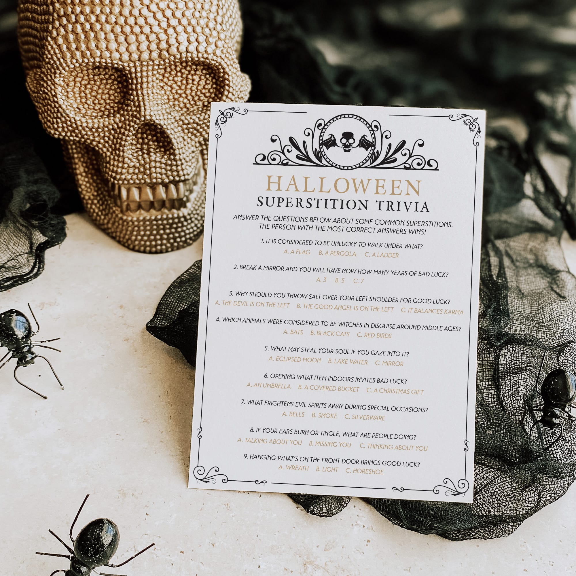 How much do you know about some common superstitions? Test your Halloween party guests knowledge with this black skull Halloween superstitions quiz. It’s a great challenging Halloween game to play at your Halloween party at work or Halloween family night.