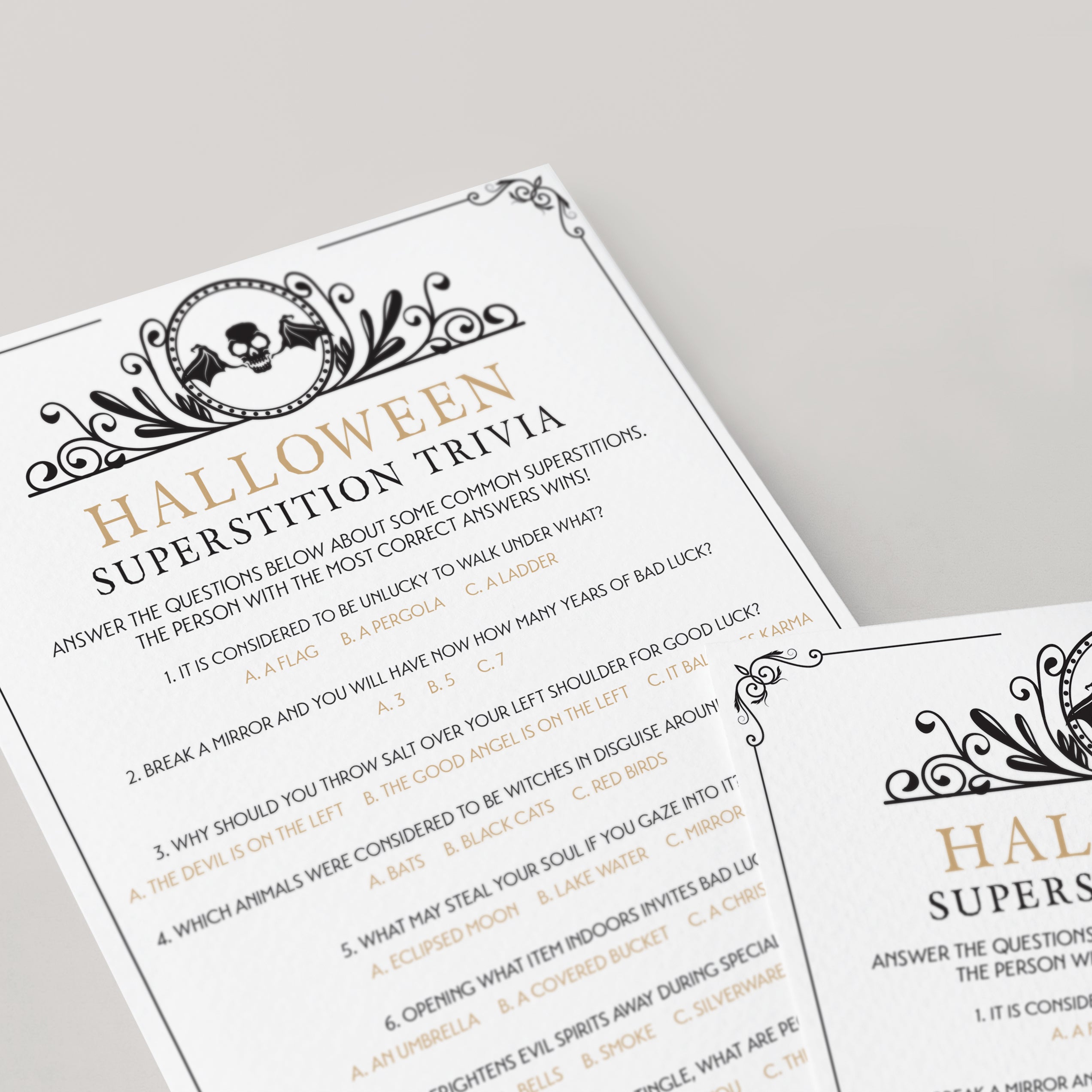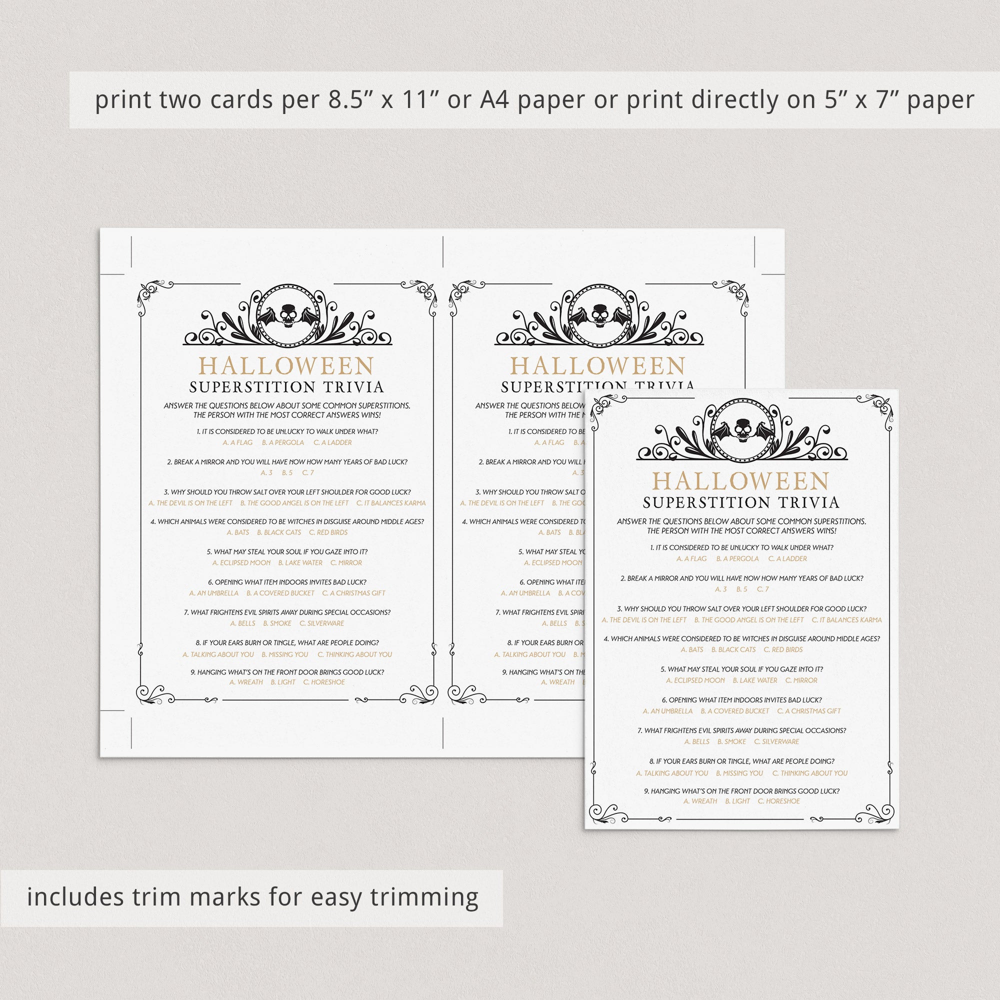 This black and gold Halloween Superstitions Quiz is an instant download. After purchase you will receive a download link immediately on screen. Also within minutes of your order and payment, an e-mail will be sent to you with a link for your download.