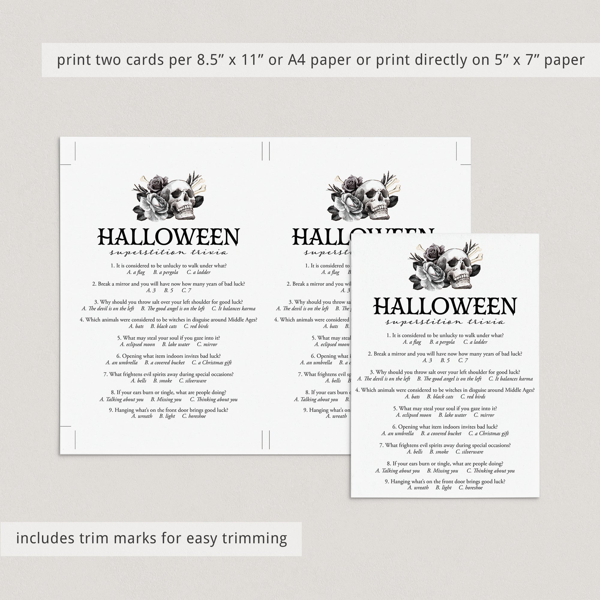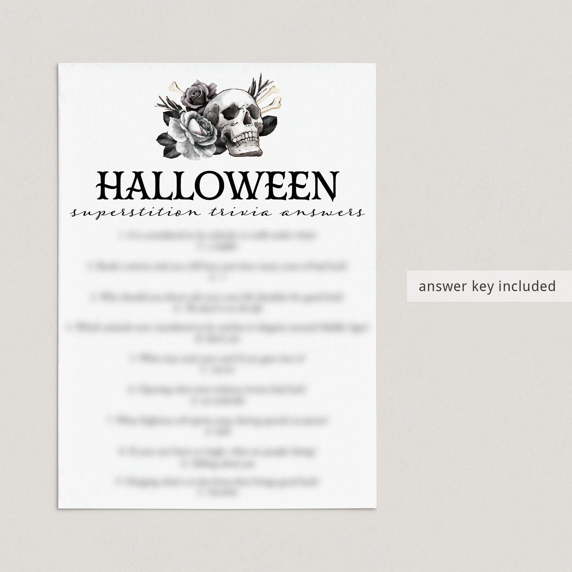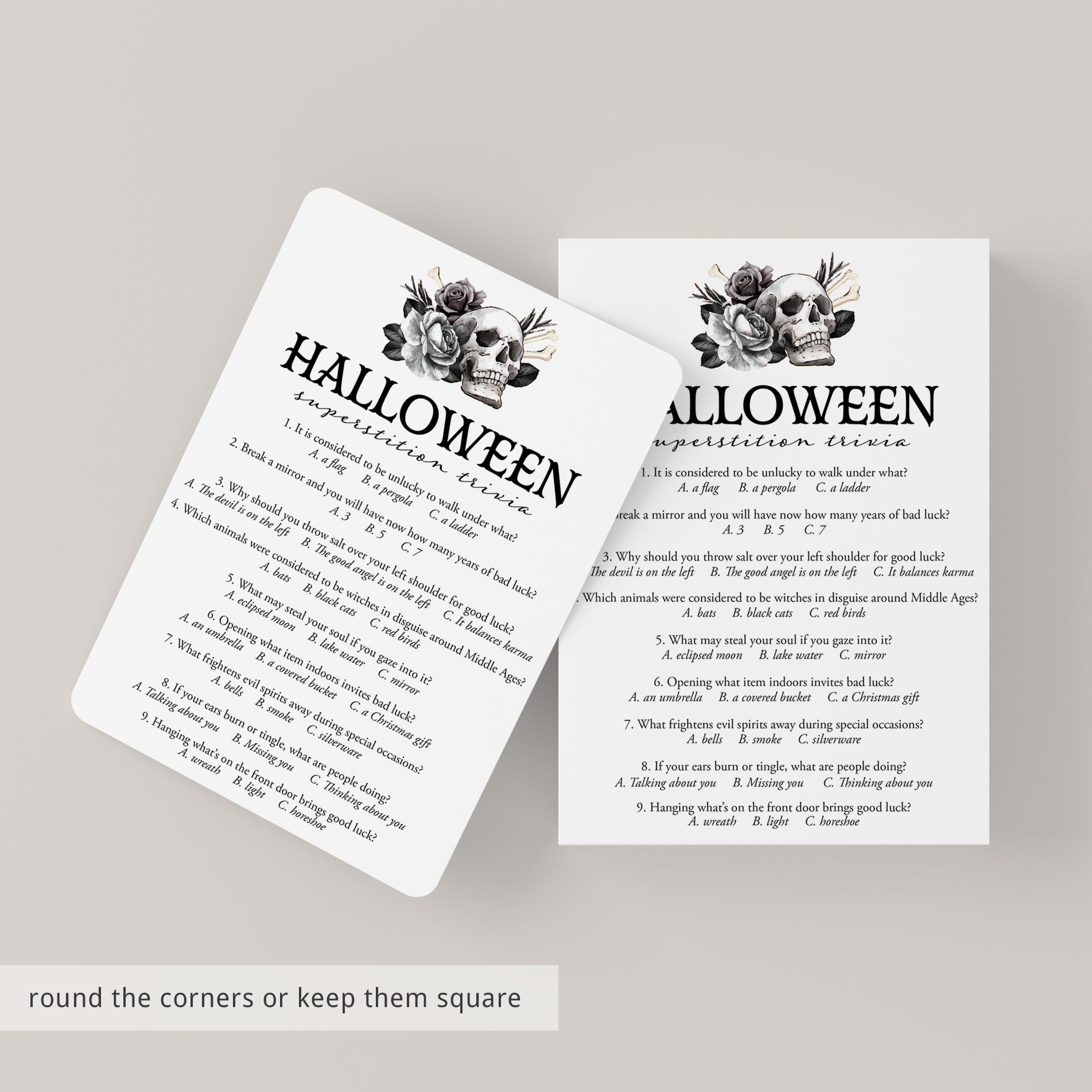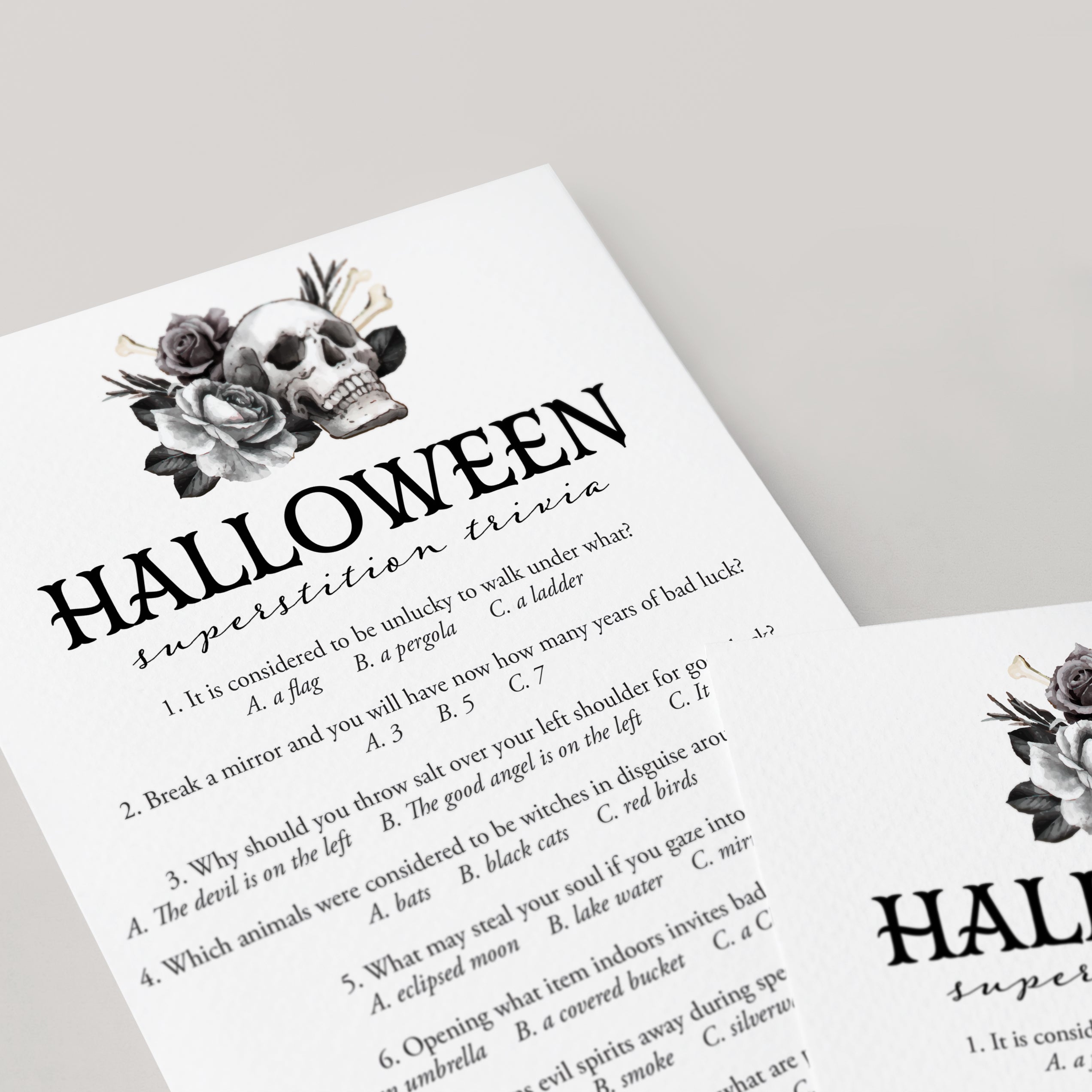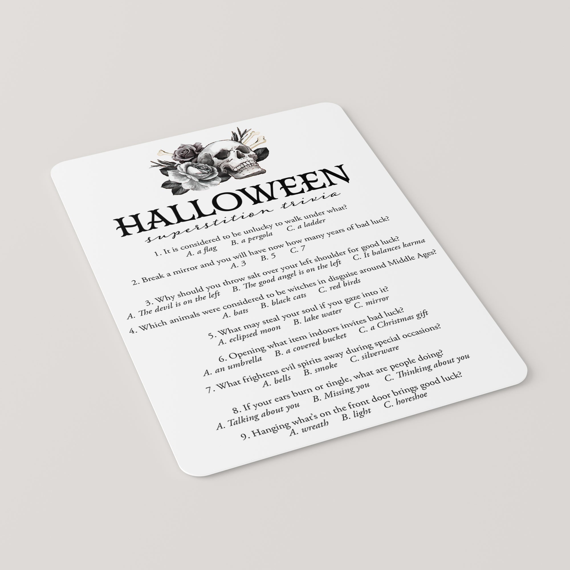 How much do you know about some common superstitions? Test your Halloween party guests knowledge with this Halloween superstition quiz with black floral skull. t’s a great challenging Halloween game to play at your Halloween party at work or Halloween ladies night.