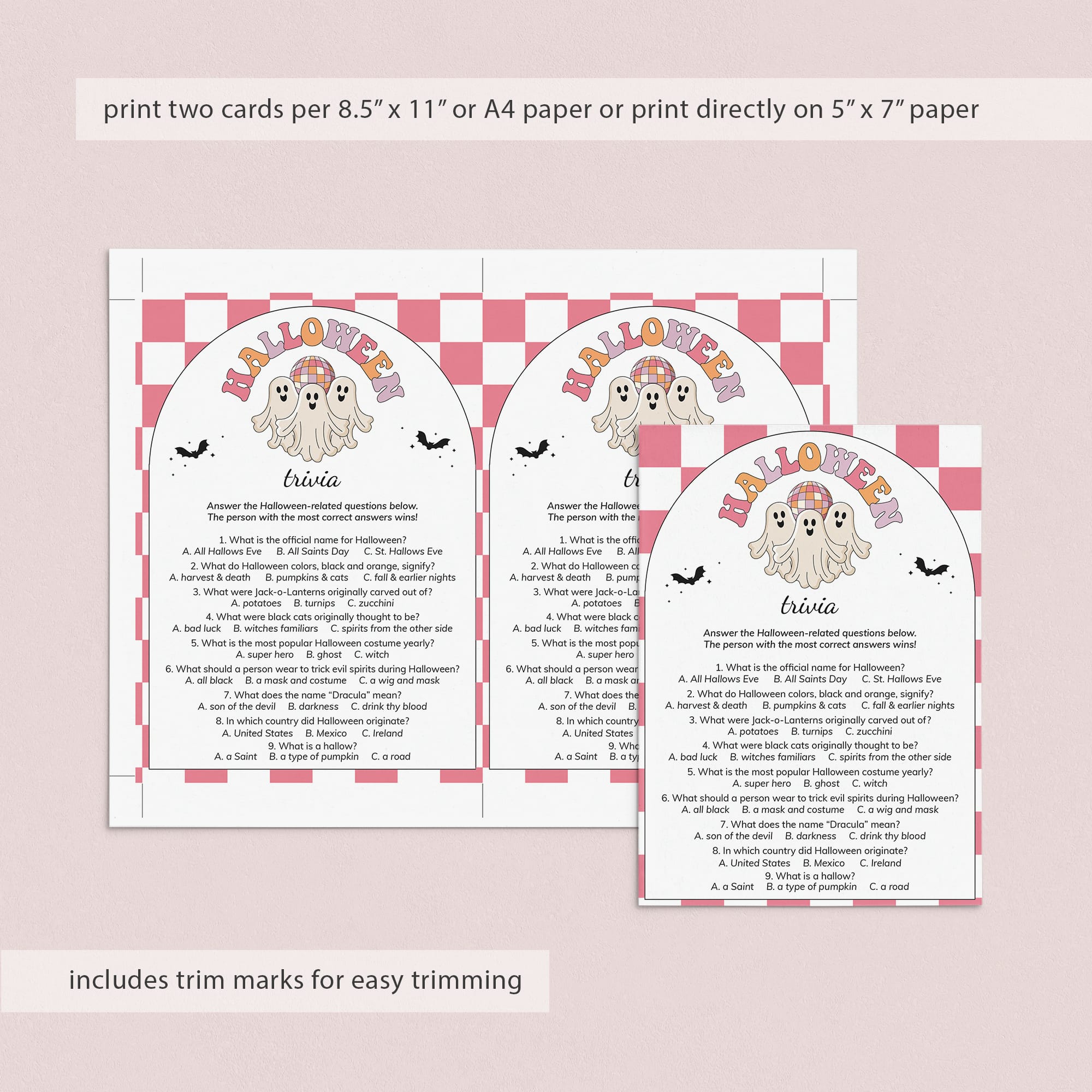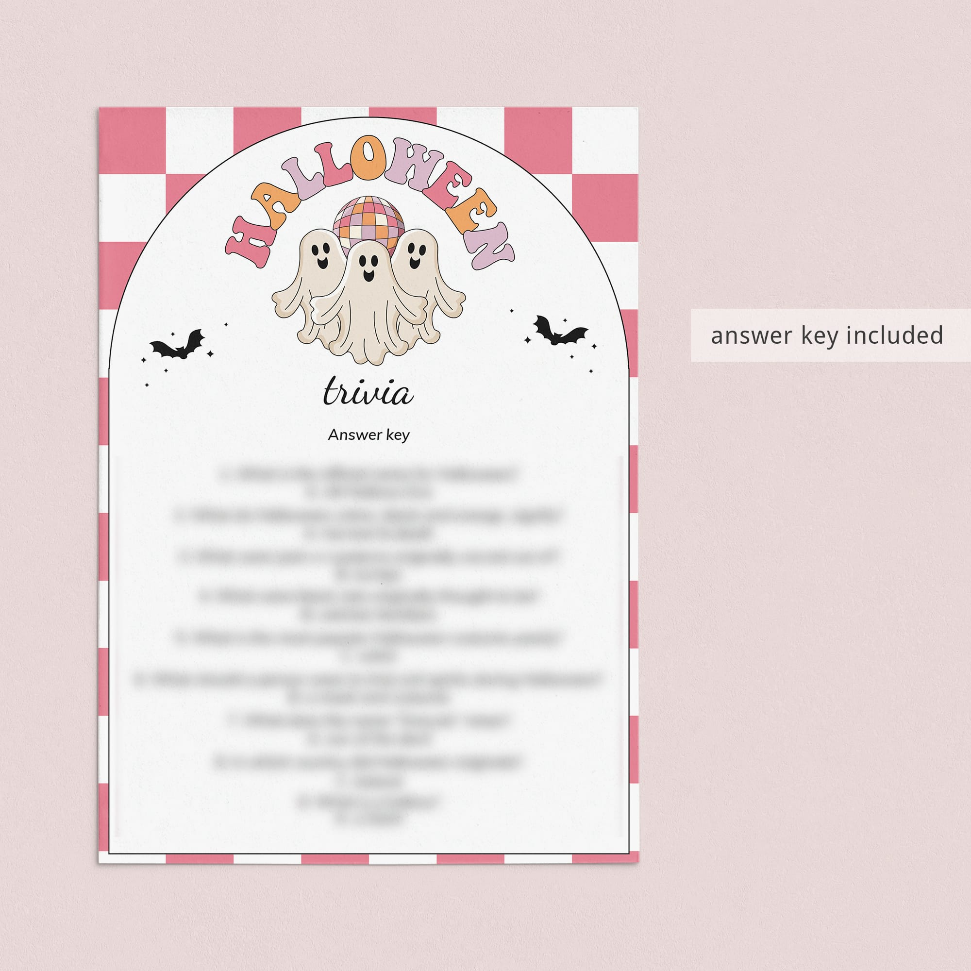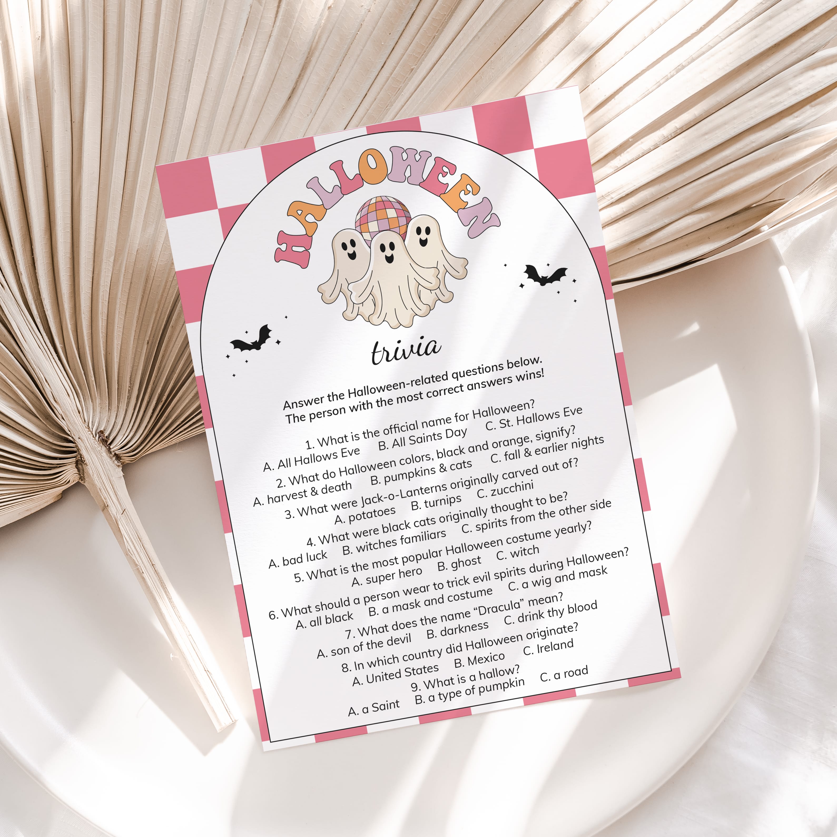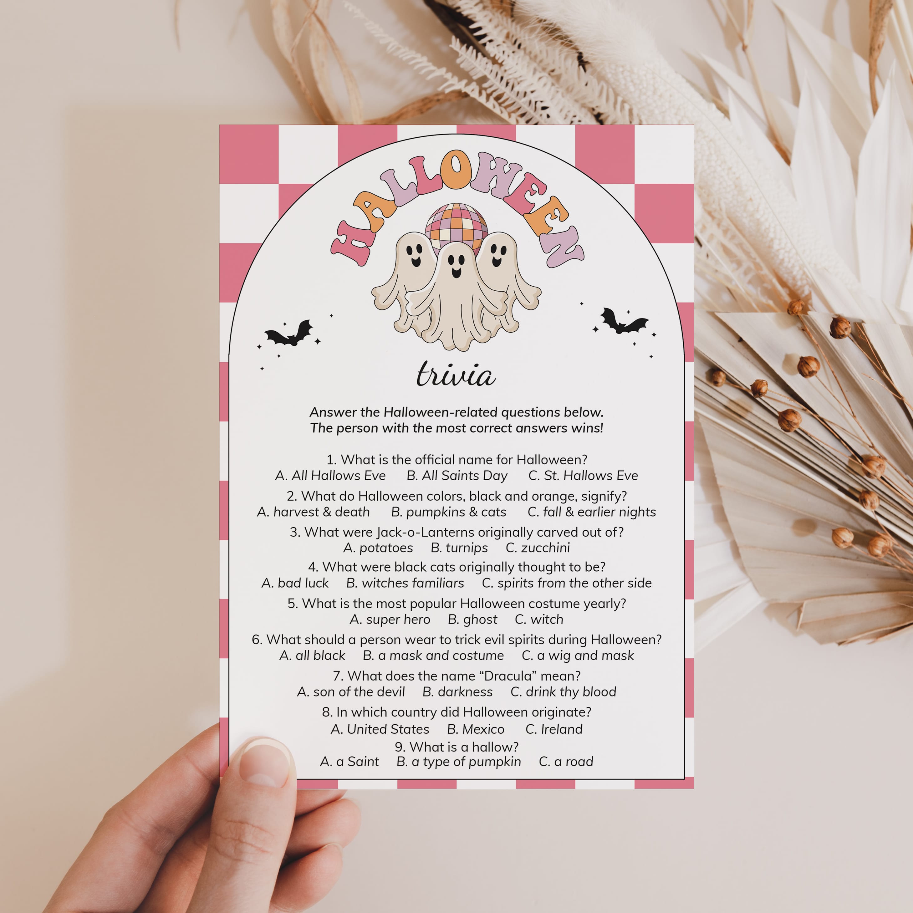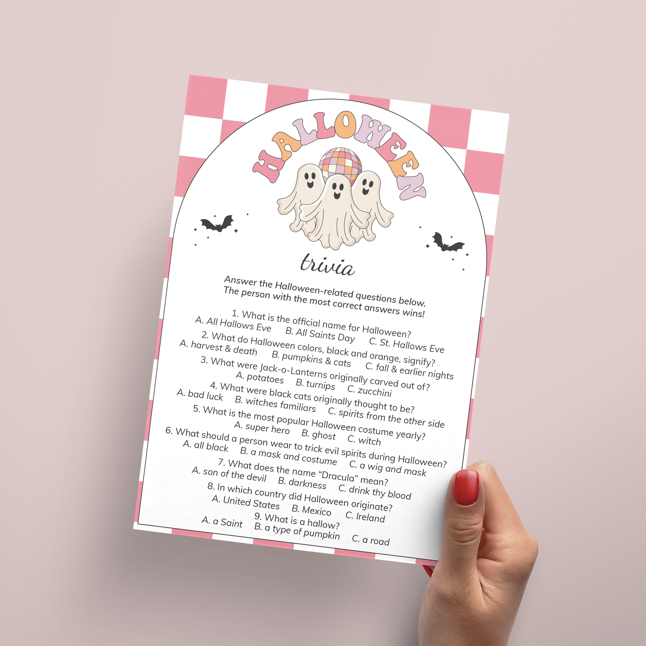 Are you hosting a Halloween Game Night? Use this retro spooky Halloween Trivia Quiz withcute ghosts to test your guests Halloween knowledge. What is the most popular Halloween costume? And what do the Halloween colors, orange and black, signify? Play this fun Halloween trivia game to find out!