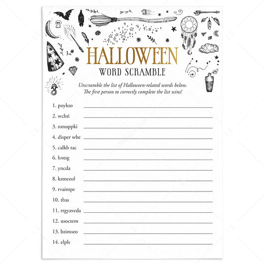 Word scrambles are so much fun! They are a great challenging activity that kids and adults can both enjoy. Add some fun to your Halloween party with this printable Halloween Word Scramble game featuring 14 spooky and scary Halloween themed words to unscramble. The vintage theme black and gold design...- $3.99