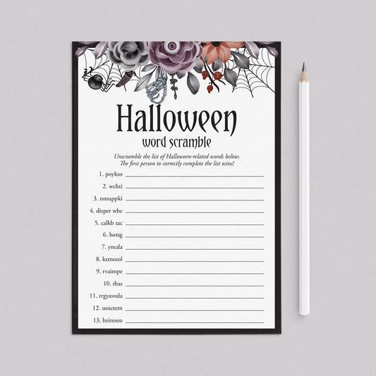 Words scramble games are so much fun! They are a great challenging activity for people of all ages. Add some fun to your Halloween party with this black floral Halloween Word Scramble game featuring 14 spooky and scary Halloween themed words to unscramble.Just in case you have...- $3.99