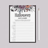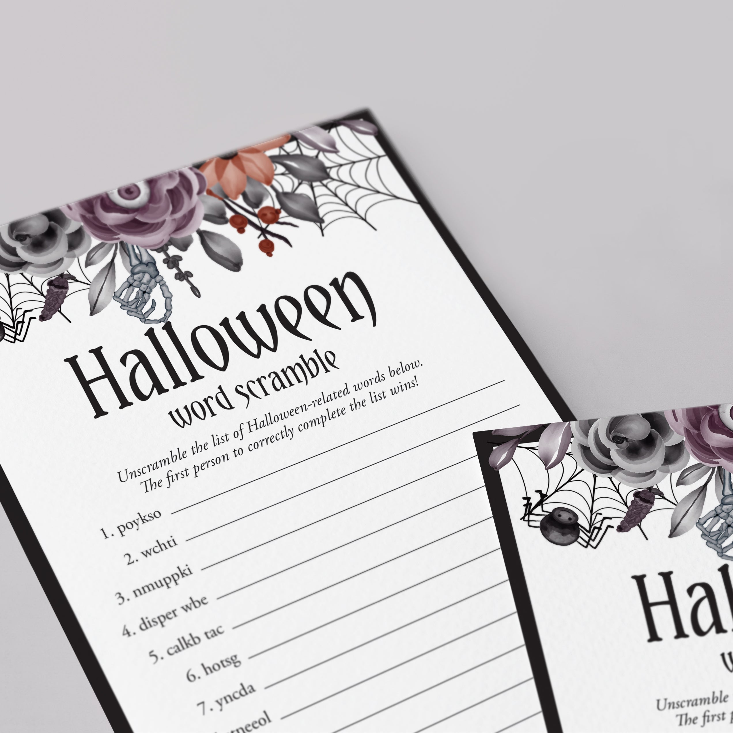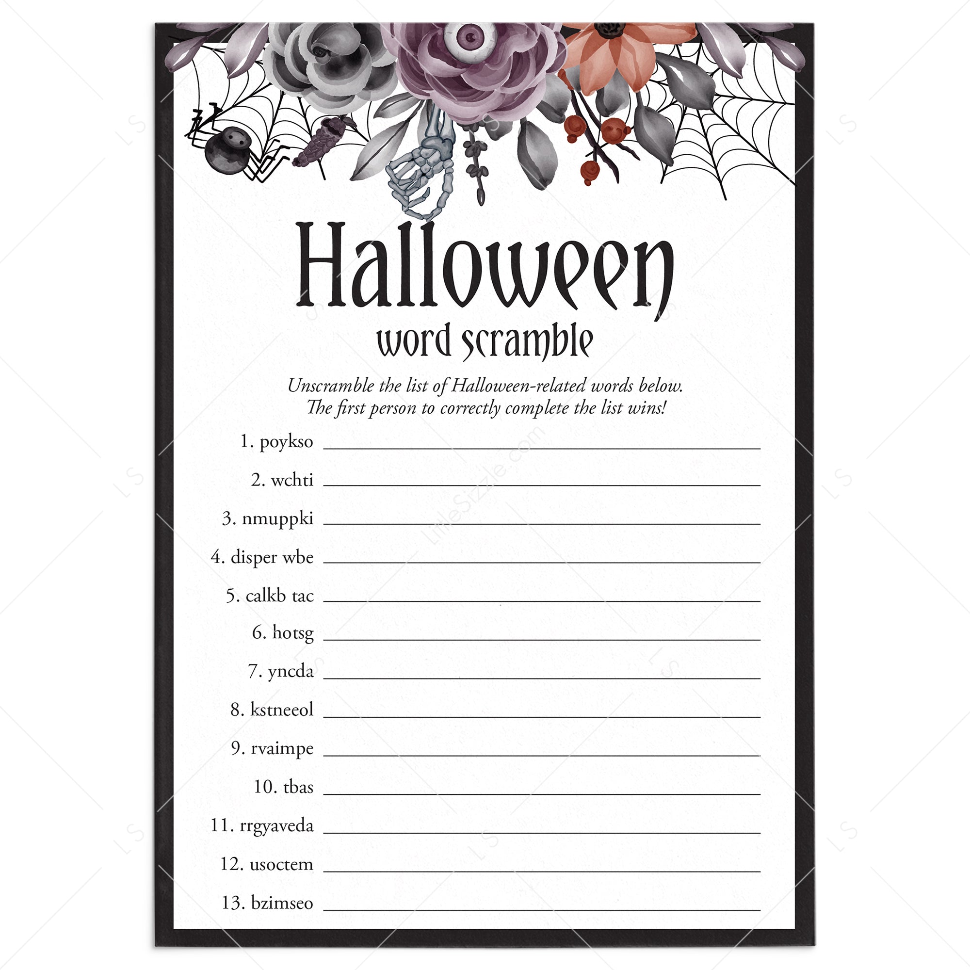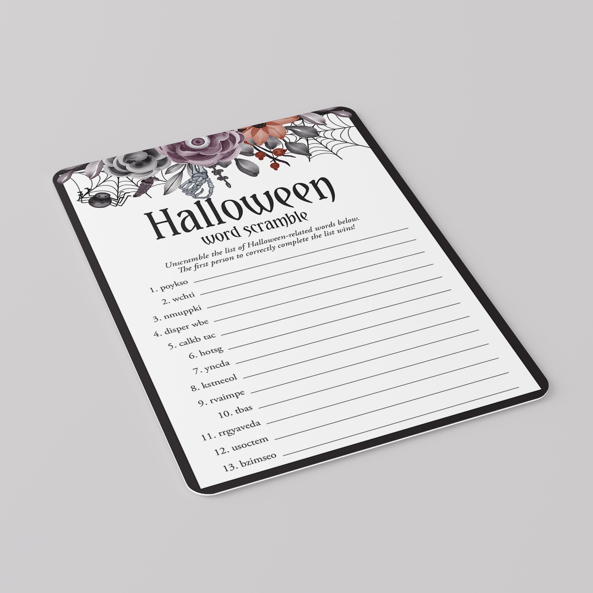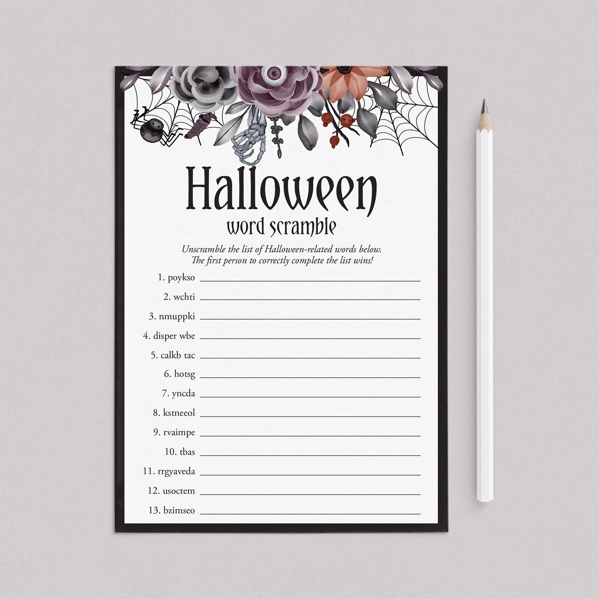 Word scrambles are so much fun! They are a great challenging activity that kids and adults can both enjoy. Add some fun to your Halloween bash with this creepy floral Halloween Word Scramble game featuring 13 Halloween themed words to unscramble.