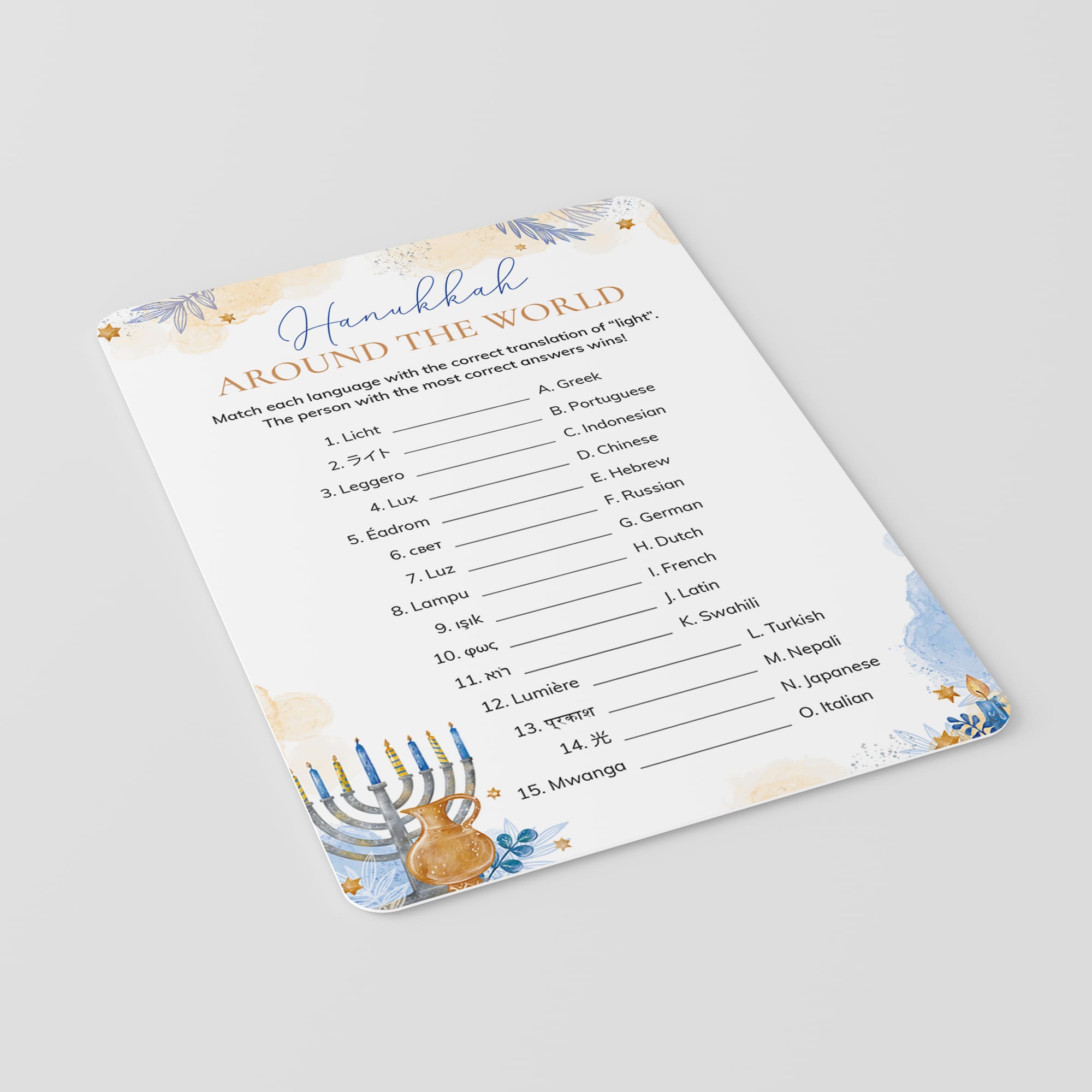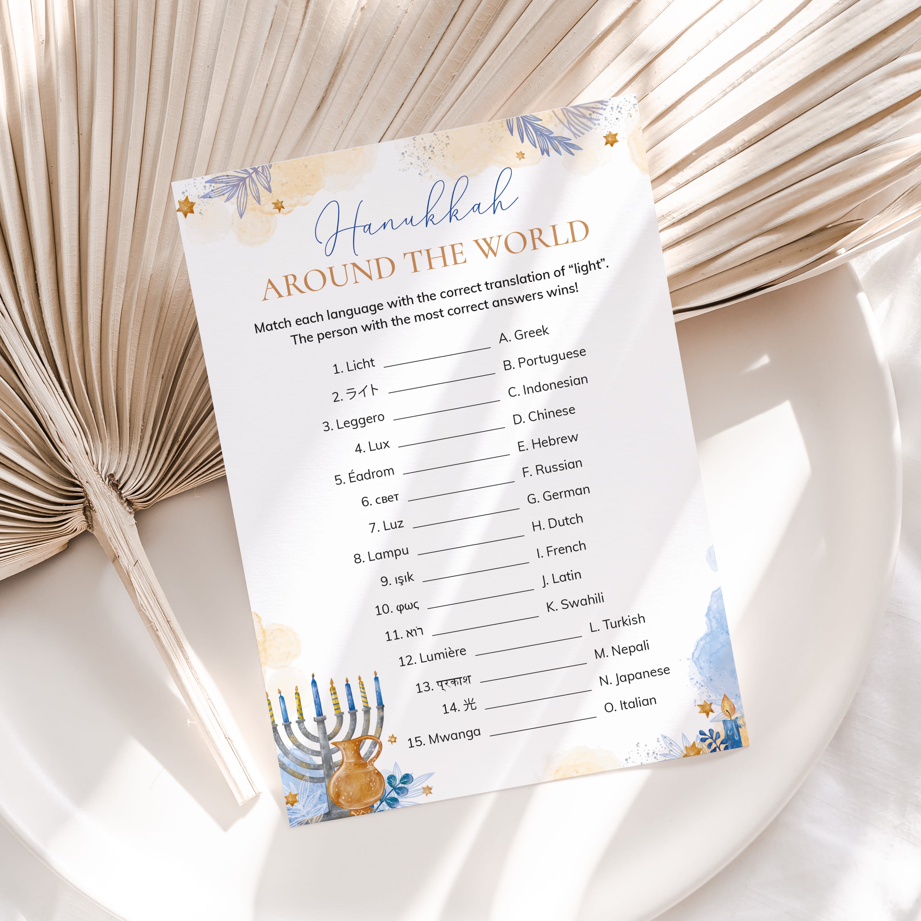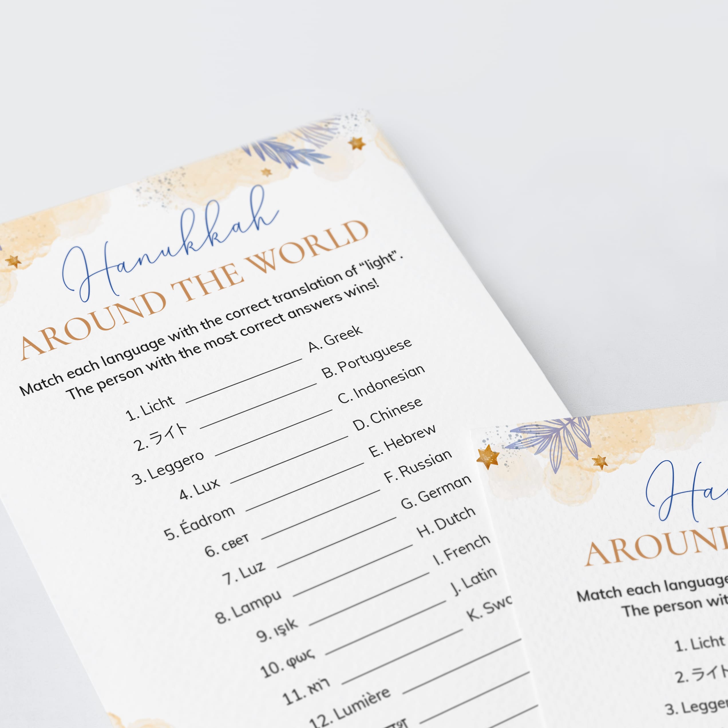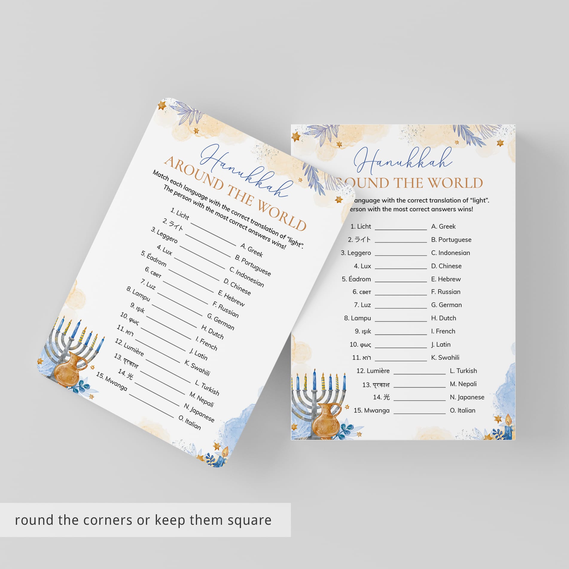 Find out how much you know about different languages and how they say "Light" around the world! Play this unique Hanukkah game with this gorgeous watercolor game card.