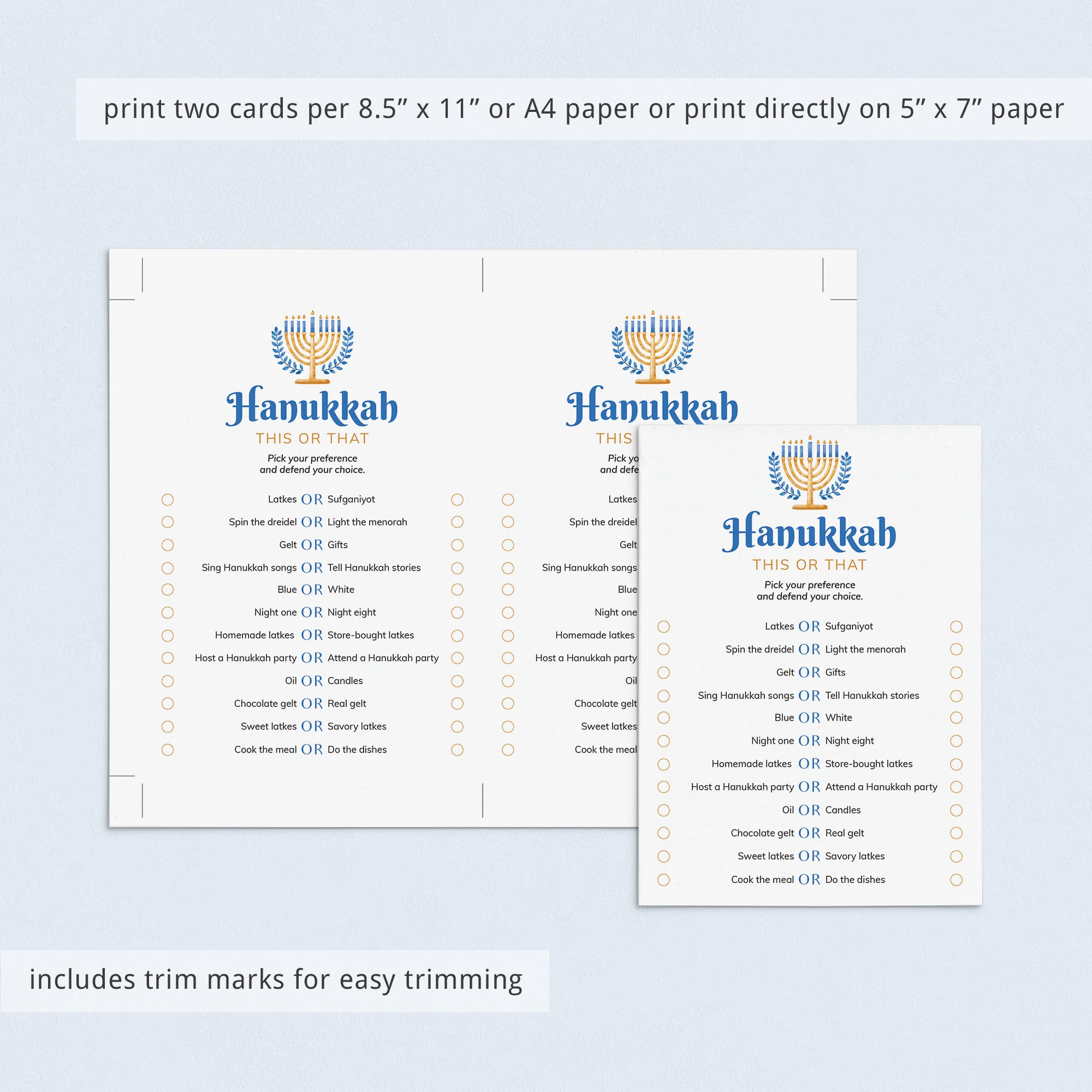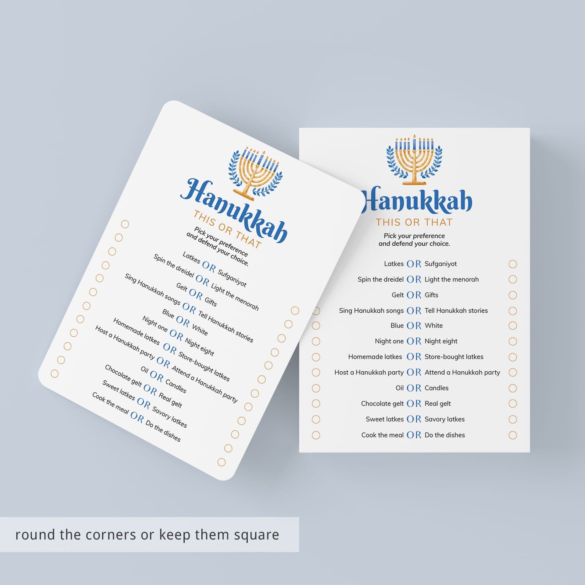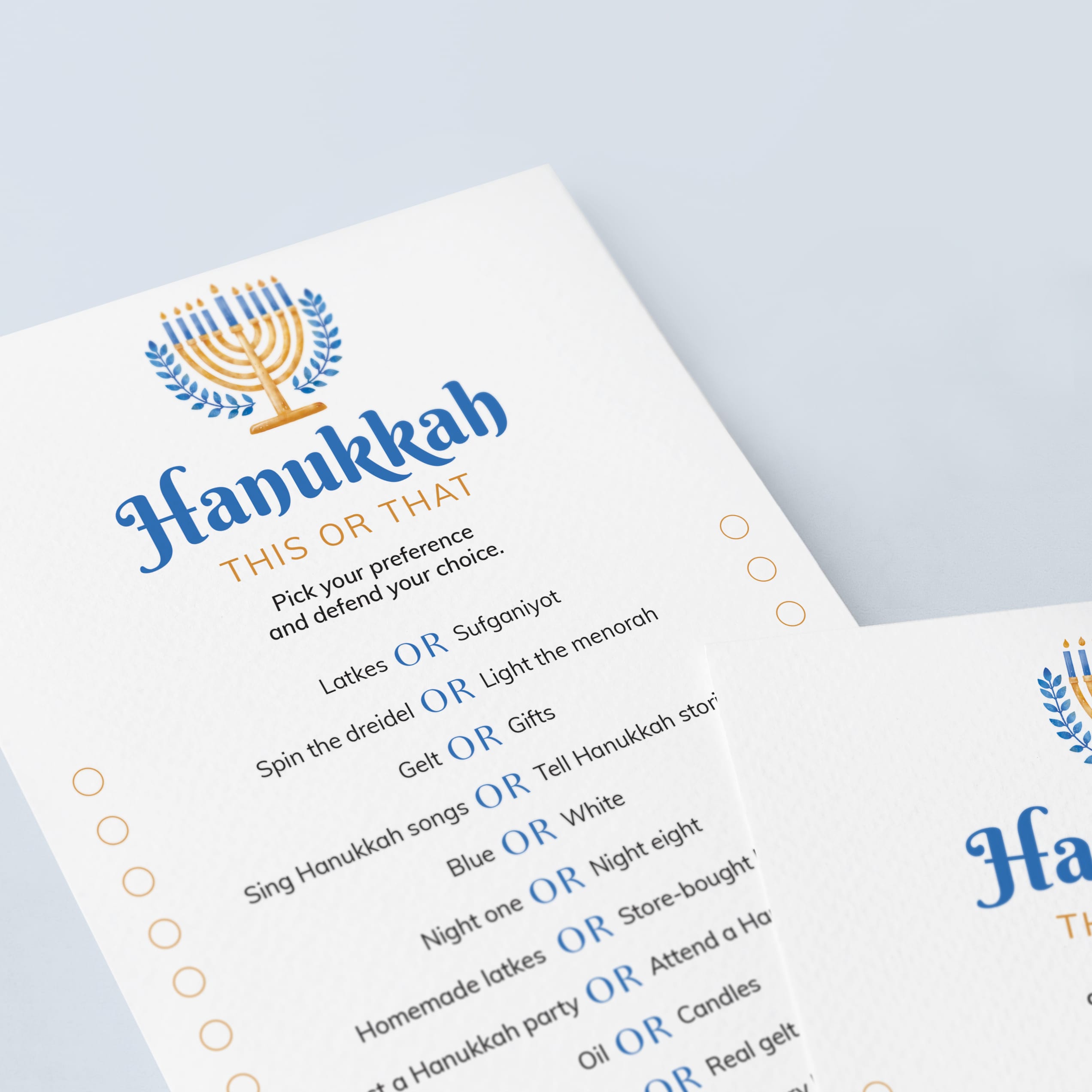 Are you looking for a fun icebreaker game for your Hanukkah party? Play This or That. It's is a great conversation starter and will definitely get your family and friends mingling and laughing. This This or That game with watercolor menorah has 11 Hanukkah-related This or That questions. Have your guests pick their preferences and defend their choice.