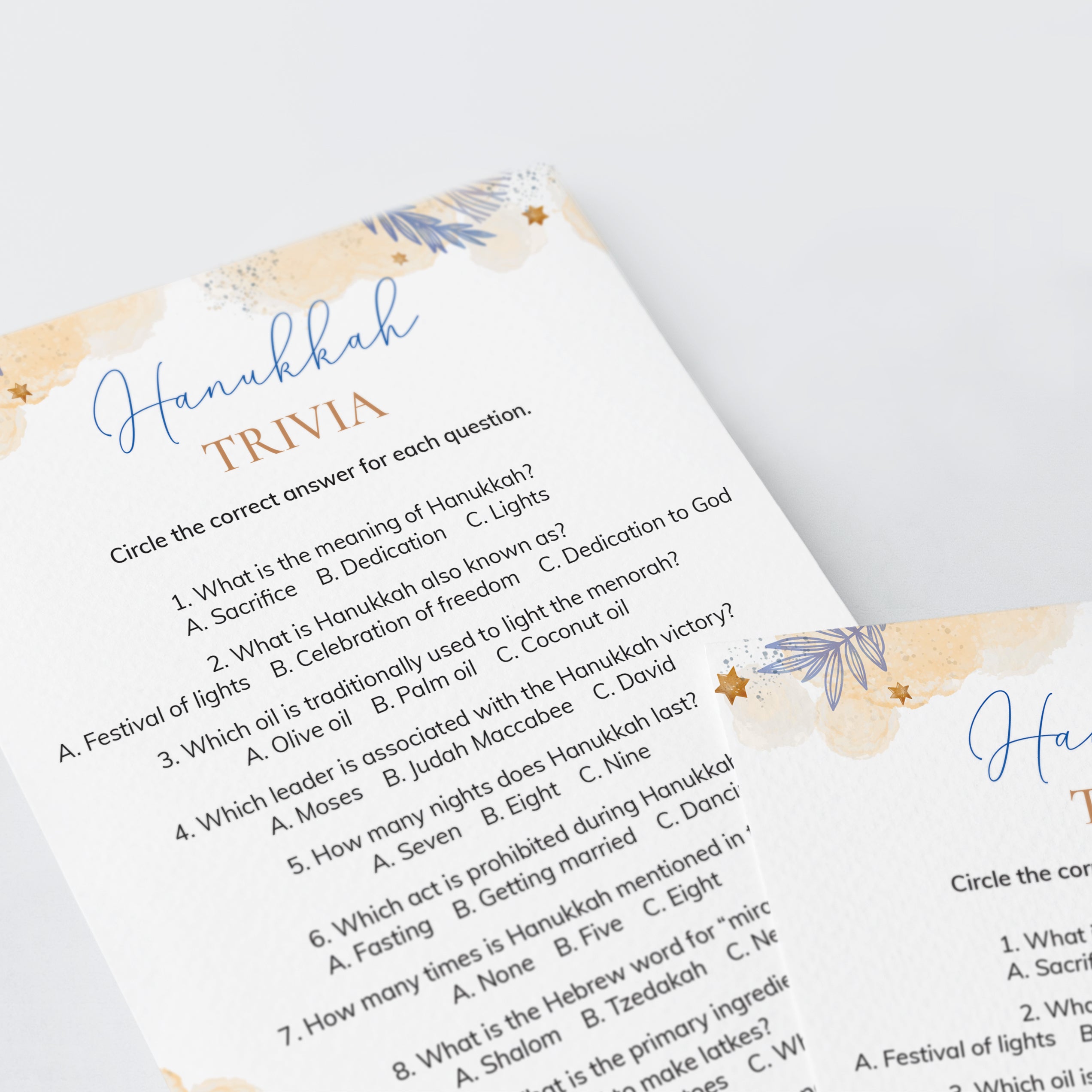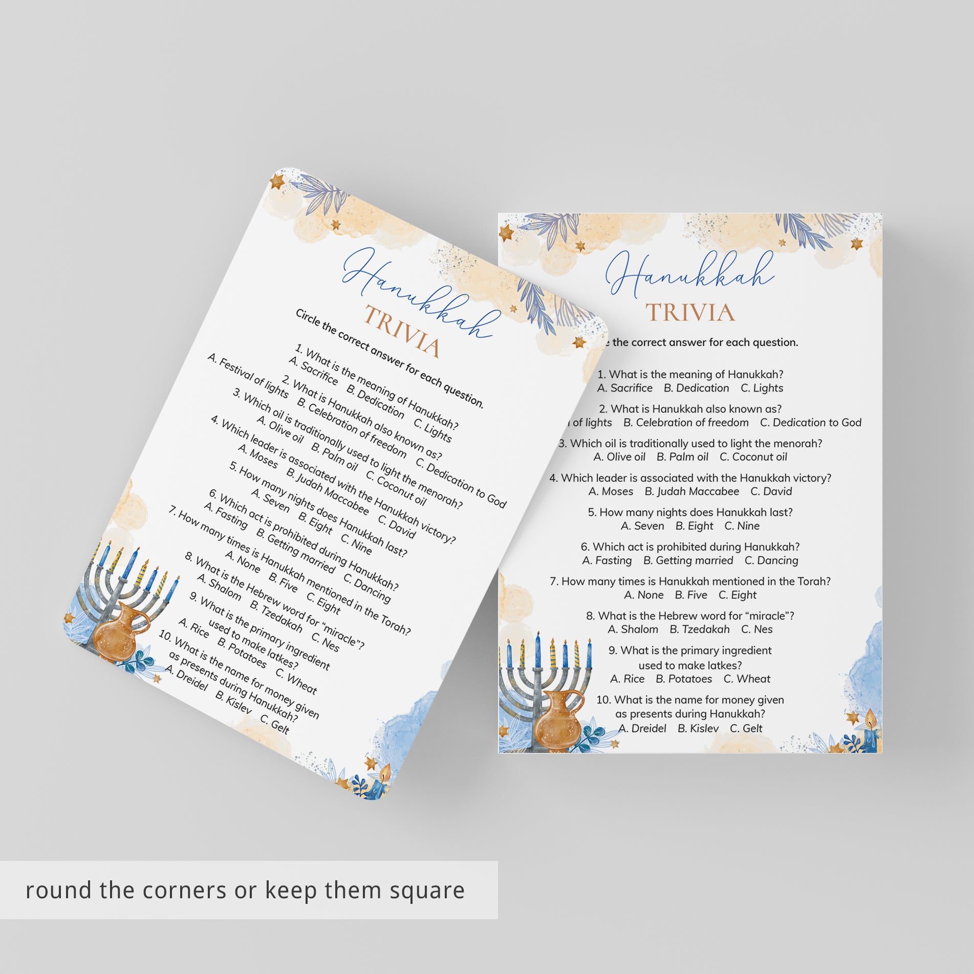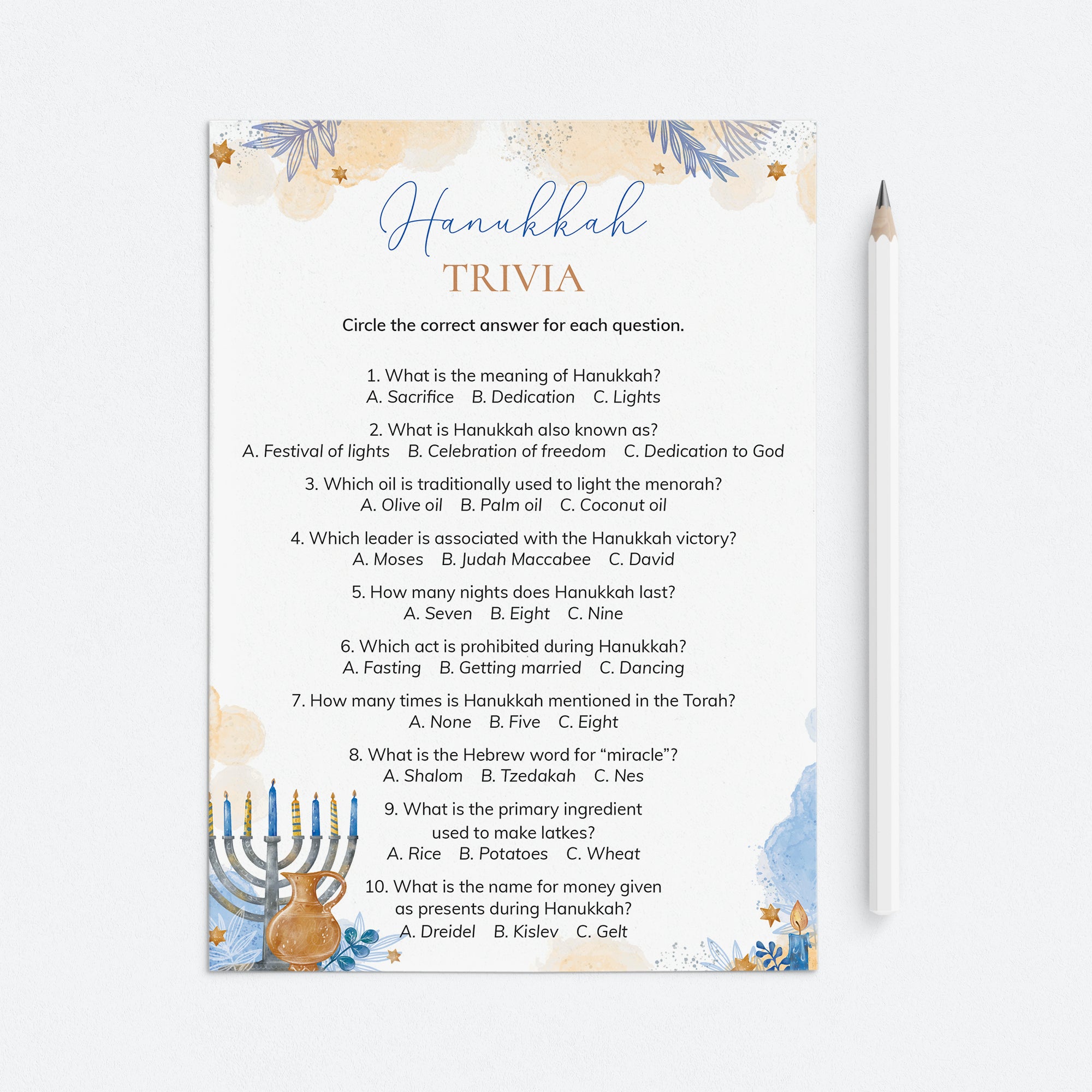 Are you hosting a Hanukkah celebration? Use this gorgeous Hanukkah Trivia to test your guests Hanukkah knowledge. What is the meaning of "Hanukkah"? And how many nights does Hanukkah last? Play this fun Hanukkah trivia game to find out! It’s a great challenging game for all ages.