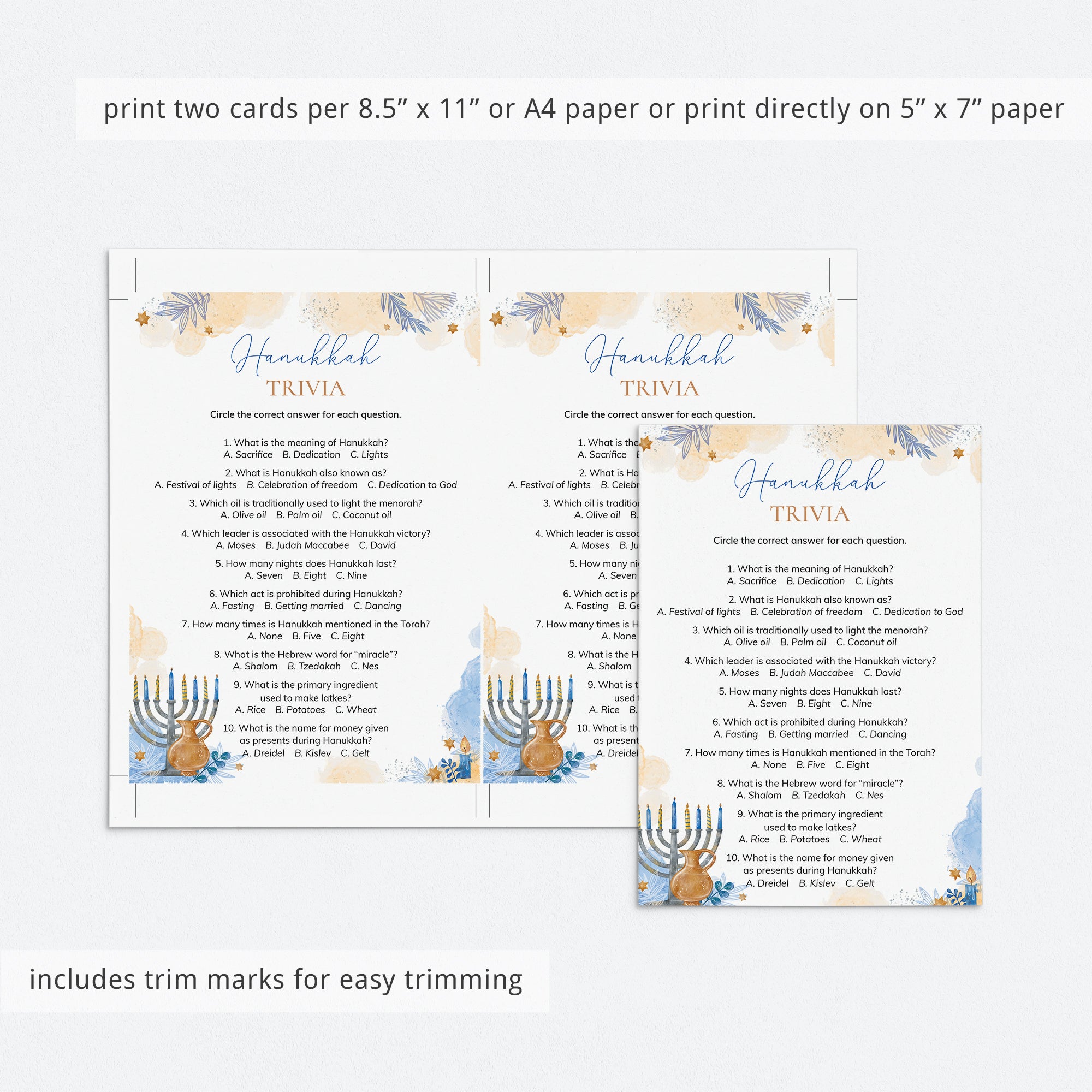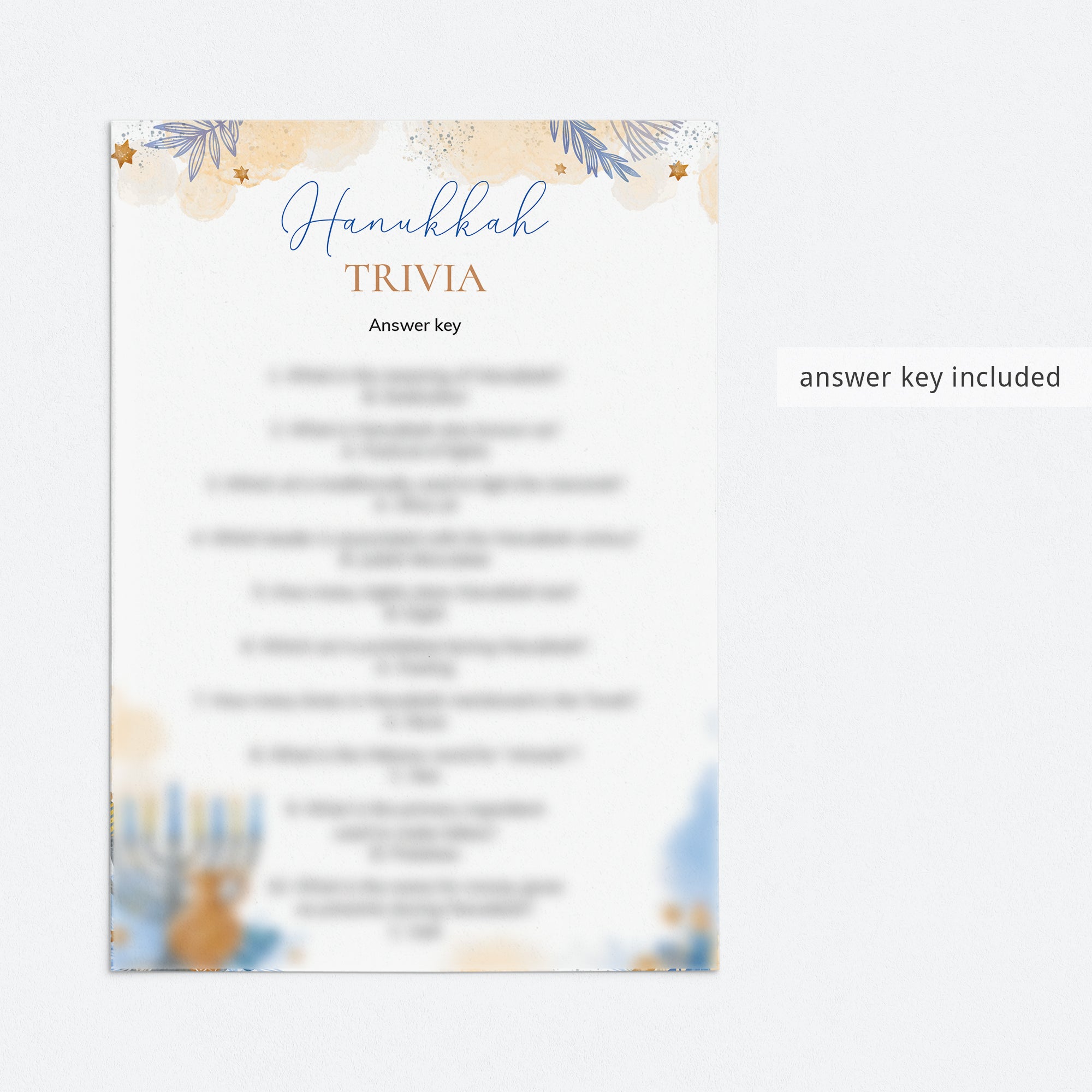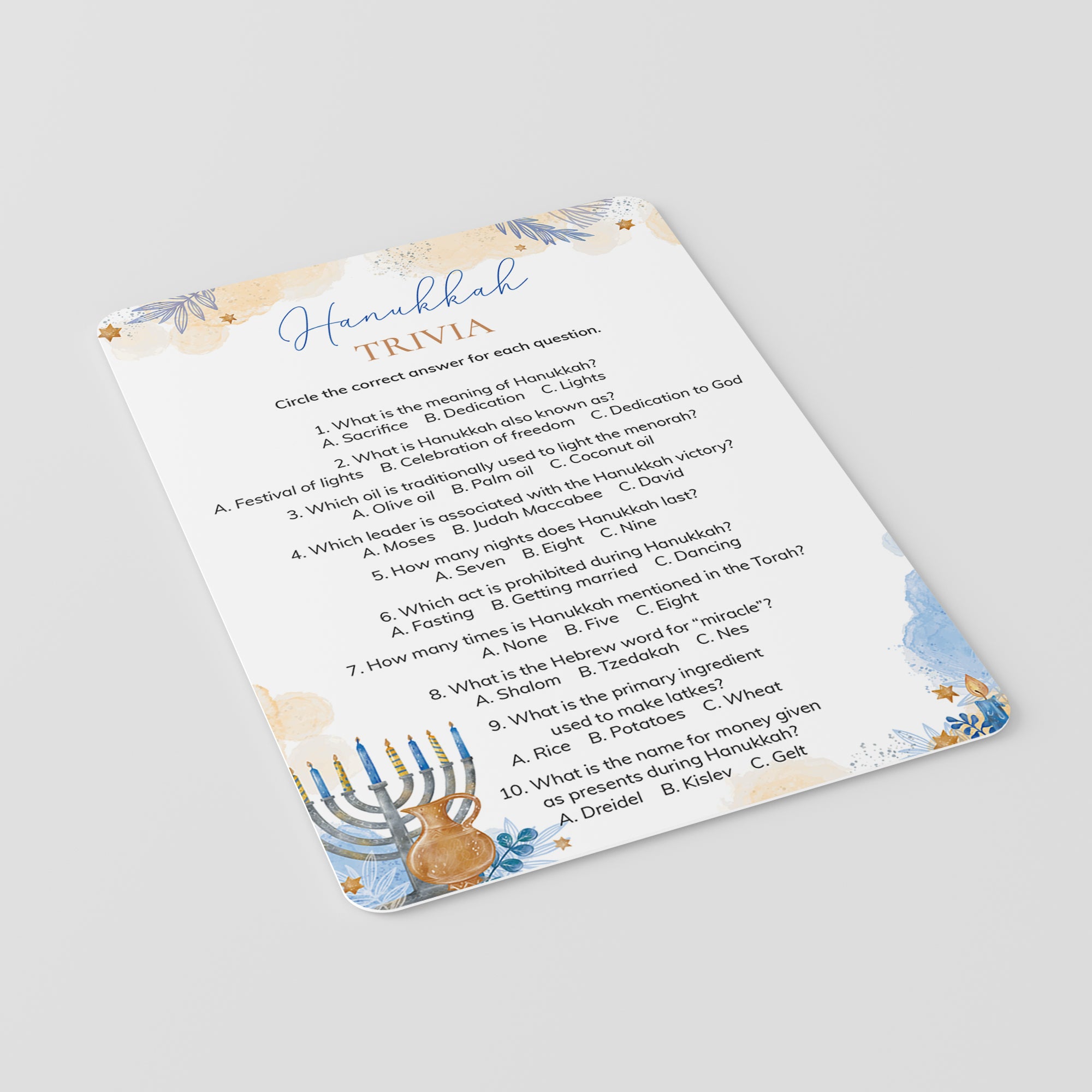 Are you hosting a Hanukkah celebration? Use this gorgeous Hanukkah Trivia to test your guests Hanukkah knowledge. What is the meaning of "Hanukkah"? And how many nights does Hanukkah last? Play this fun Hanukkah trivia game to find out! It’s a great challenging game for all ages.