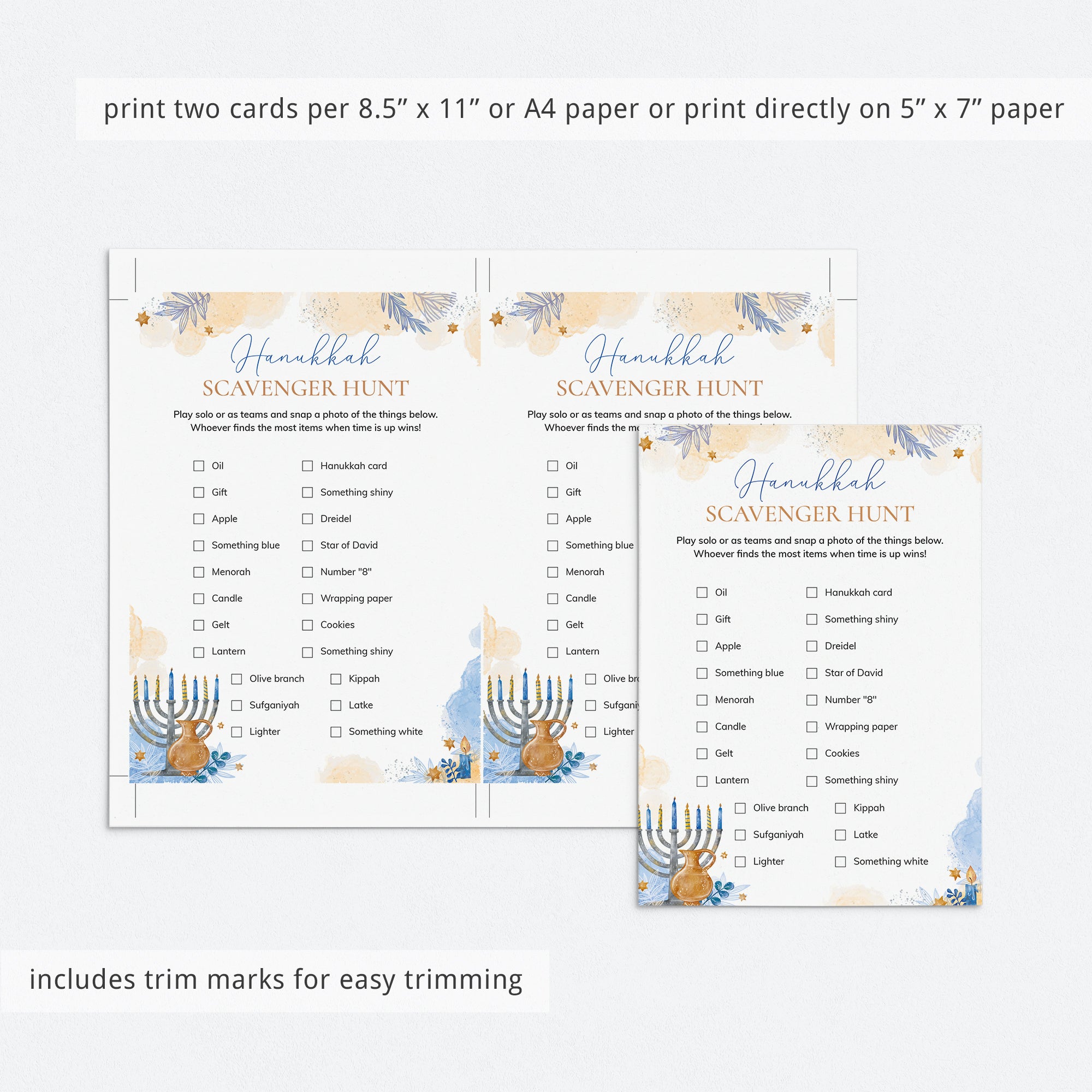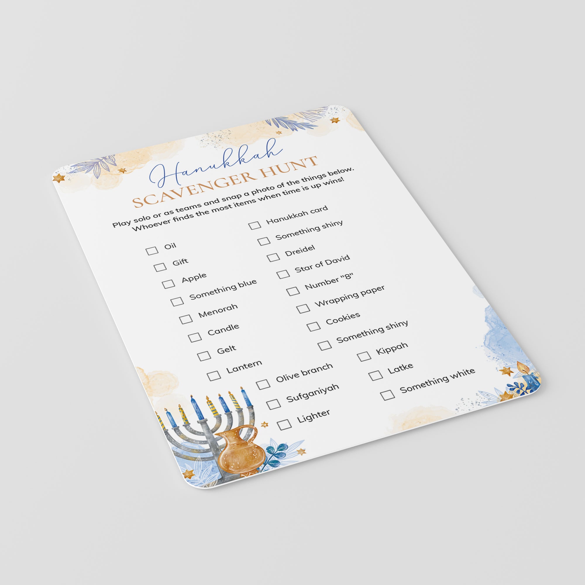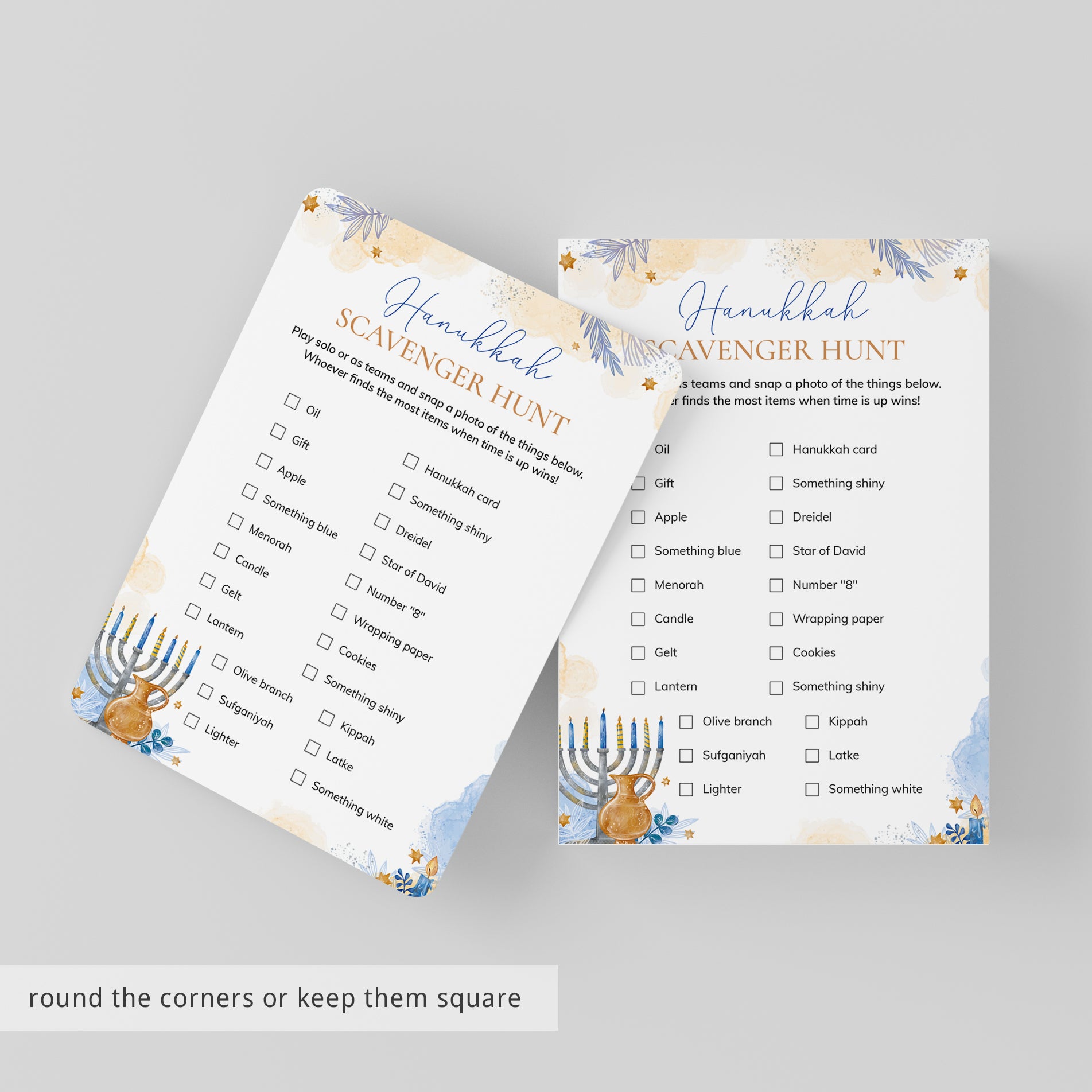 Add extra fun to your Hanukkah celebration with this Hanukkah Scavenger Hunt game for kids and adults. Let your family and friends play solo or in teams and snap a photo with the things listed on the game card. The person or team who finishes first wins!