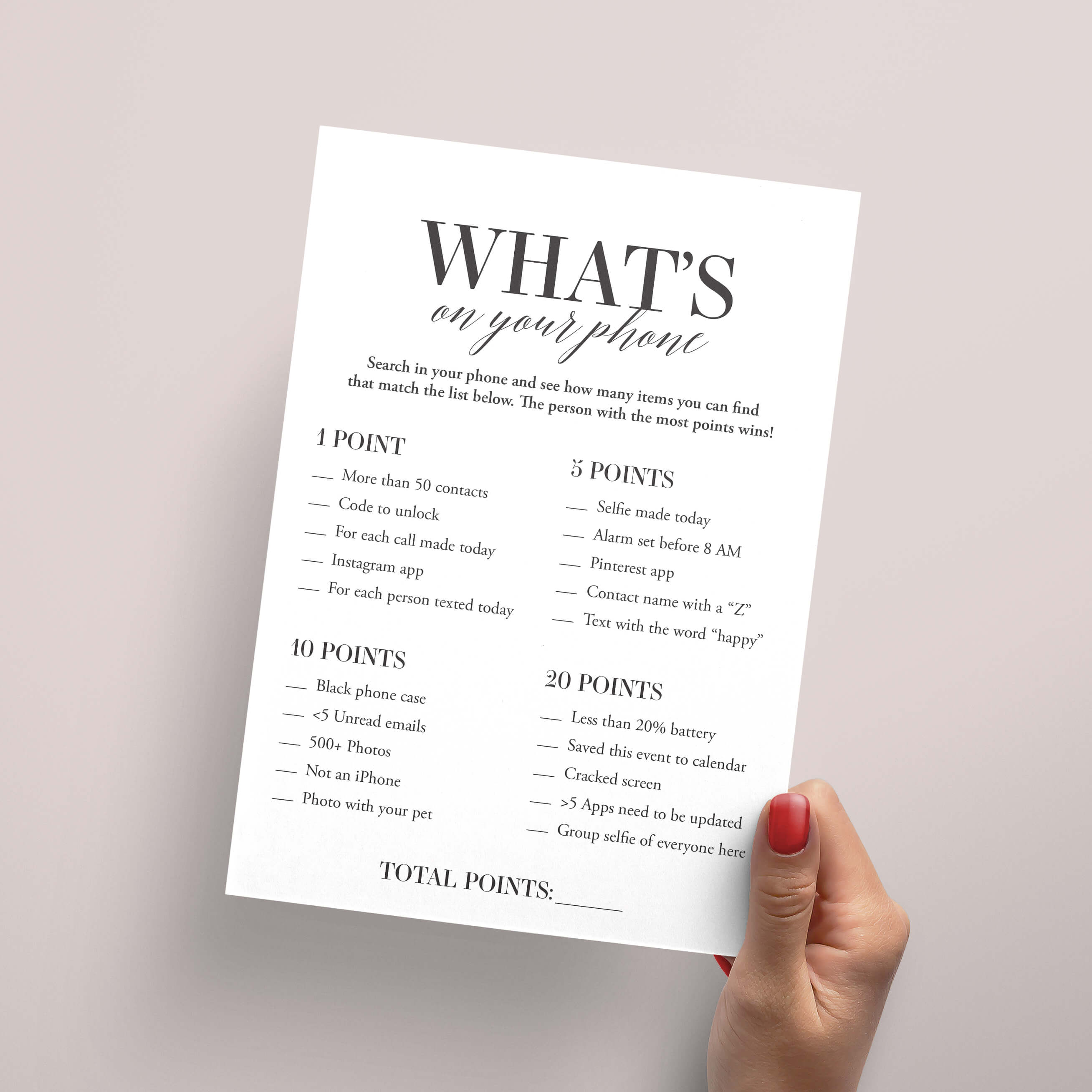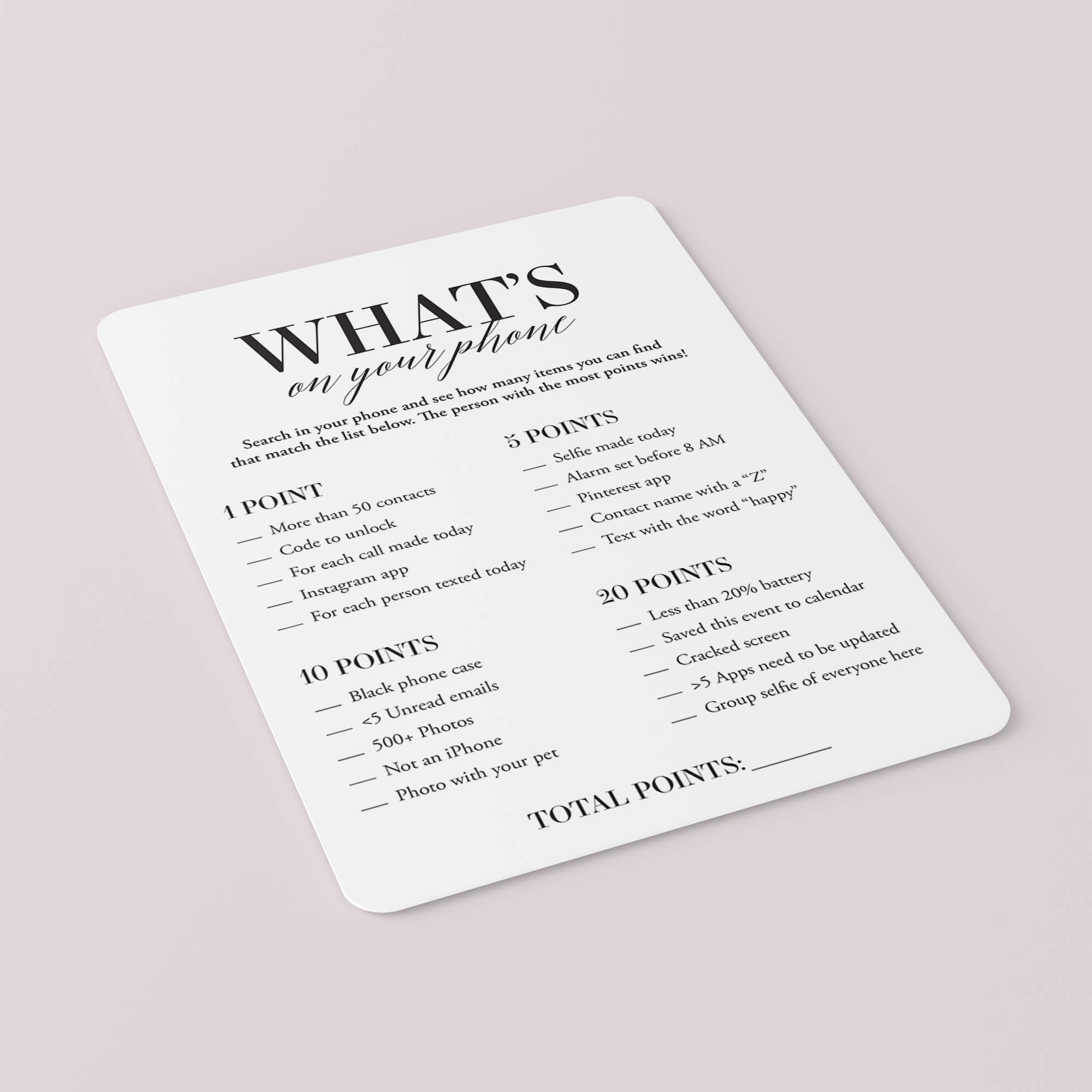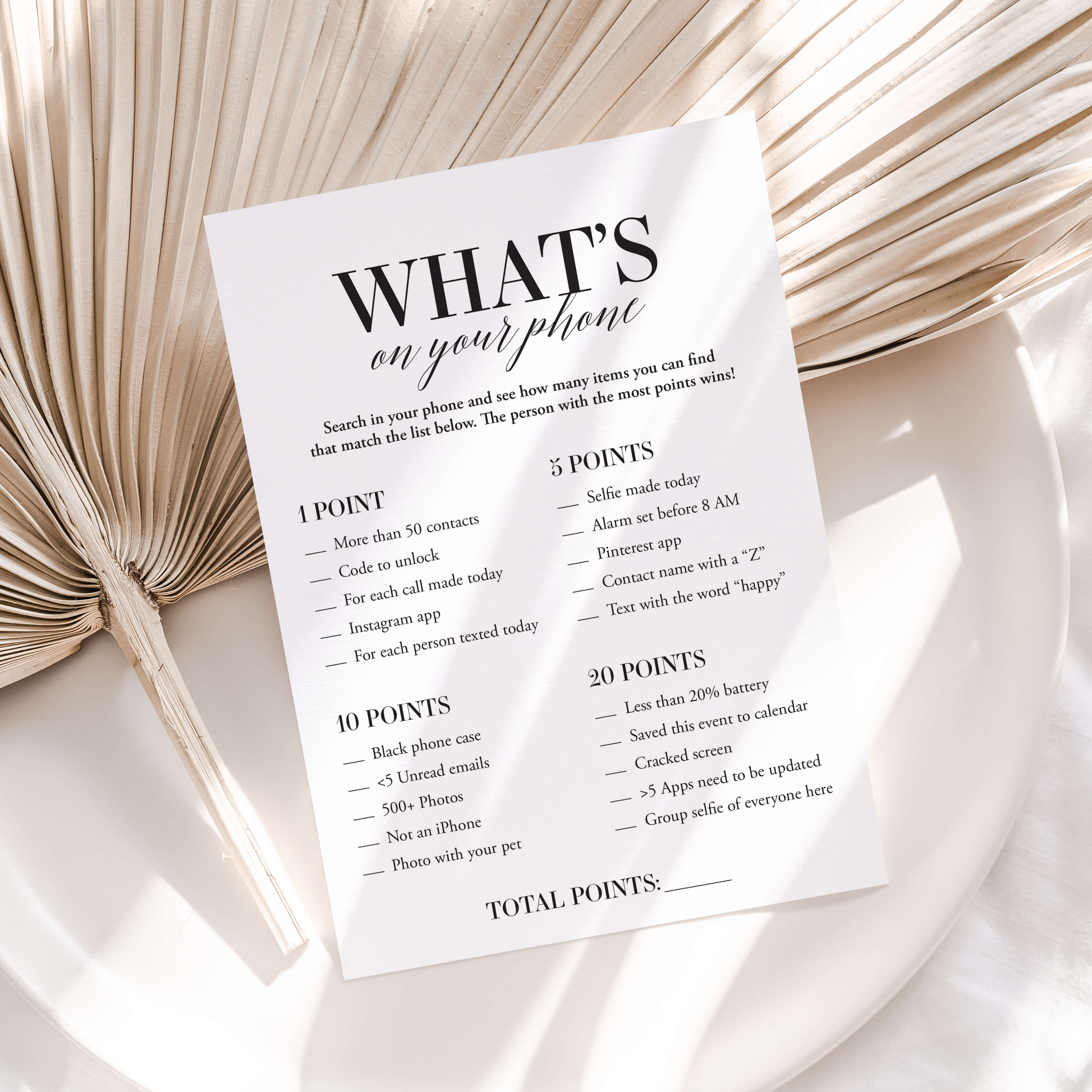 All your guests need to play is a smartphone and one of these minimalist black and white What's On Your Phone game cards.