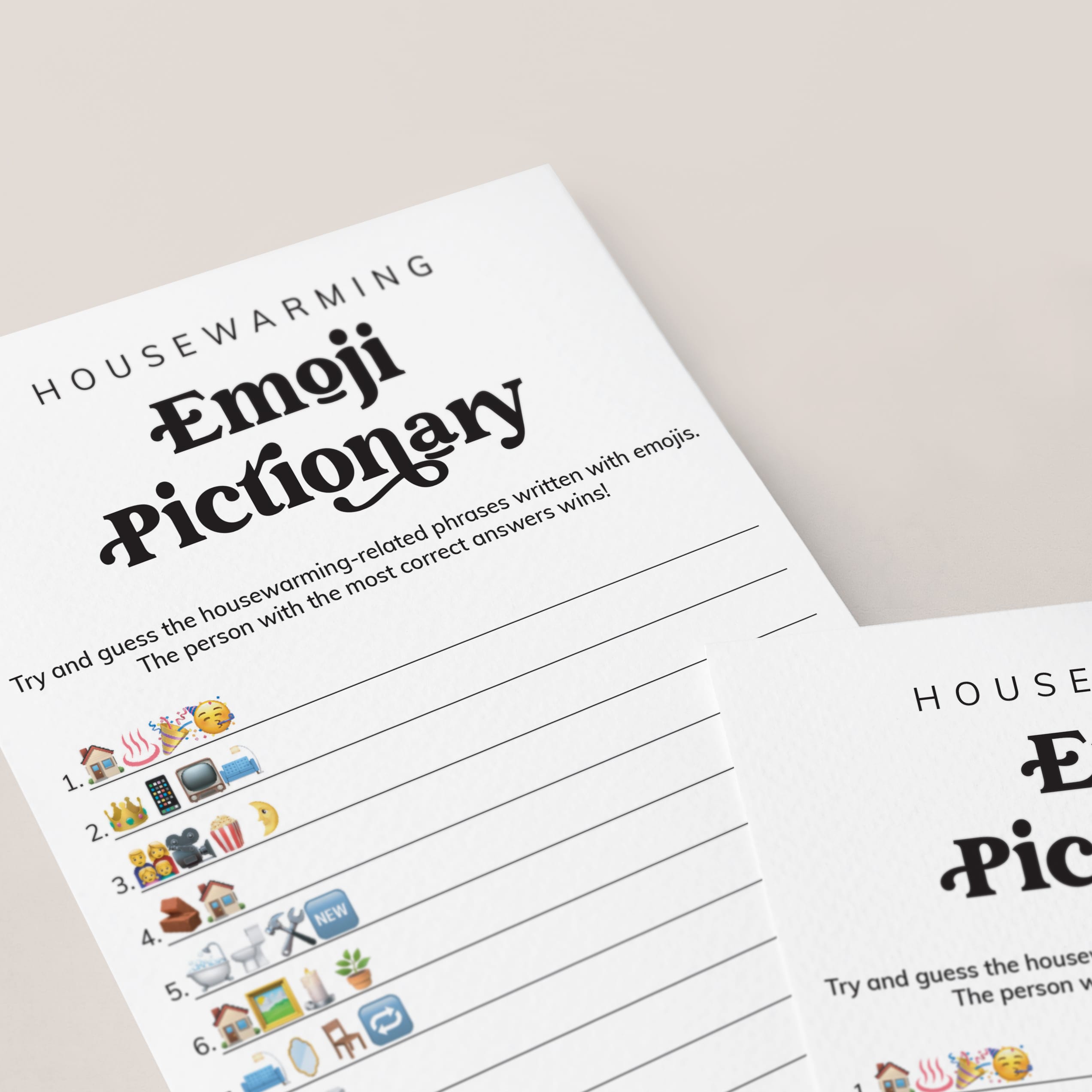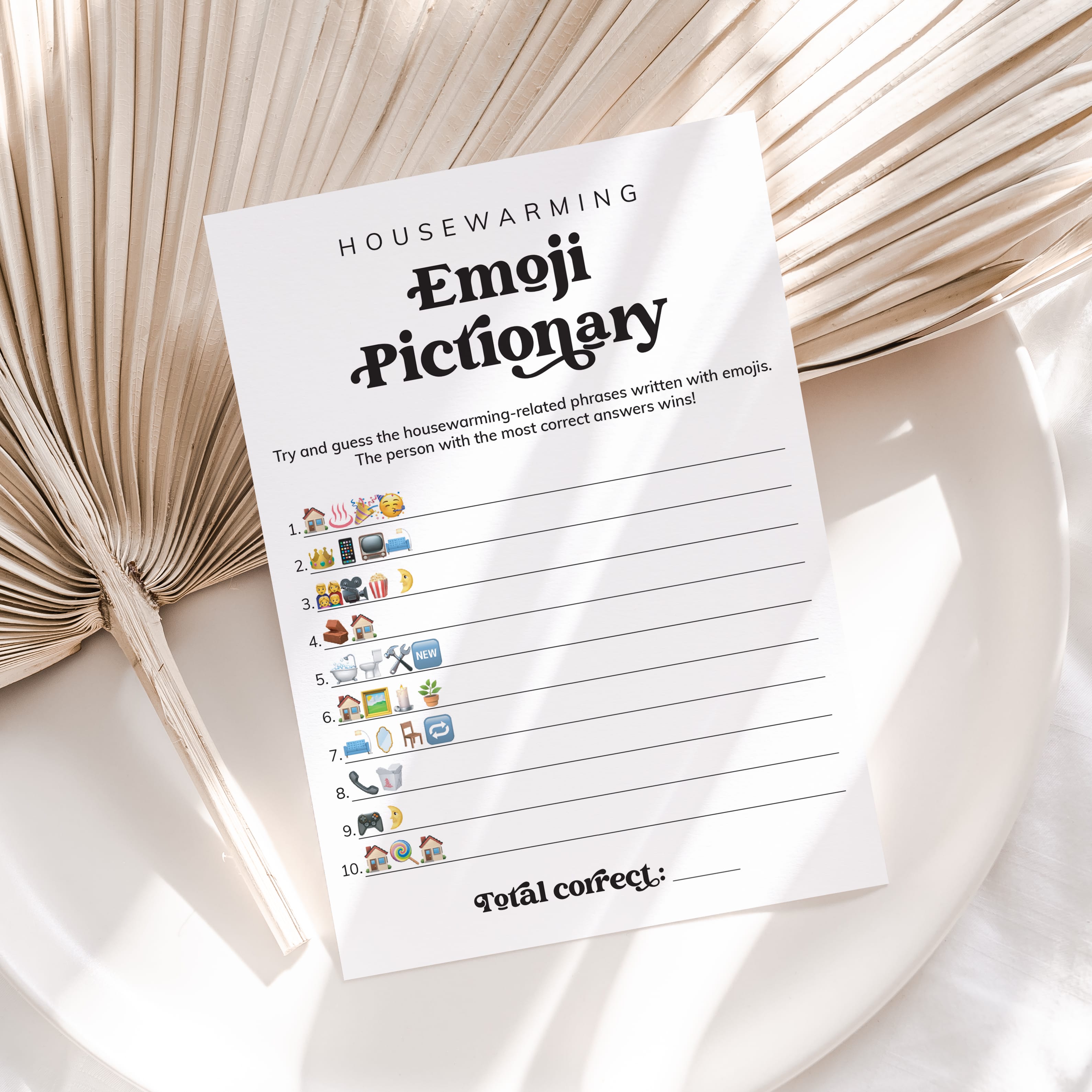 Are you looking for a fun game to play at your housewarming party? Play Emoji Pictionary! It's a great game for all ages. This black and white housewarming emoji game will fit any housewarming party theme.