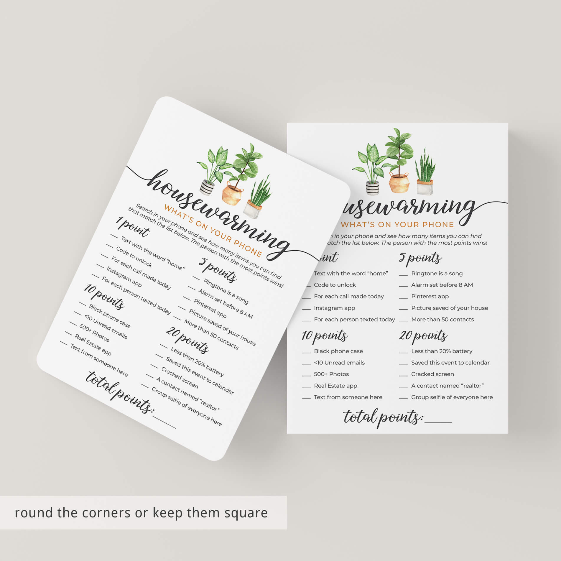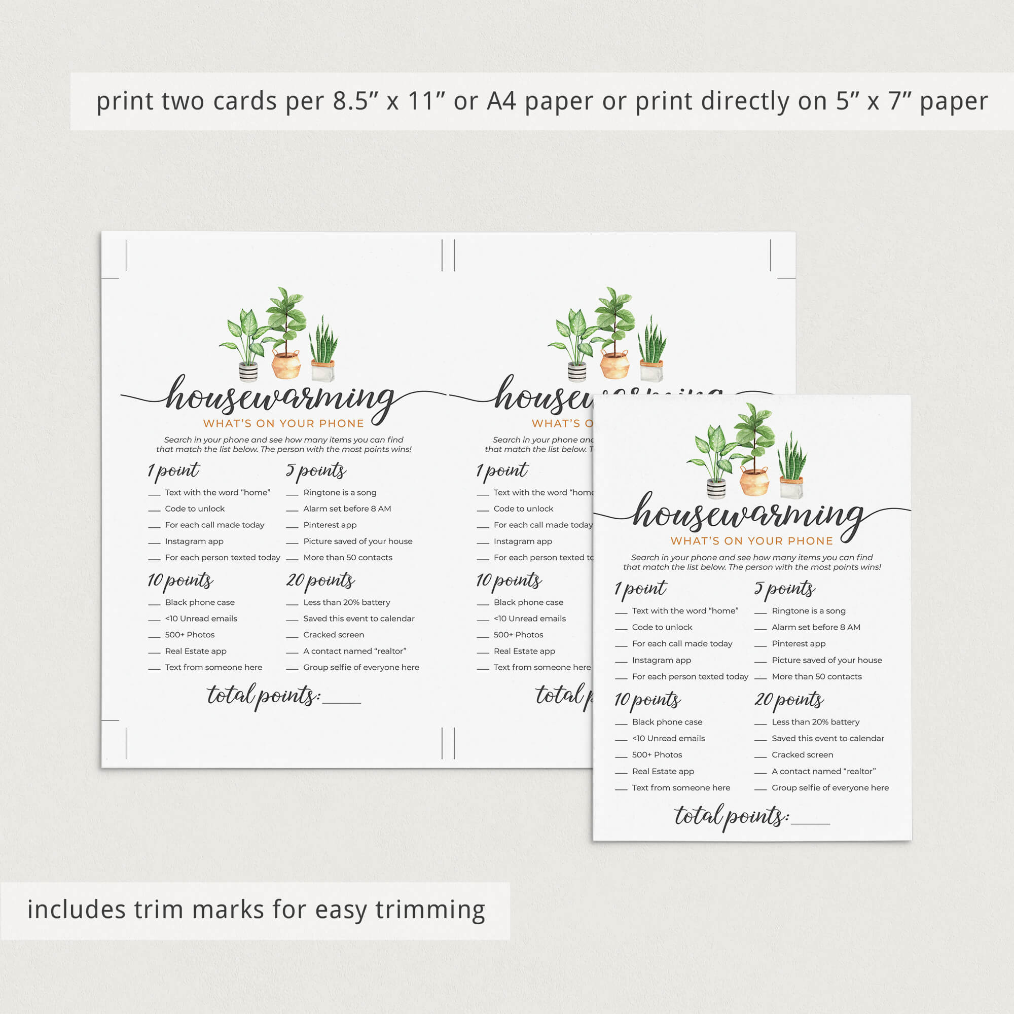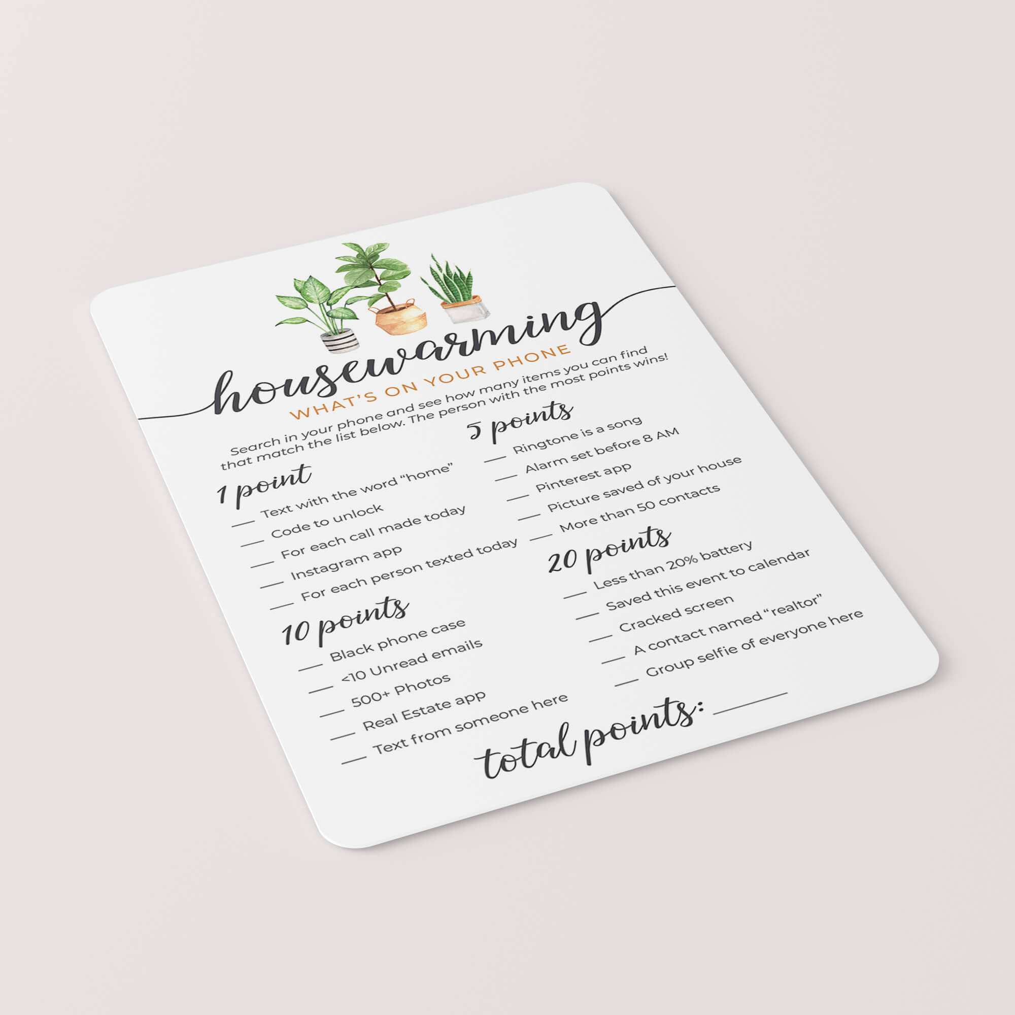 All guests need to play is a smartphone and one of these What's On Your Phone game cards with calligraphy font and watercolor house plants.