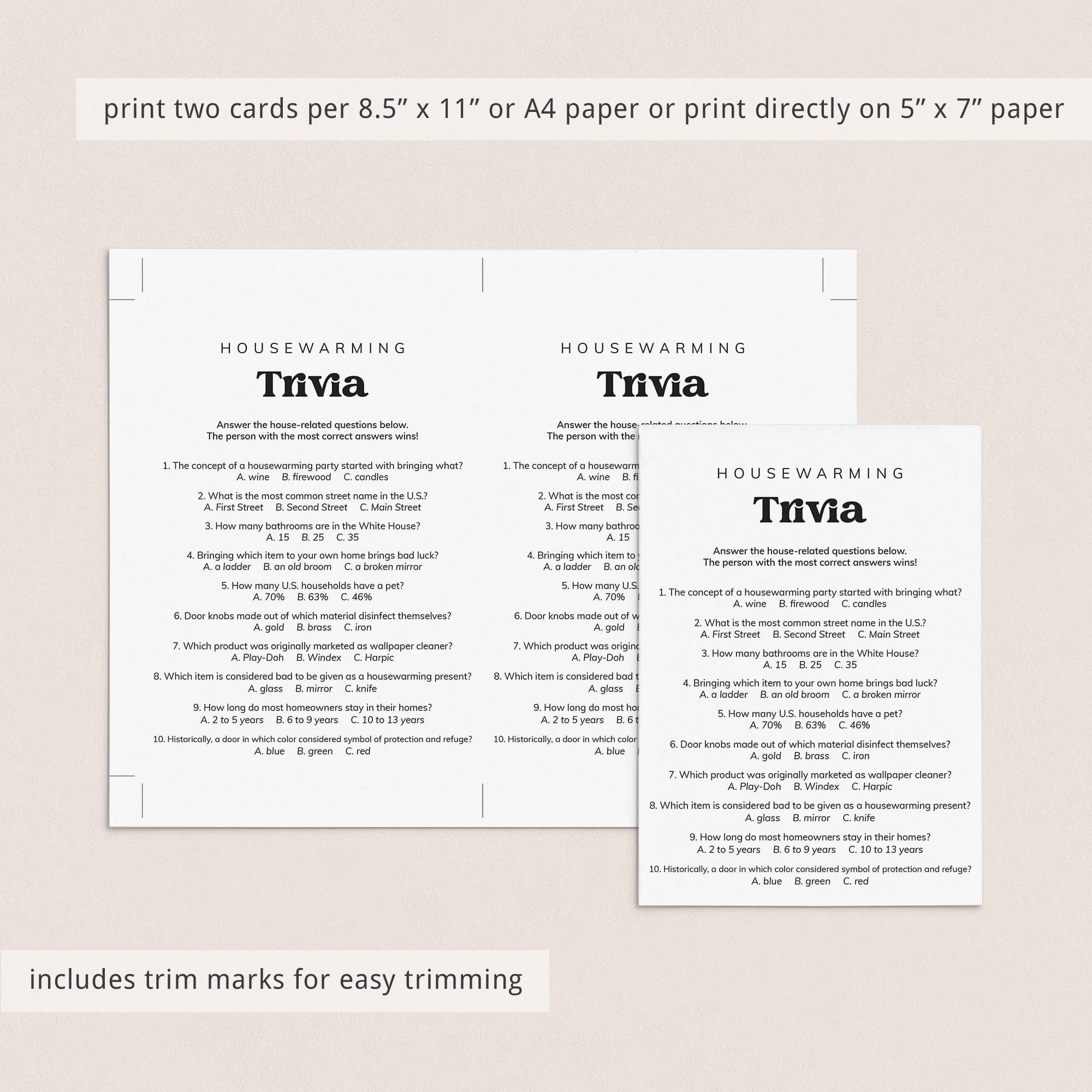 This housewarming party trivia is an instant download. After purchase you will receive a download link immediately on screen. Also within minutes of your order and payment, an e-mail will be sent to you with a link for your download.