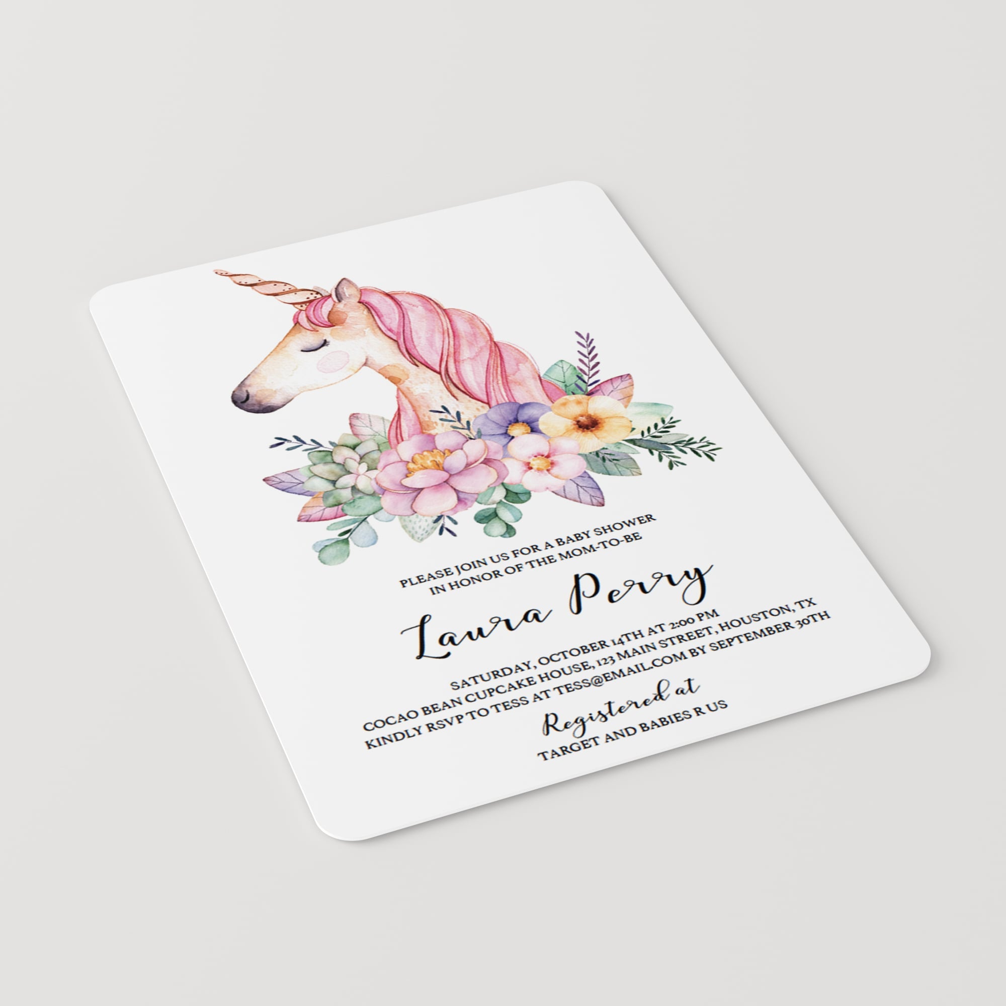 Guests will be excited when they receive this beautiful floral unicorn baby shower invitation set. The gorgeous watercolor design is perfect to celebrate the arrival of a little girl. Included in the set are the Baby Shower Invitation, a Diaper Raffle ticket and a Bring-a-Book request card.