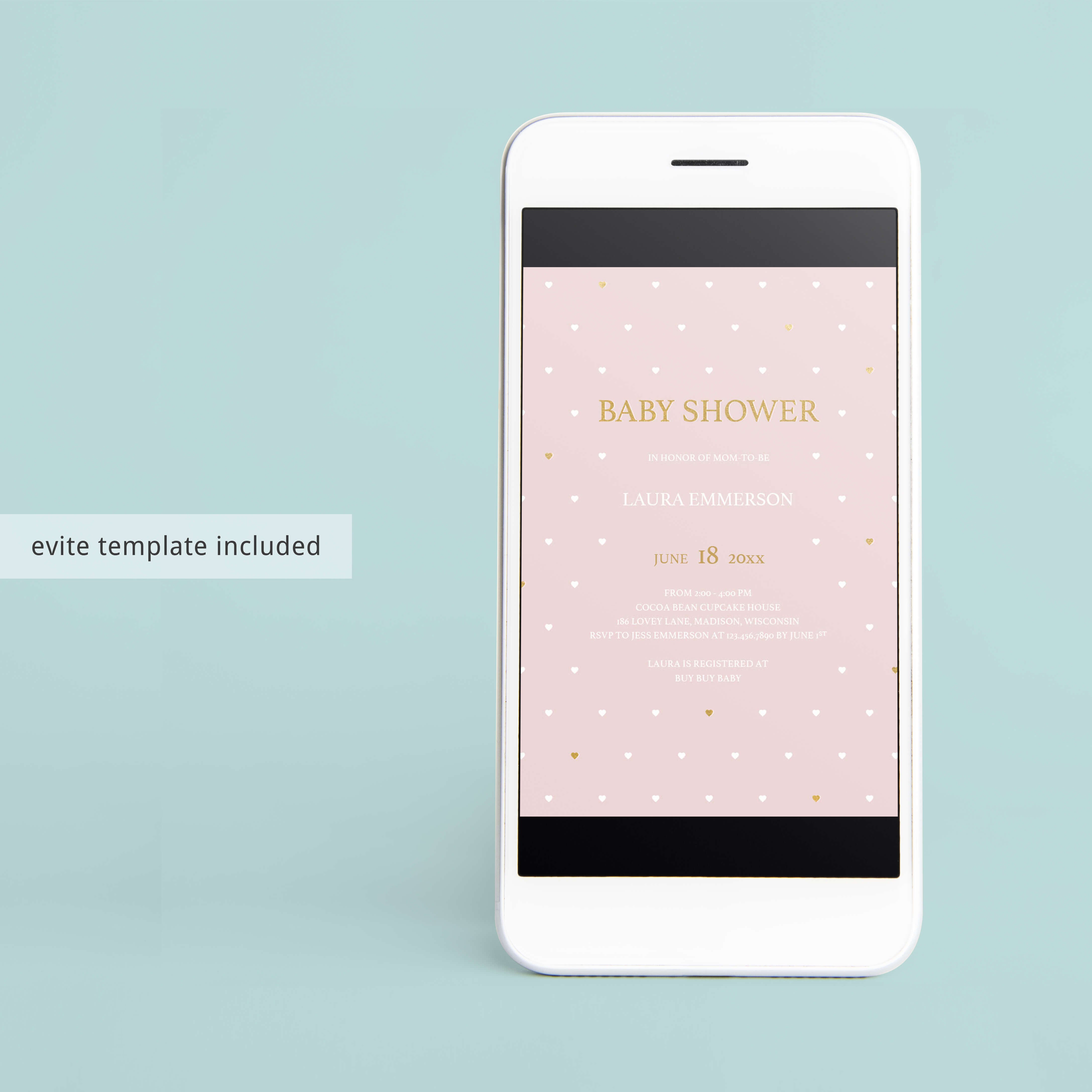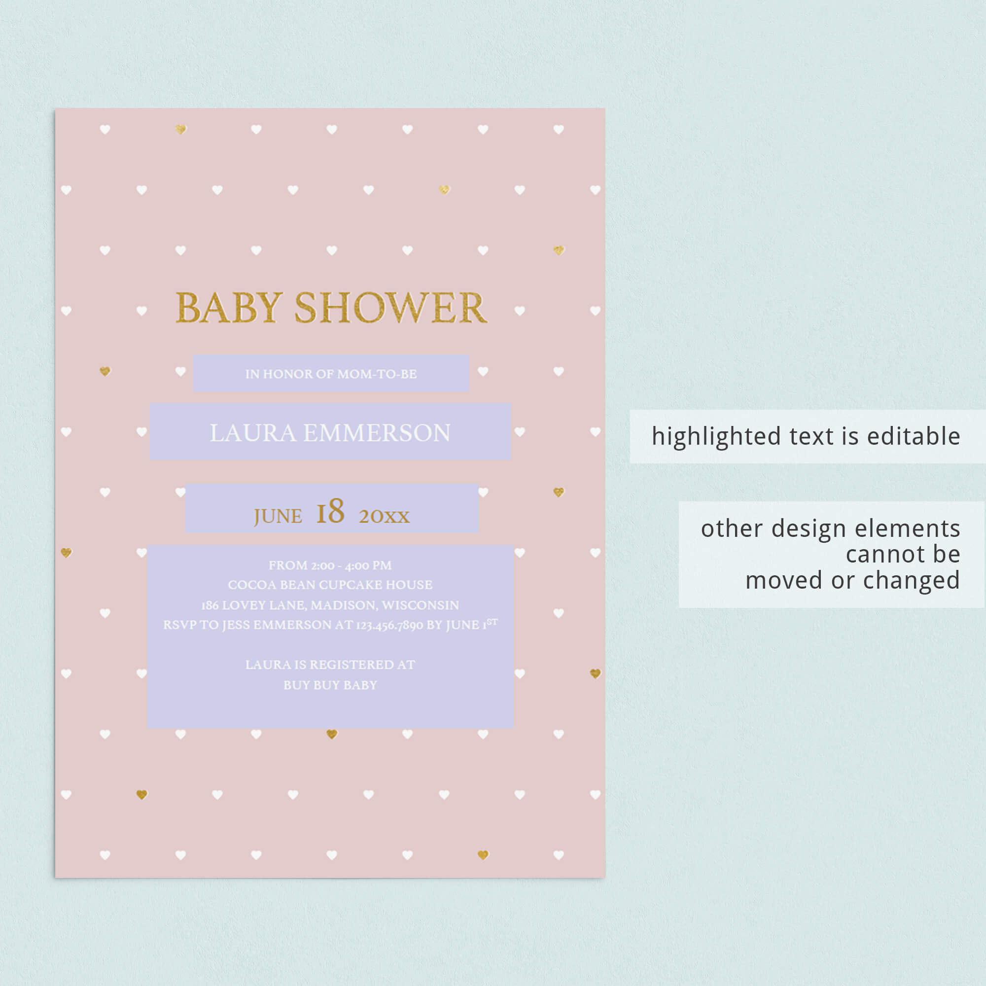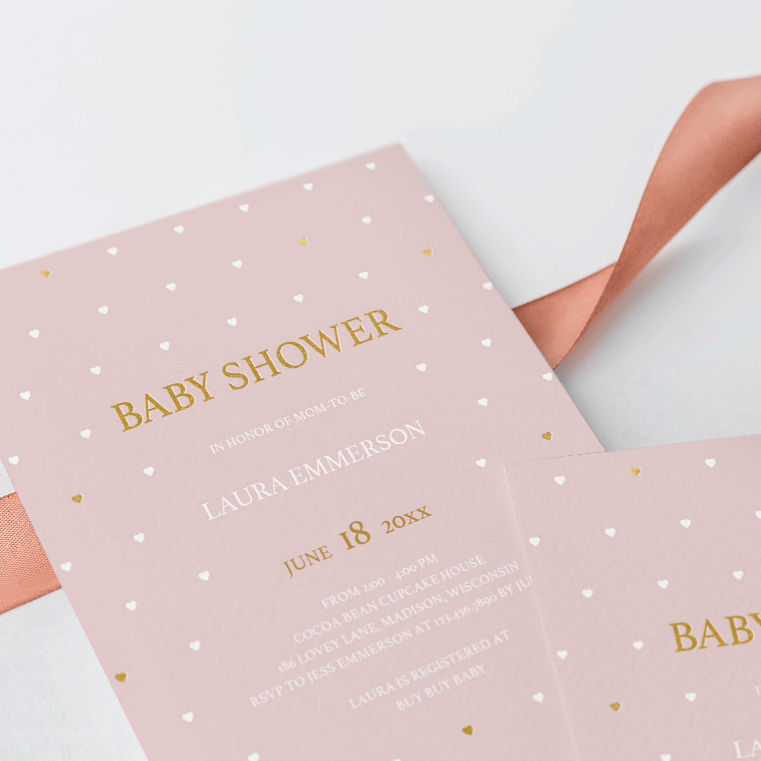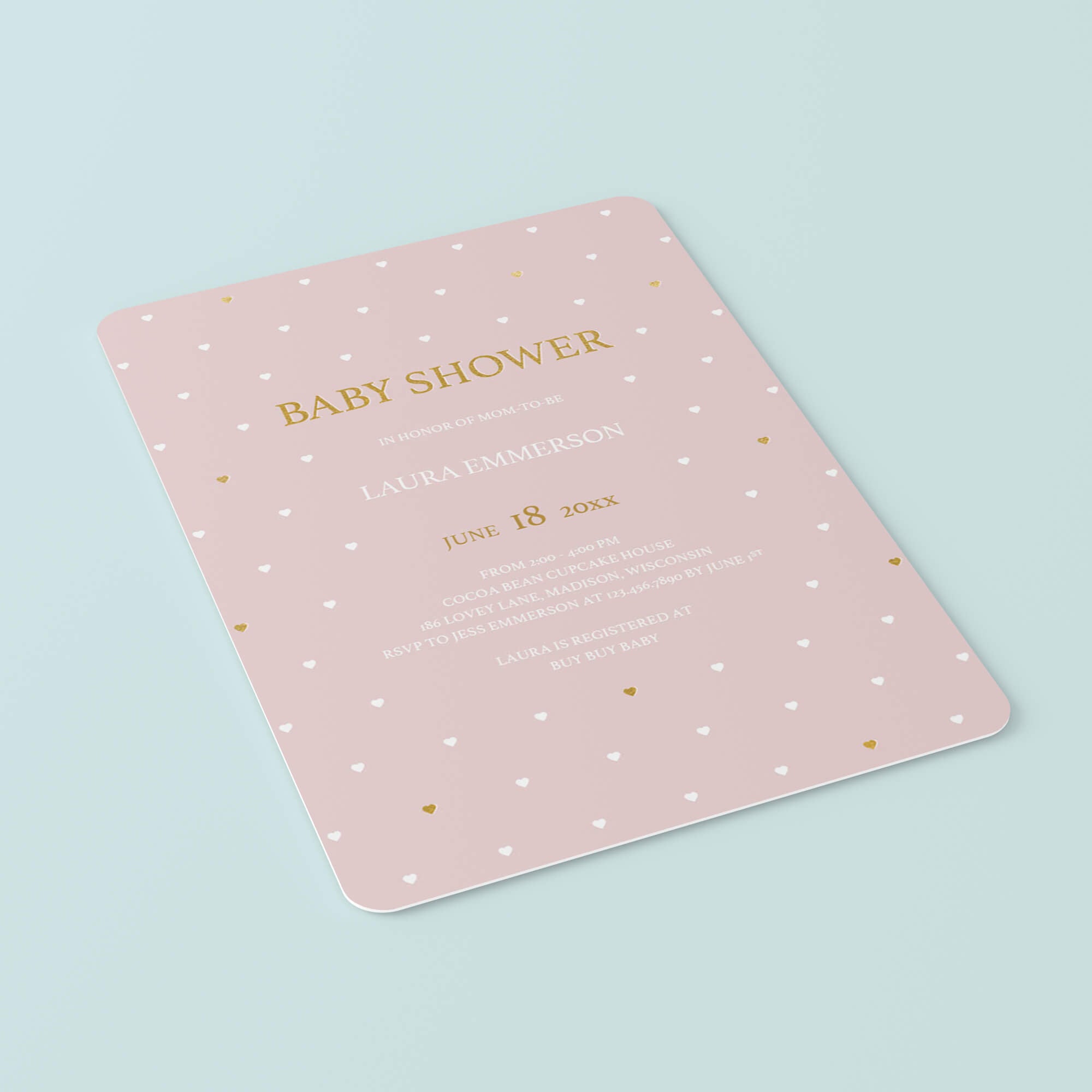 Are you hosting a baby shower to celebrate the arrival of a baby girl? Make the perfect announcement with this adorable pink invitation with little white and gold hearts. It is perfect for any girl baby shower!