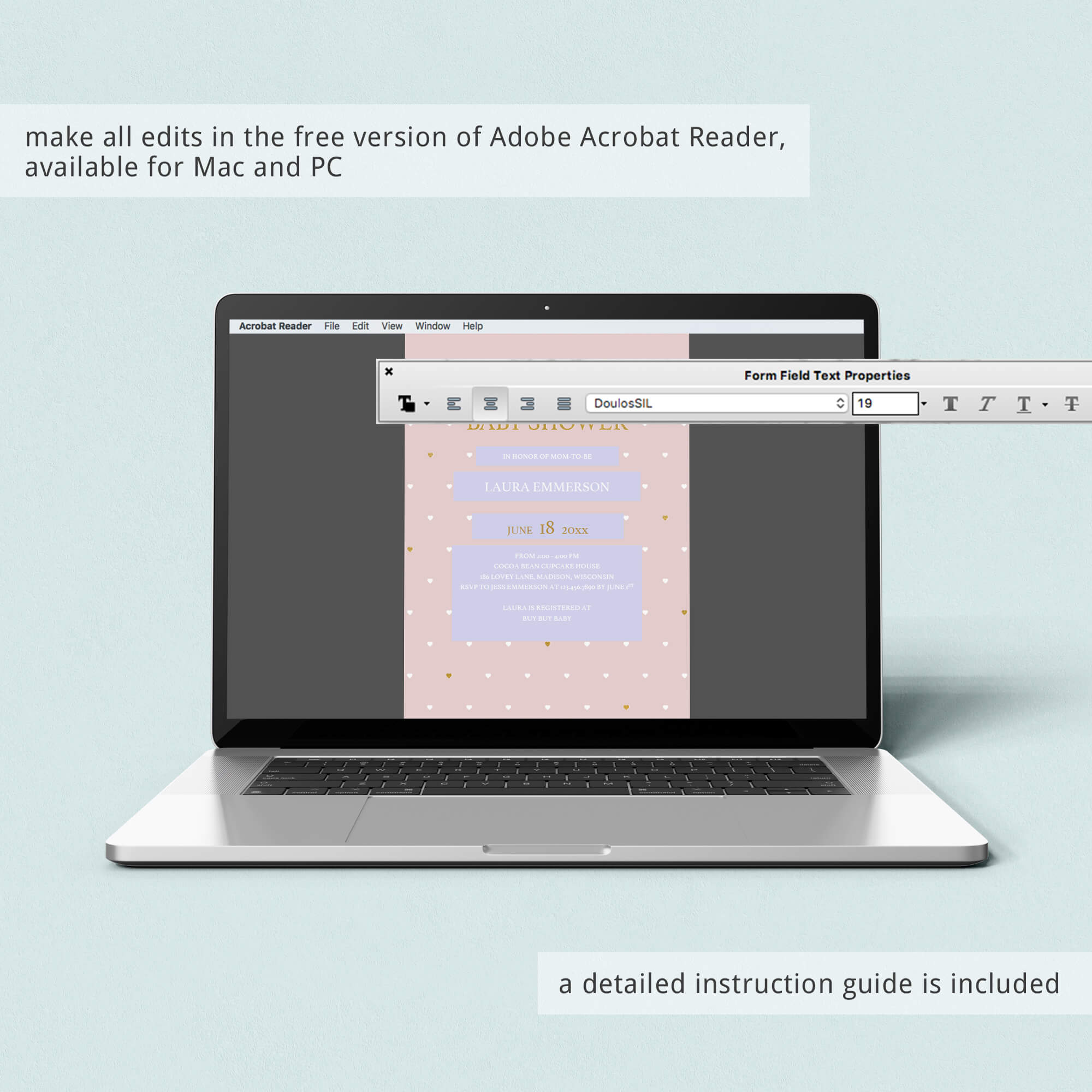 • 1 Editable PDF sized 5” x 7” to print or to use as evite