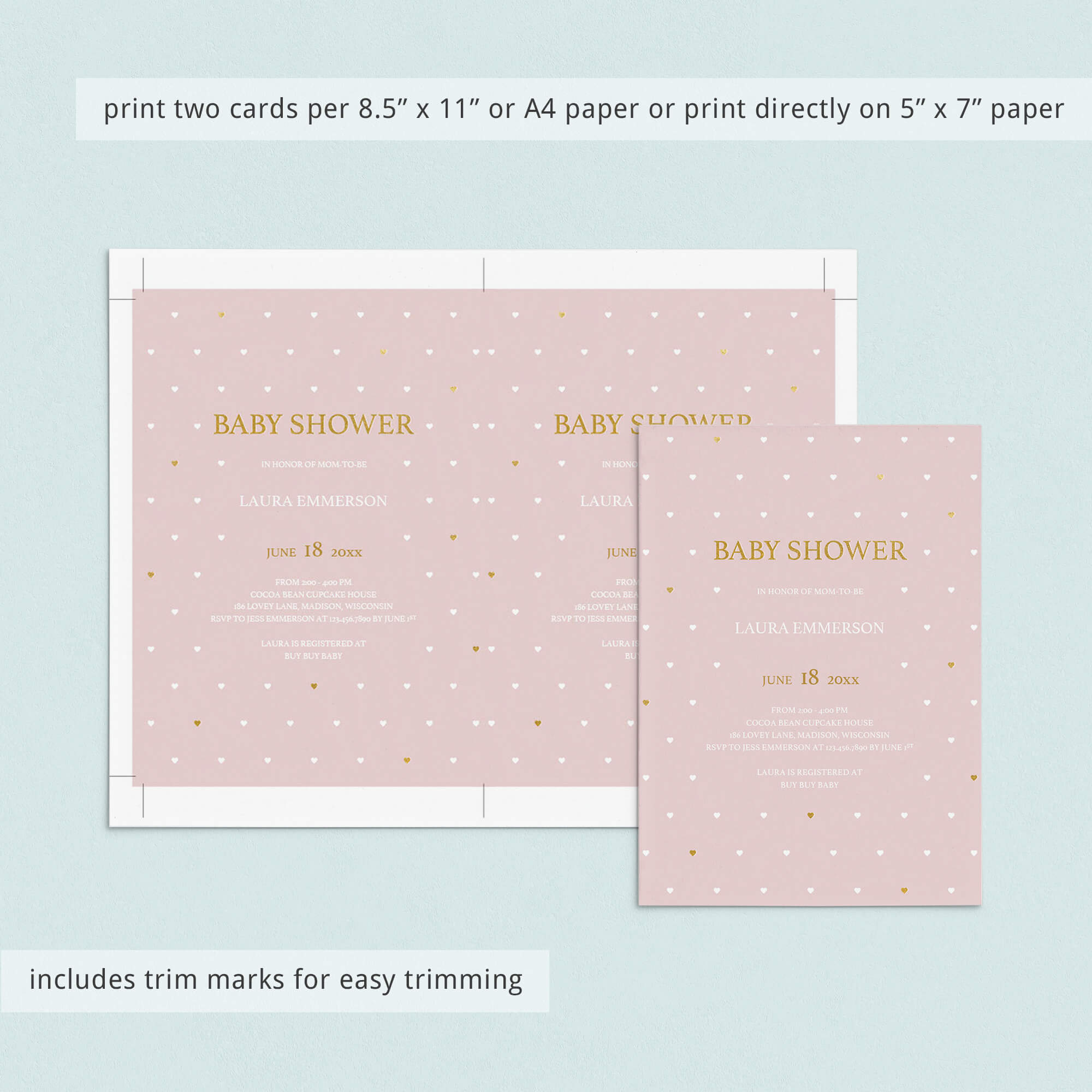 Print the invitations on any 5" x 7", A5, 8.5" x 11" or A4 paper of your choice. A heavy card stock is recommended to give it that high quality look and feel. And if you don't like the hassle of printing the invitations yourself, order them from a local or online print shop. Or you can even skip the whole printing process by using the included evite template. More than enough options to choose from, we'd say!