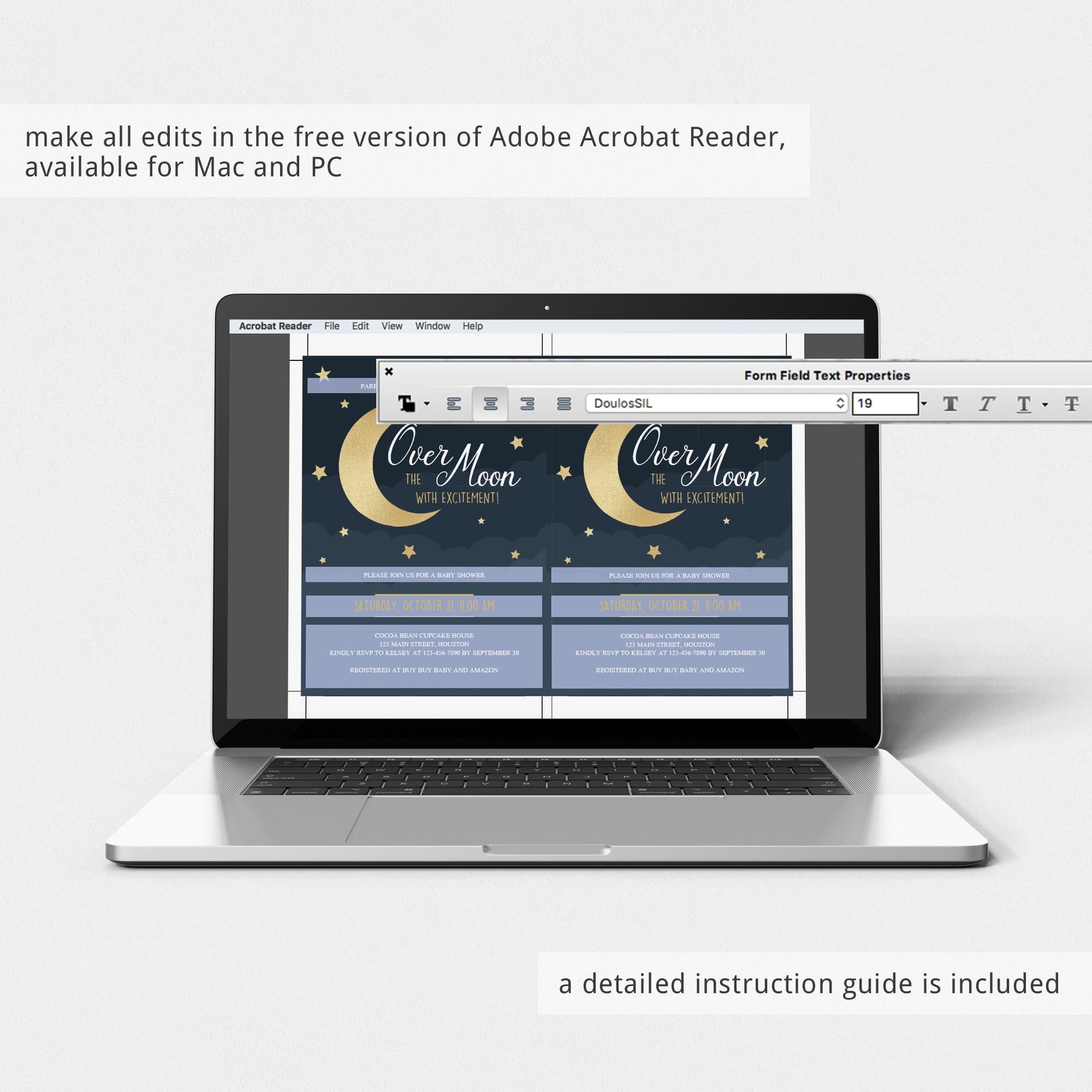 Celebrate the arrival of the little one and amaze your guests with this beautiful Over The Moon baby shower invite!
