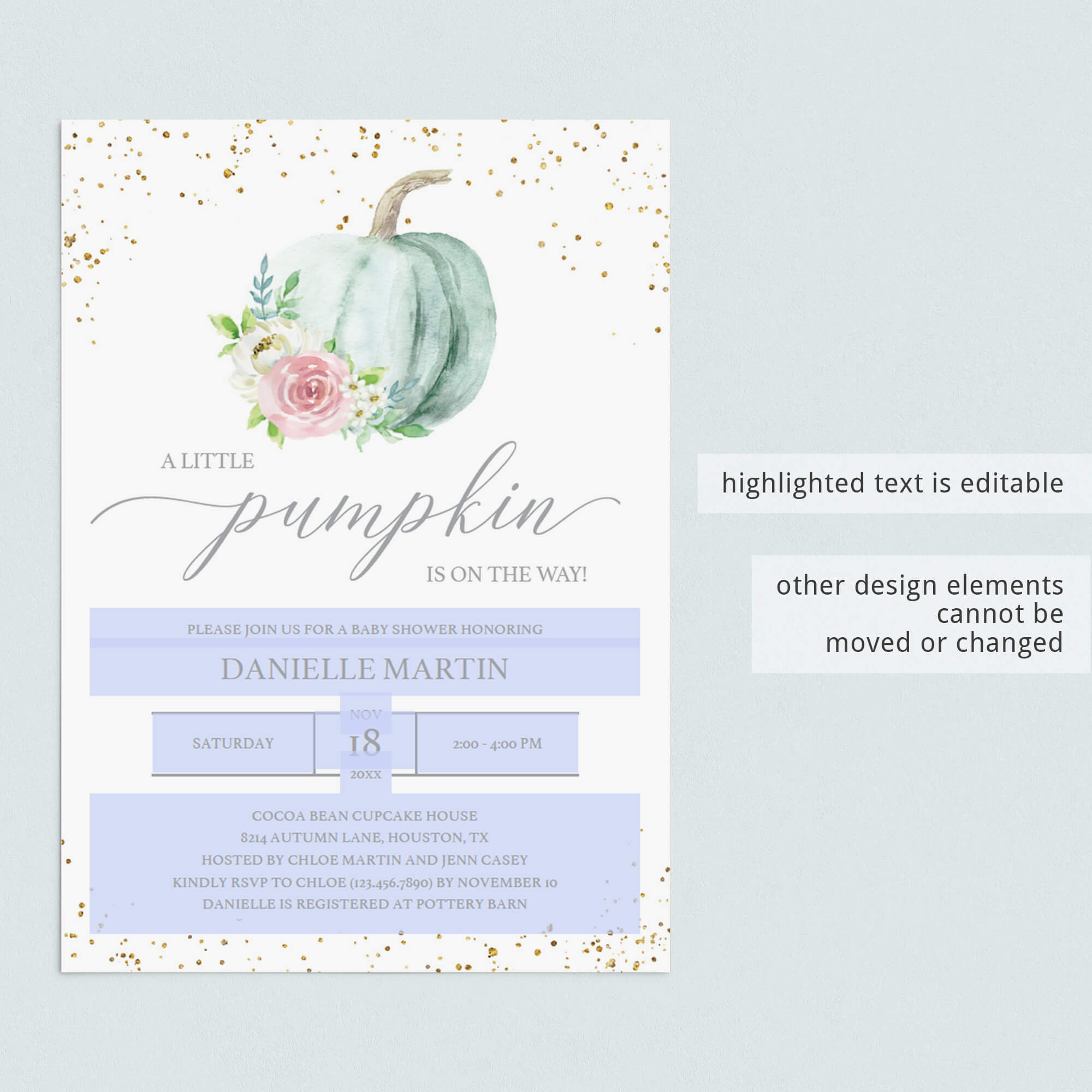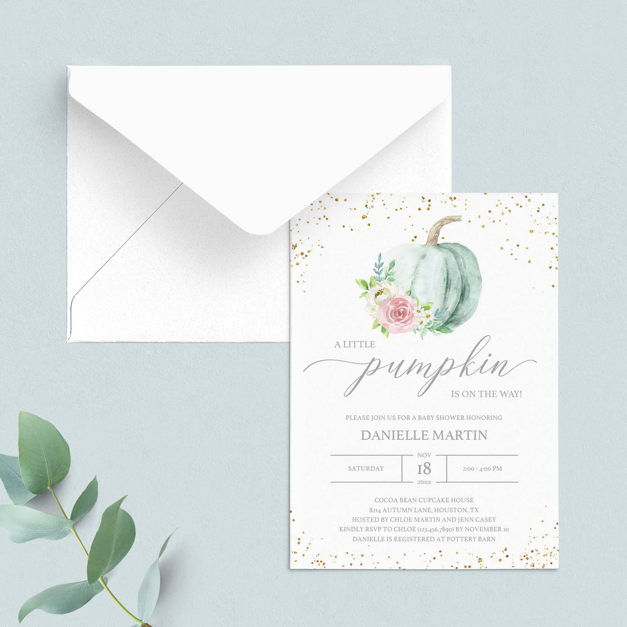 A little pumpkin on the way? Celebrate with a pumpkin themed baby shower. Invite your guests in style with this adorable little pumpkin baby shower invitation with watercolor floral pumpkin. The invite is perfect for a gender neutral baby shower.