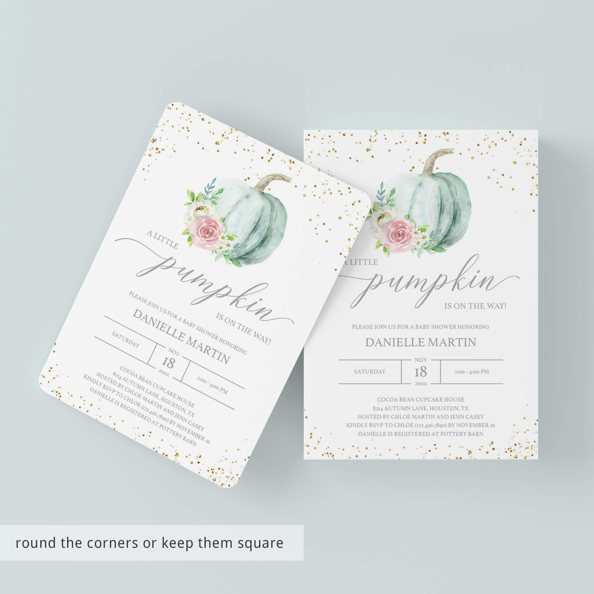 Celebrate the arrival of the little one and amaze your guests with this beautiful watercolor pumpkin baby shower invitation!