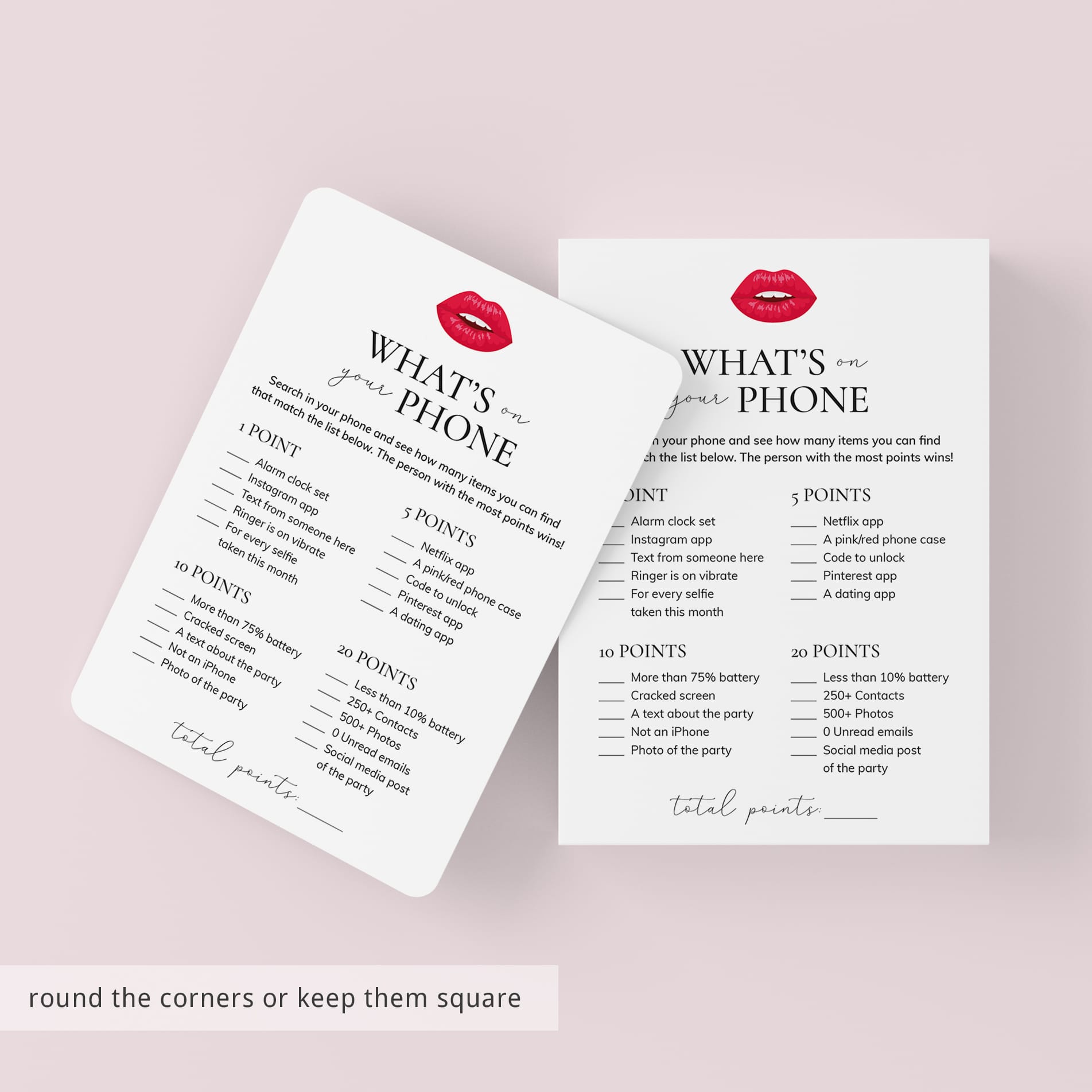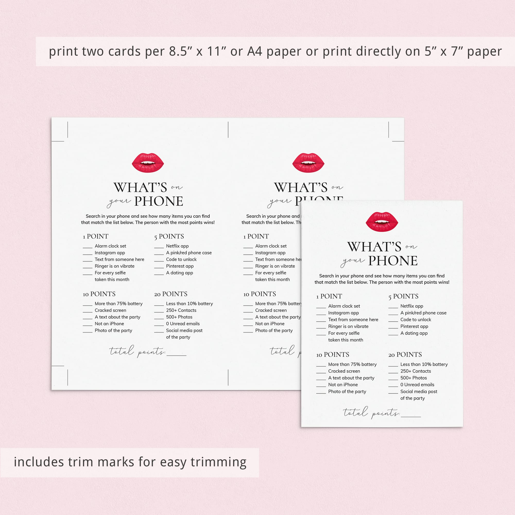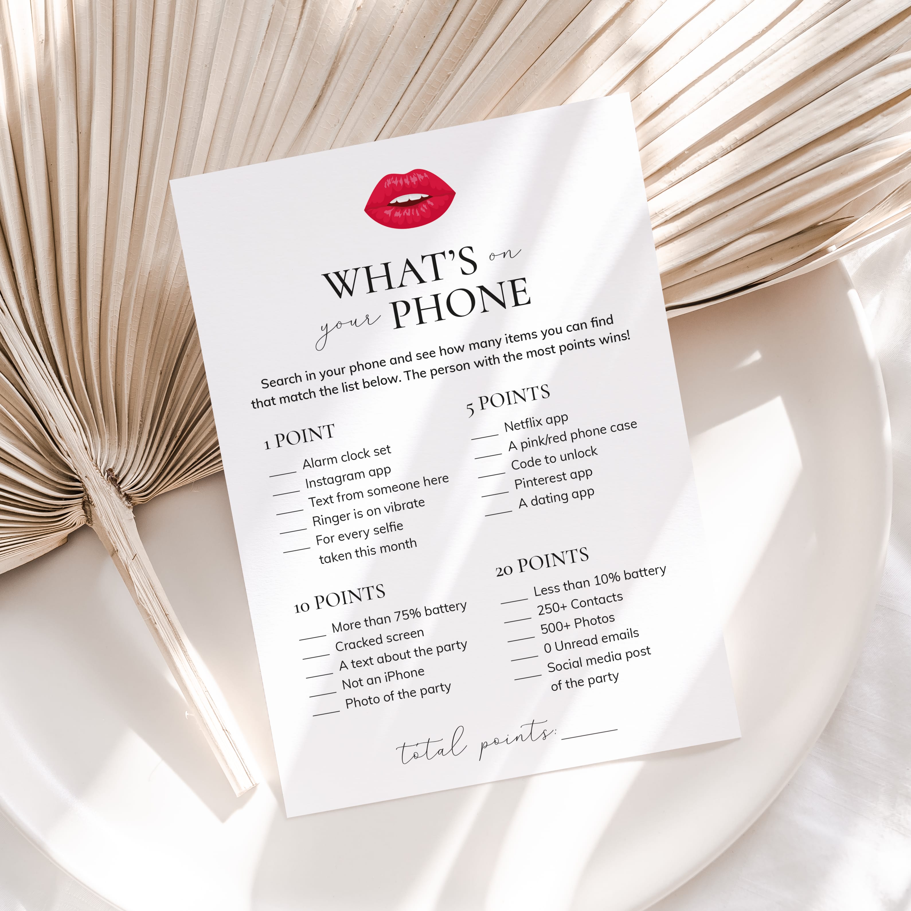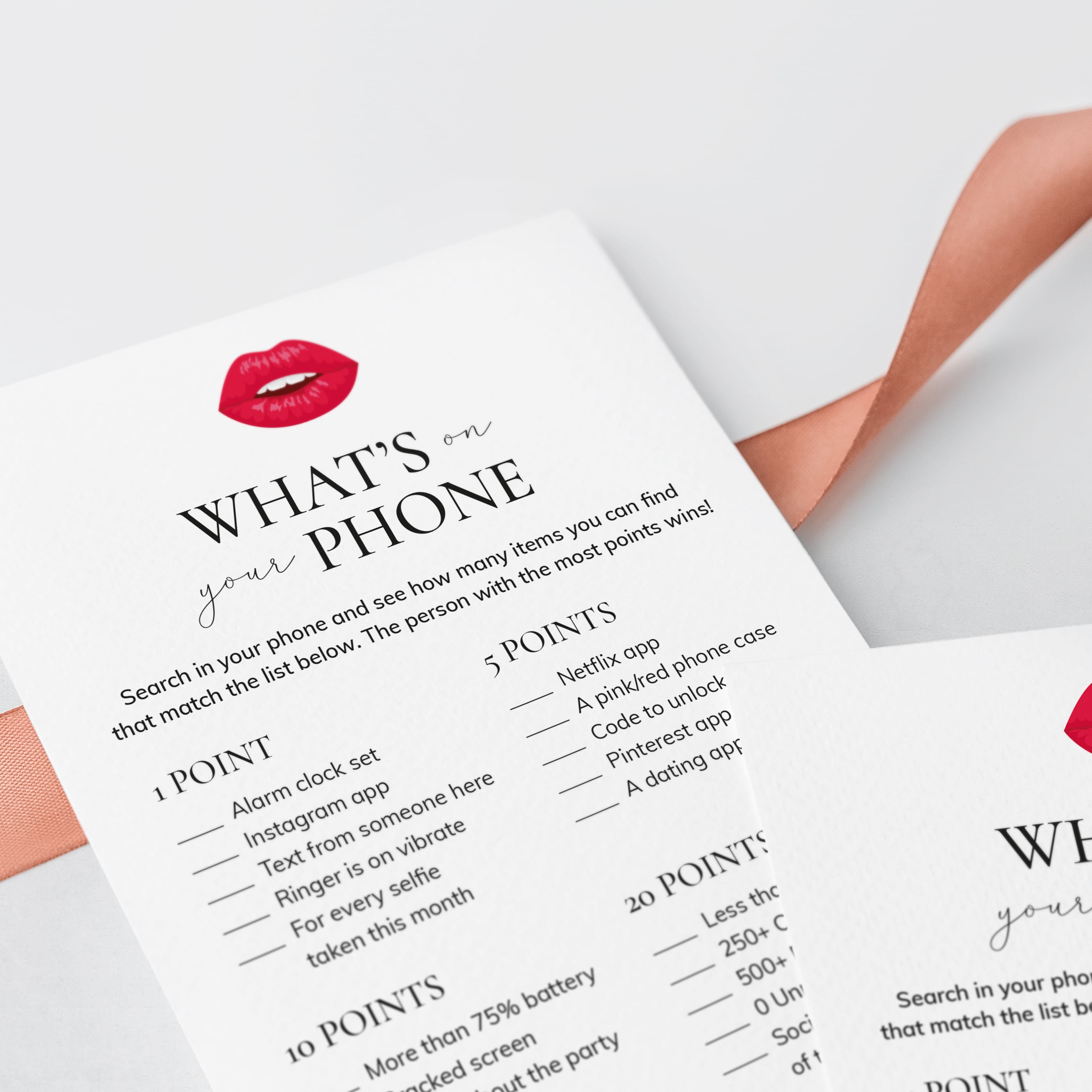 All your girls need to play is a smartphone and one of these red What's On Your Phone game cards with red lips.