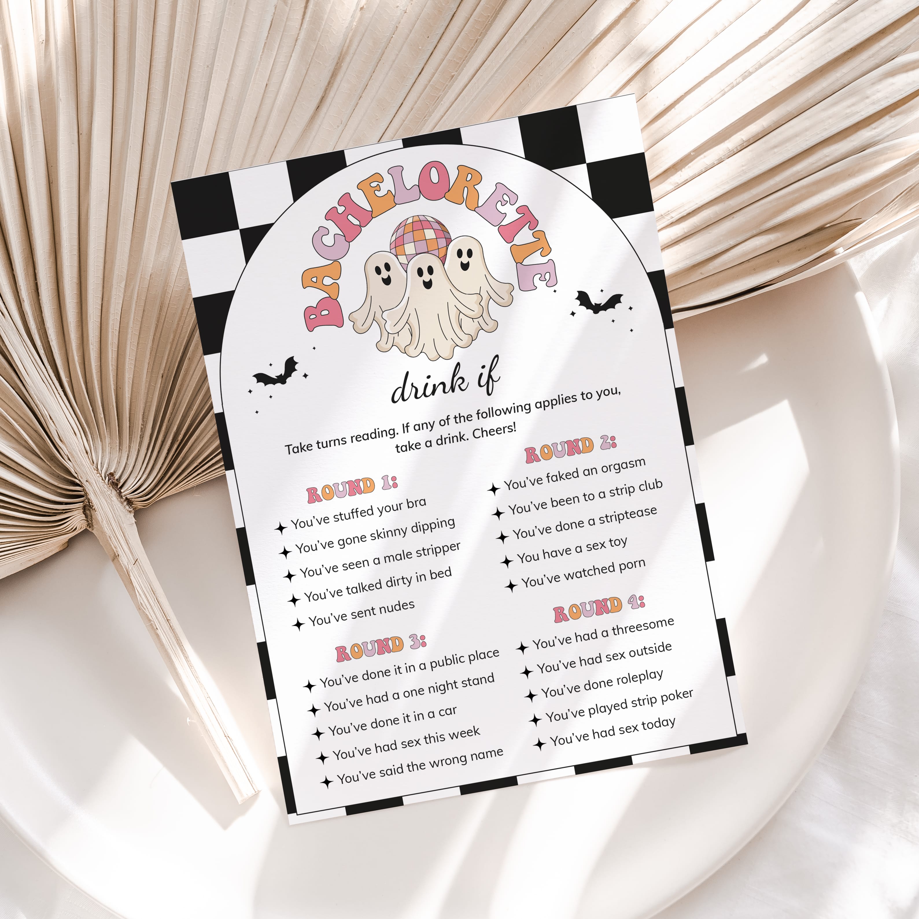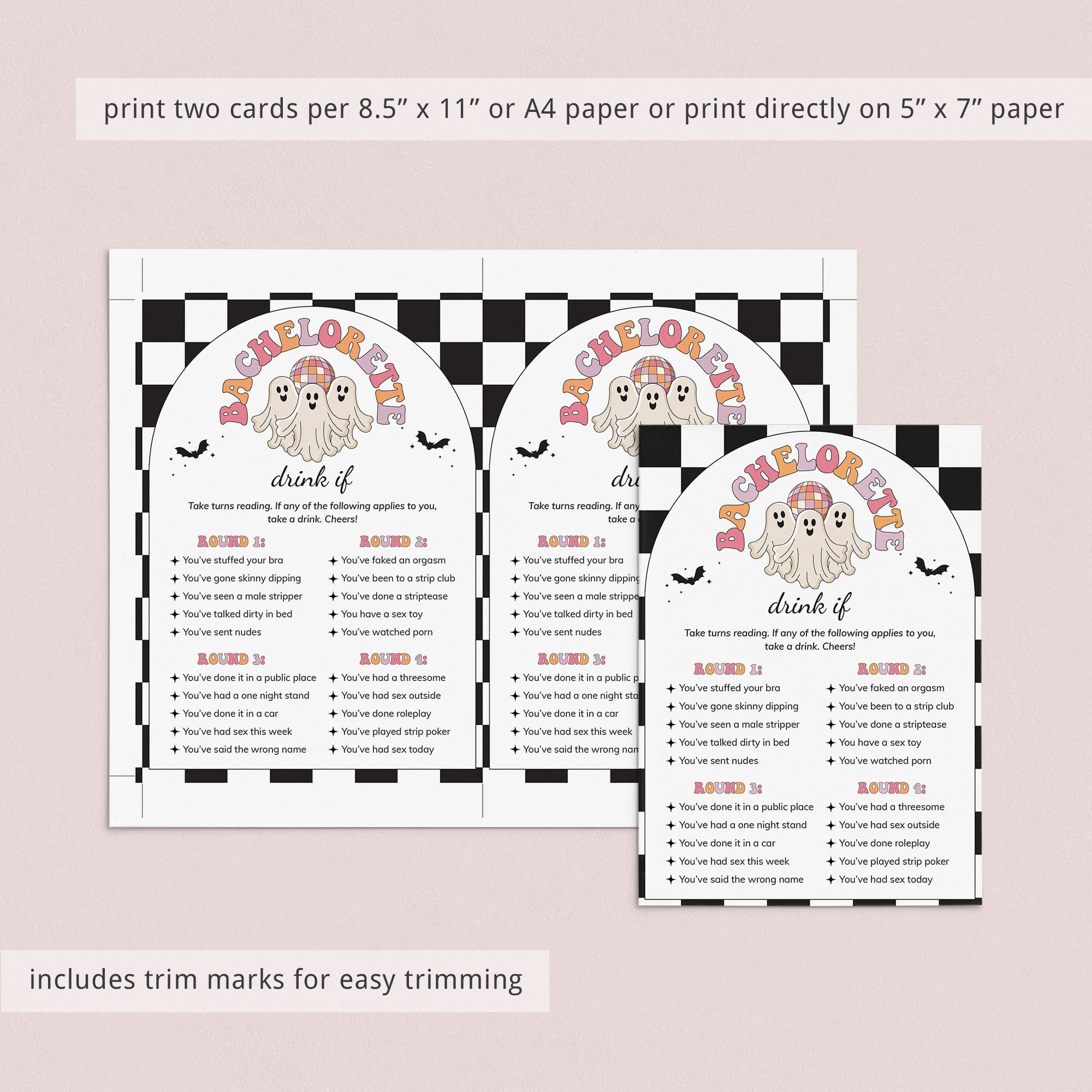 Ensure a wild party with this Let's Go Ghouls bachelorette party Drink If Game! Print the game, bring to your event, pour drinks all around and get ready to bare all to your friends as you run through the rounds.