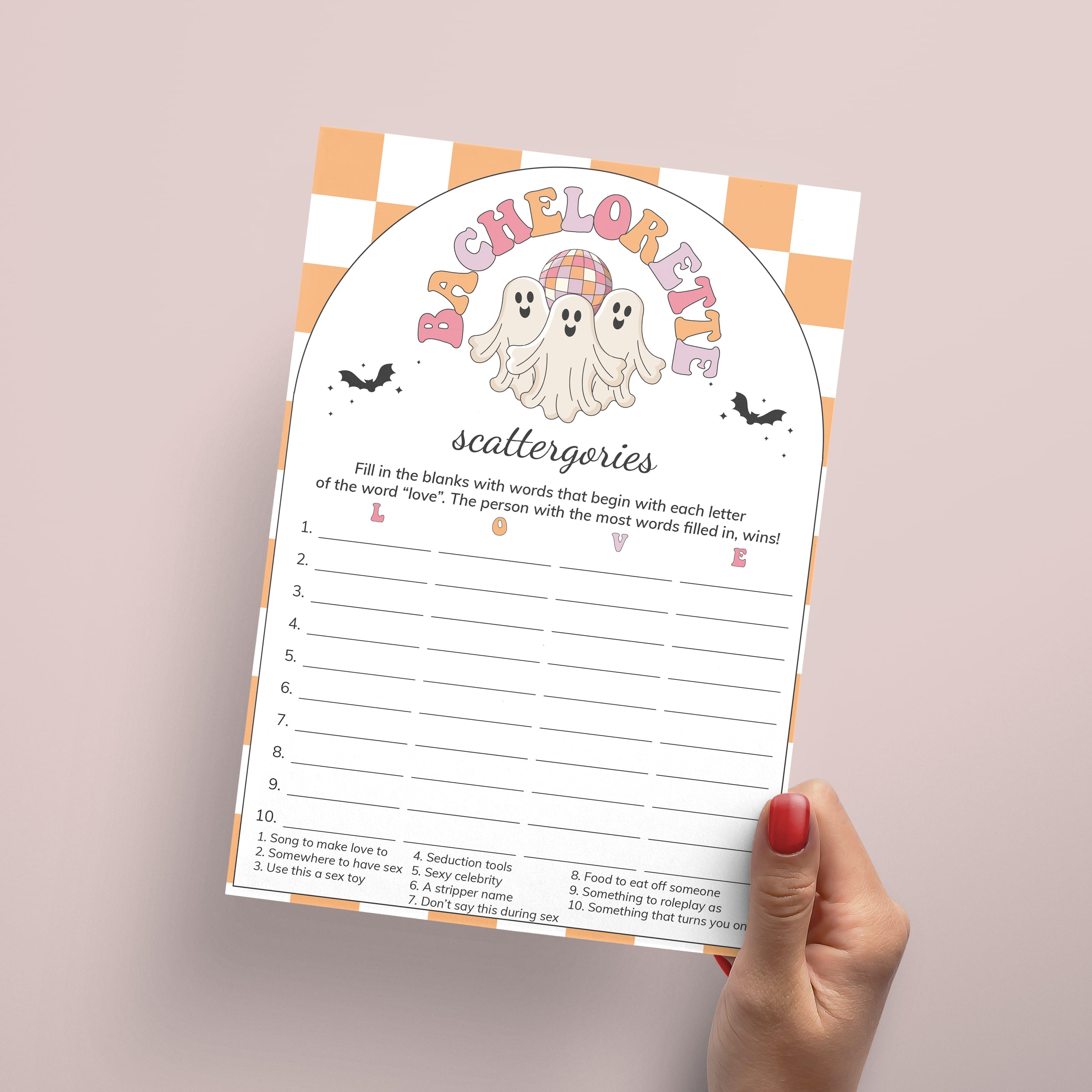 How many words can you fill in with the letters "L", "O", "V" and "E"? Play Dirty Scattergories at your spooky bachelorette party to ensure lots of fun and laughter. This retro 70s theme Scattergories game with cute ghosts  is the perfect addition to your Let's Go Ghouls bachelorette party, Halloween hen night or She Found Her Boo bridal shower