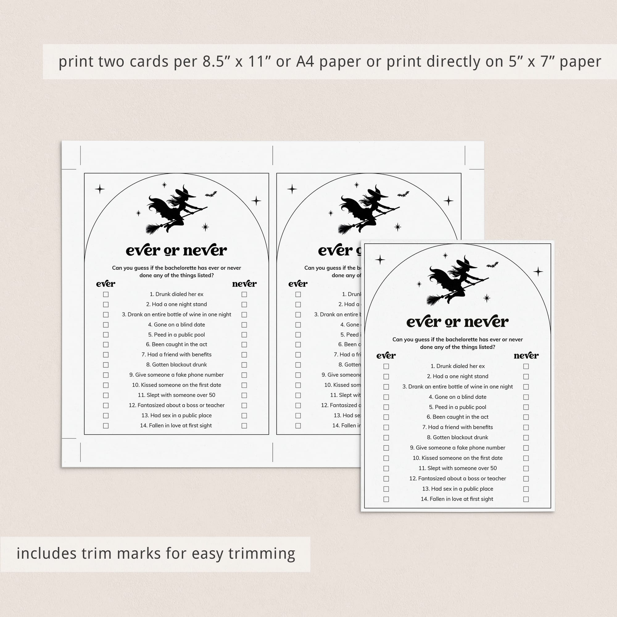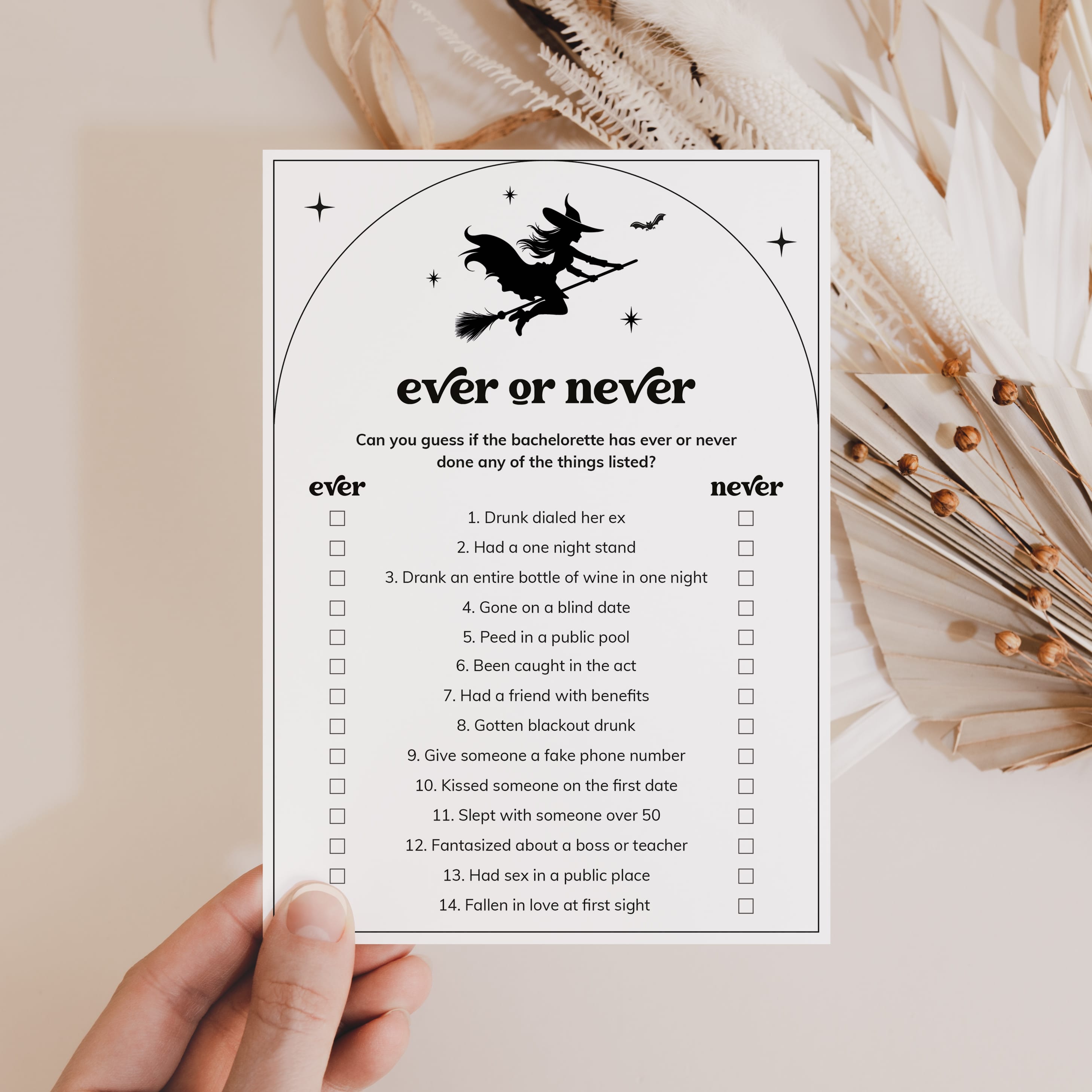 Have the bachelorette fill out this Ever or Never game card with black witch on a broomstick as an answer key before the party starts. Then compare her responses to what your girlfriends guessed. The player with the most correct wins bragging rights.